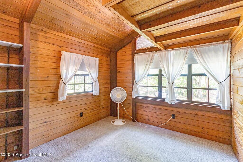 See this great new price in time for the NEW YEAR ...this 3 acre property with 2 stall barn and fenced pasture for horses and beautifully wooded lot on north Merritt Island. You will enjoy the peace and quiet. This flag lot property boasts spacious 3 bedroom 2.5 bath home with 2 car garage. Large downstairs living area with vaulted ceilings, fireplace with oak wood walls and high beams make you feel you truly are living in the woods. Kitchen features oak cabinets with granite countertops. Den/office off the kitchen could function as 4th bedroom. Interior laundry. Upstairs master has large windows for lots of light and a fireplace for those cool nights. Large screen porch looks out to the horse pasture. 2 stall horse barn with electric and fans. Large fenced pasture. Roof approximately 3 years old, water heater 4 and septic replaced in 2007. Stop and see this property today!!