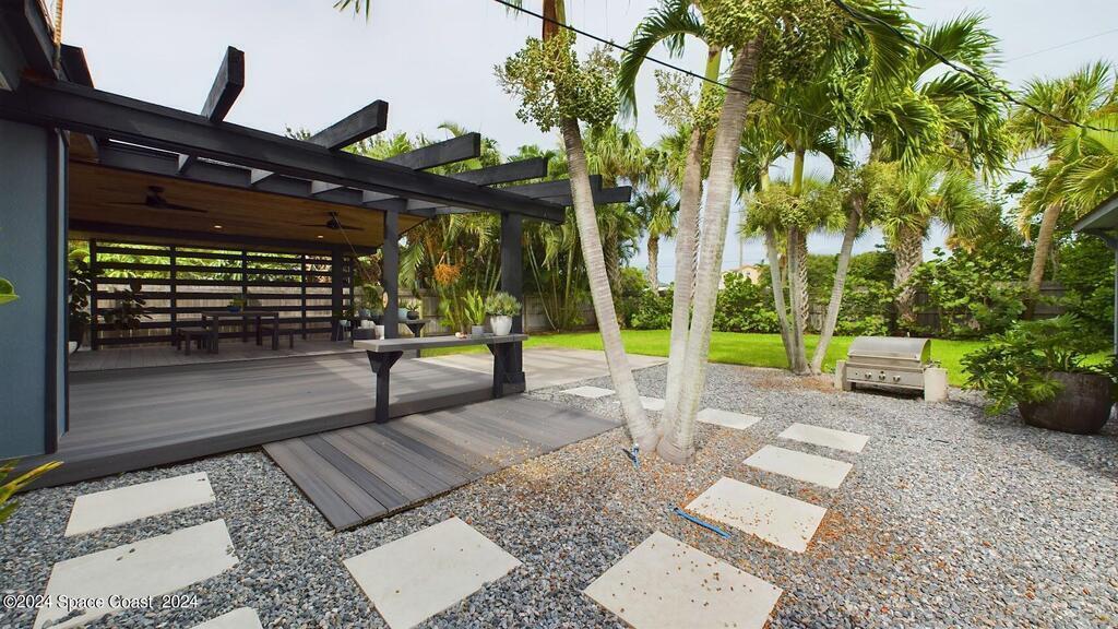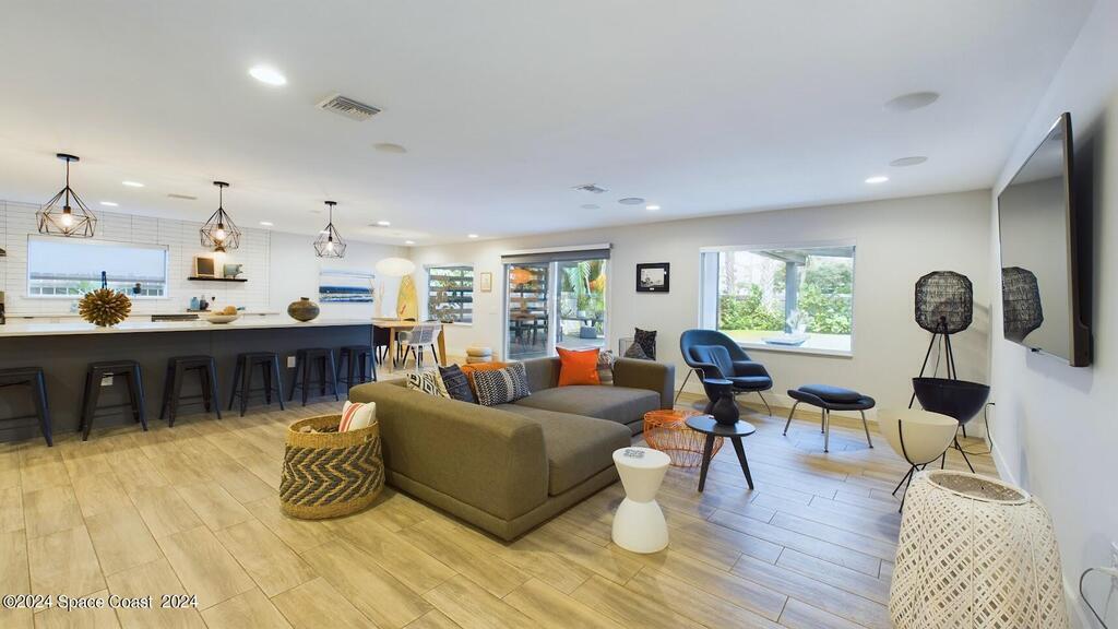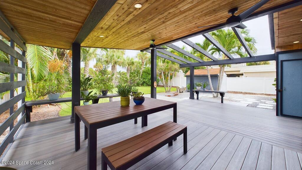 Have you been dreaming of a fabulous beachside rental home? Look No Further! This beautifully renovated fully furnished home is located in the tranquil community of Snug Harbor. This home is PET FRIENDLY! Spend the day surfing or hanging out on the beach. Come home and cook out on the charming lanai while enjoying ocean breezes. You will enjoy the large back yard, the convenience to shopping, restaurants and downtown Cocoa Beach. There is a spacious open floor plan with a tastefully updated kitchen and new appliances. The living area provides plenty of room for relaxing on the sofa with a book or enjoying the big TV with awesome surround sound. Primary bath has just been renovated.