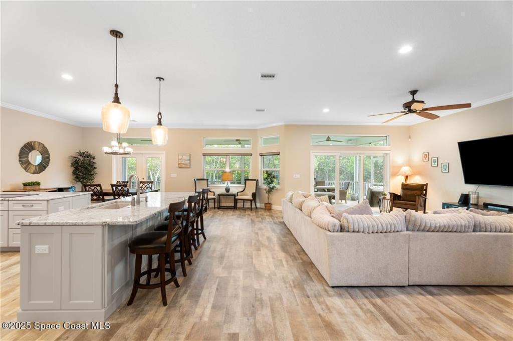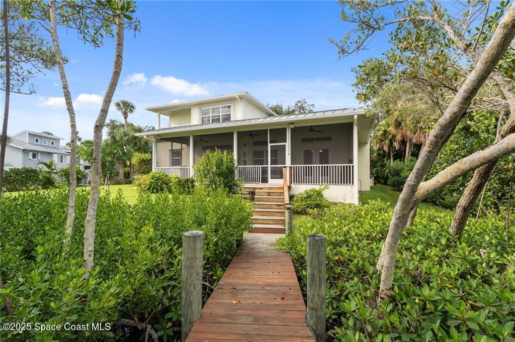 WATERFRONT! Incomparable value! Stately oak-canopied lane leads to this reimagined 4BD modern design of functionality, easy living, water + nature lover's paradise. Absolute privacy to enjoy magical sunsets, dock with ample access for fishing, kayaking, jet skiing, manatee/otter/dolphin sightings. Solid construction, impact windows, metal roof, oversized garage, lavish maple & iron staircase, sumptuous new primary suite with ultra-luxurious bath, 2 whimsical porches, highly elevated lot. Prime location near beaches & Sebastian Inlet. Non-deed restricted. No HOA. Phenomenal Airbnb potential.
