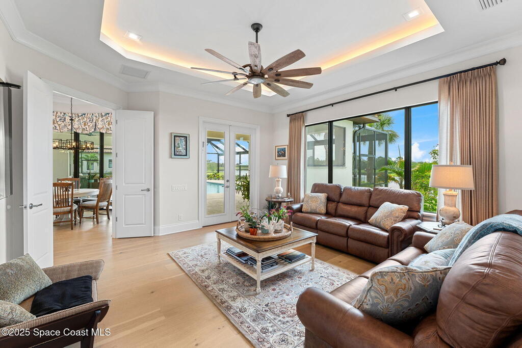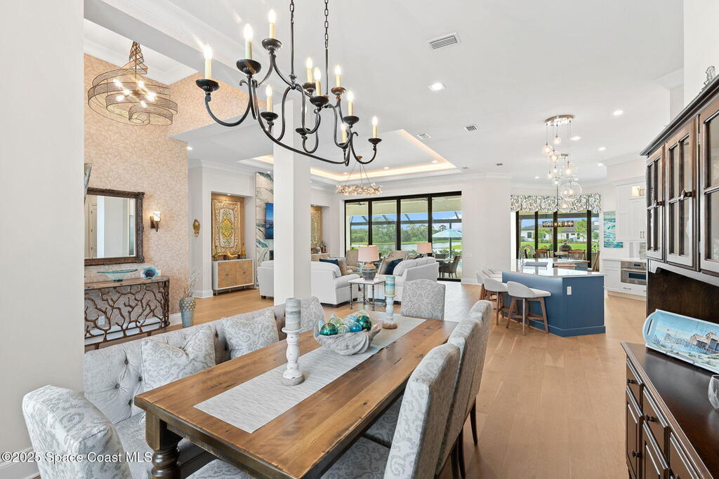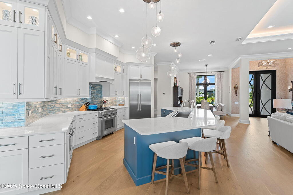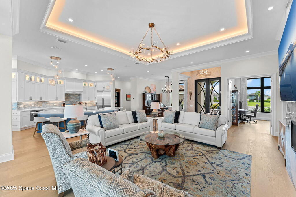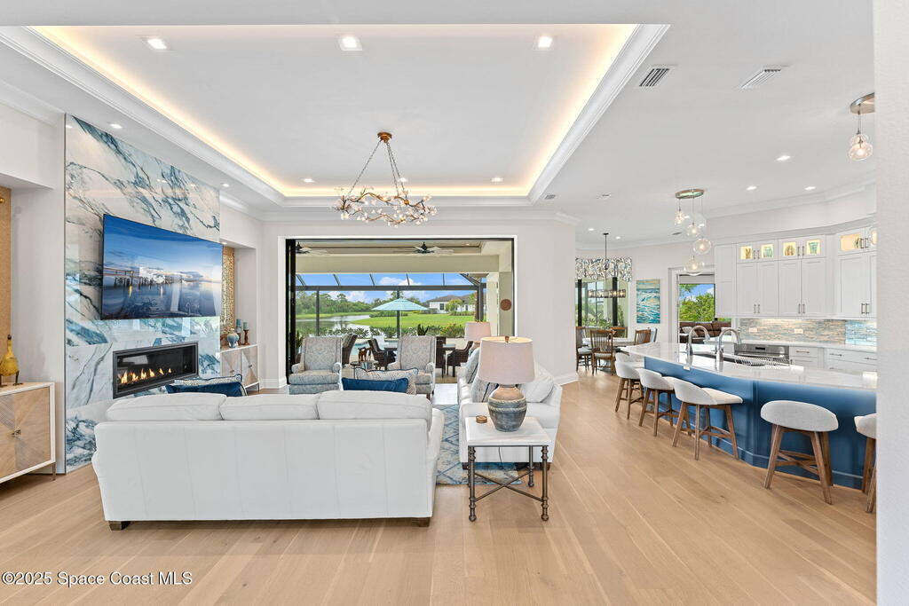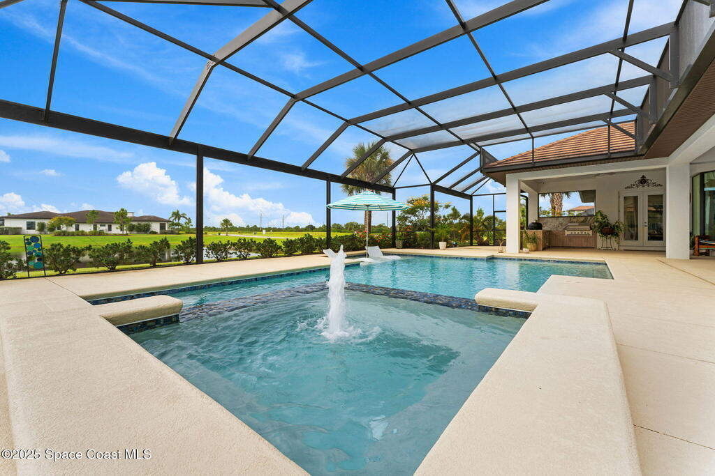 Accepting Backups!! Grand scale & resort living combine in this 4,222 sq ft custom home on a .70-acre corner lot with breathtaking lake & preserve views. A dramatic 14' foyer with iron double doors opens to oak hardwood floors, soaring ceilings, & walls of glass. The kitchen is a culinary showpiece--quartz counters, custom white cabinetry, Thermador appliances, 6-burner gas range, oversized pantry with coffee bar, & a 52'' stainless sink with dual faucets. Each bedroom offers a private en suite, while the primary suite stuns with dual custom closets & tray ceiling. Living areas center on a porcelain gas fireplace & flexible spaces designed for entertaining or retreat. Step outside to a private paradise: heated saltwater pool, spa, wood-planked lanai, summer kitchen, natural-gas firepit, & picture-panel screening that frames the view. Two oversized 2-car garages, whole-house generator, advanced water systems, & lush landscaping complete this luxury statement.