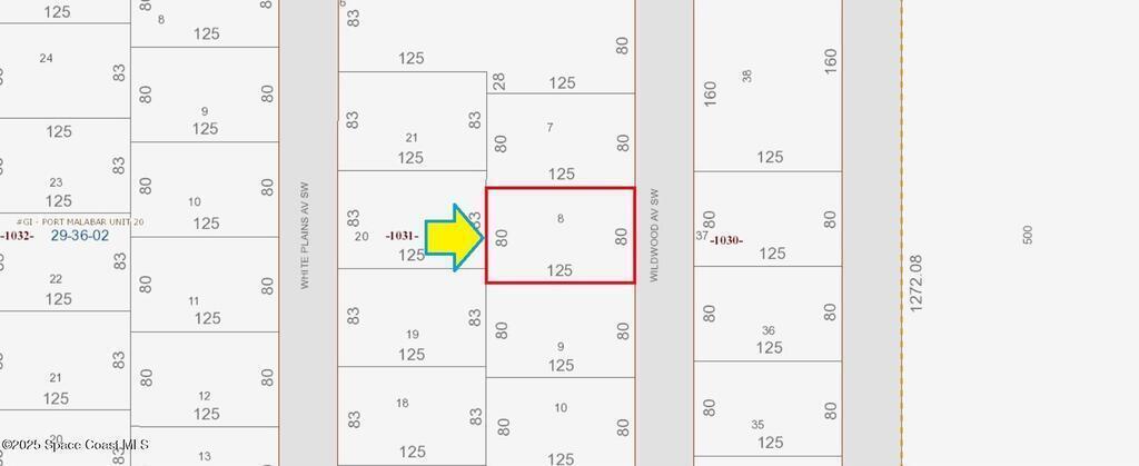 The 0.23 acre buildable residential lot is available in Port Malabar Unit 20 of Palm Bay. Located in the southwest section, this lot is just .4 miles - 2 minutes to Jupiter Elementary School, 2.7 miles - 7 minutes to the Winn Dixie Supermarket, 12.4 miles - 26 minutes to Melbourne Airport, and 15 miles - 33 minutes to the beaches of Indialantic. From exit #180 of I-95, go west on US-192 for .5 miles, left on St Johns Heritage Parkway for 6.1 miles, left on Malabar Road for 1.8 miles, right on Hurley Boulevard for .7 miles, left on Harwick Street for .2 miles, right on Fronda Avenue, left on Tupelo Road, and right on Wildwood Avenue. The lot will be on your right.