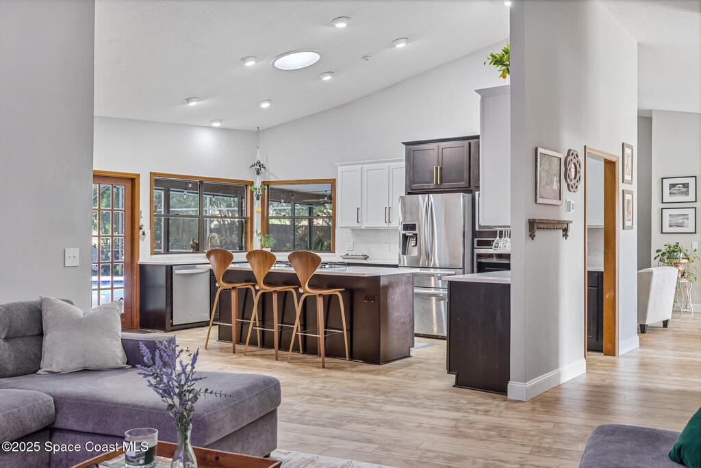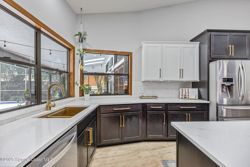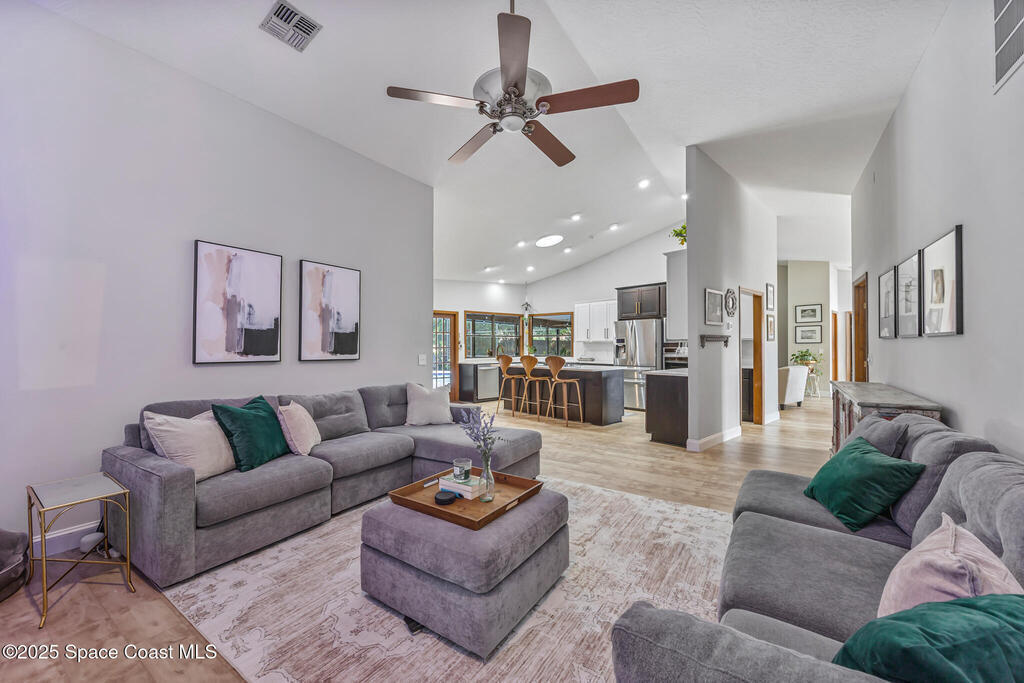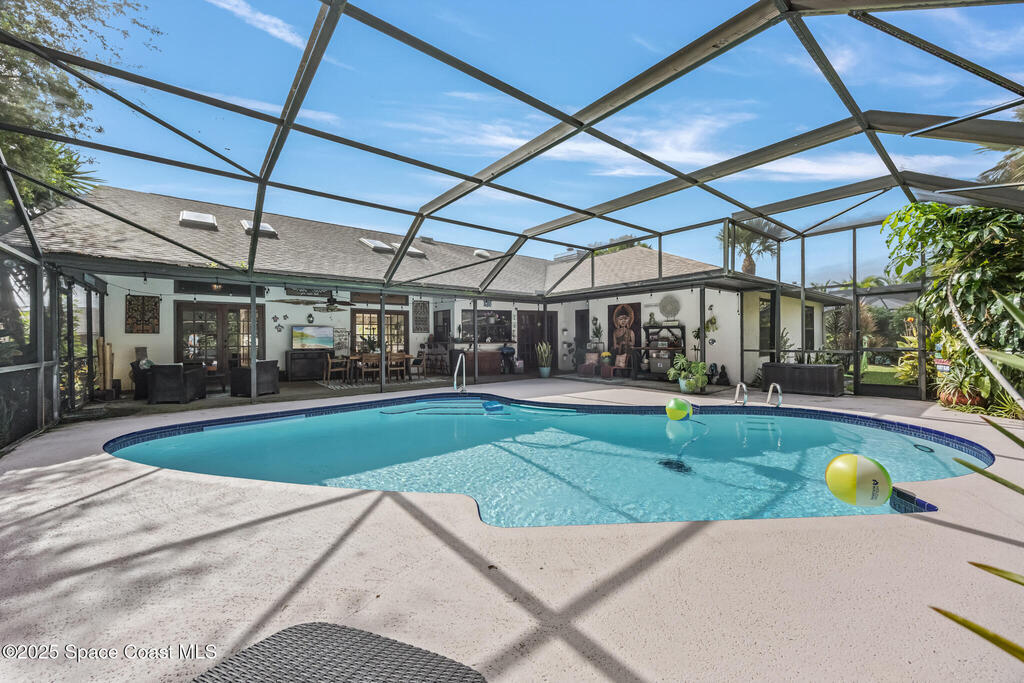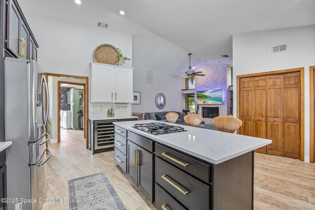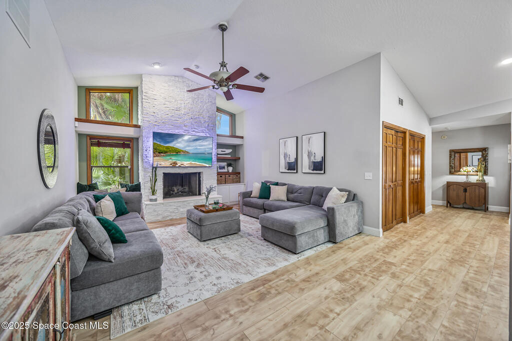 Beautifully updated 4-bed, 2-bath, 2,468 sq ft pool home in one of Suntree's most desirable golf-cart friendly neighborhoods, zoned for A-rated schools. Bright & open with vaulted ceilings, abundant natural light, & LVP flooring throughout. Two spacious living areas, including a family room with floor-to-ceiling stone gas fireplace, quartz hearth, & custom built-in cabinetry. The remodeled kitchen (2020) features two-tone cabinetry, quartz countertops, large island with deep drawers, gas Jenn-Air range, built-in wall oven/microwave, two double pantries, & bar wine fridge. Original wood doors and trim add warmth & character throughout. The large primary suite opens directly to the pool & offers a large walk-in closet & spa-style bath with dual vanities, jetted tub, w/separate shower. The three additional bedrooms are located on the opposite side of the home for privacy & shared bath with skylight.