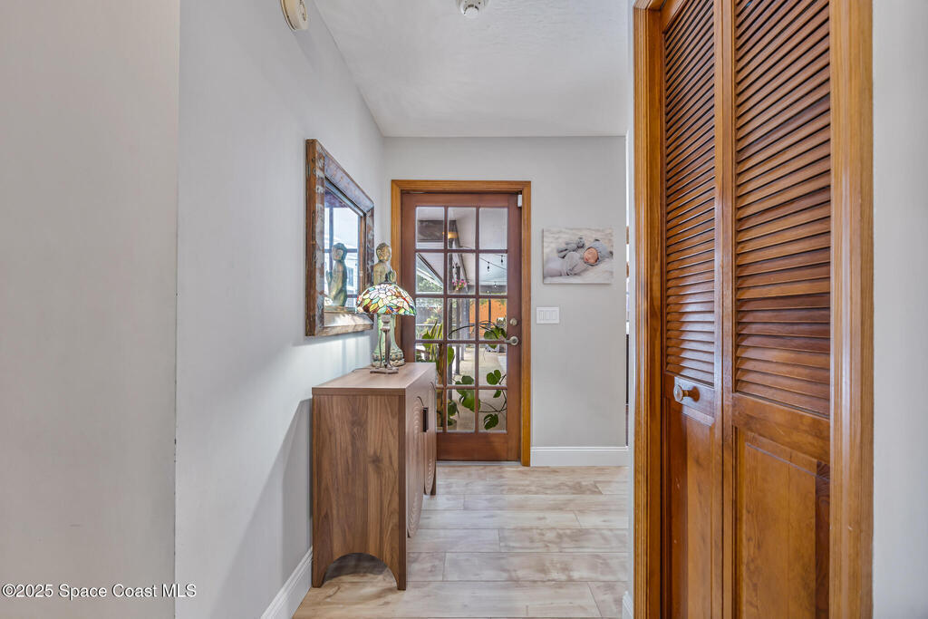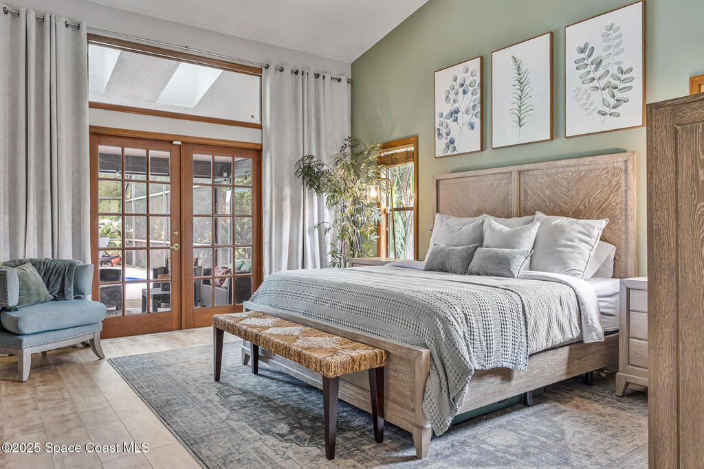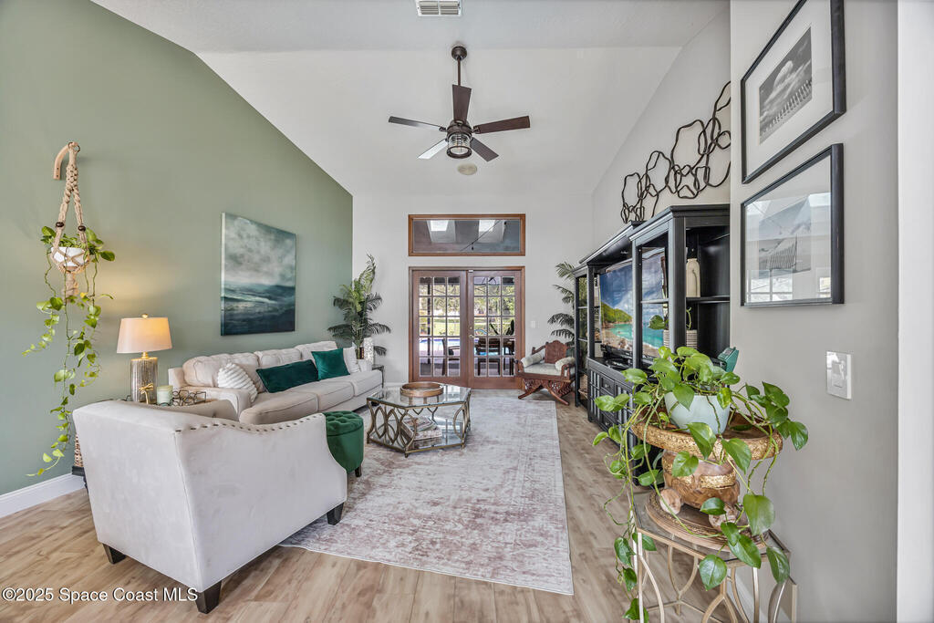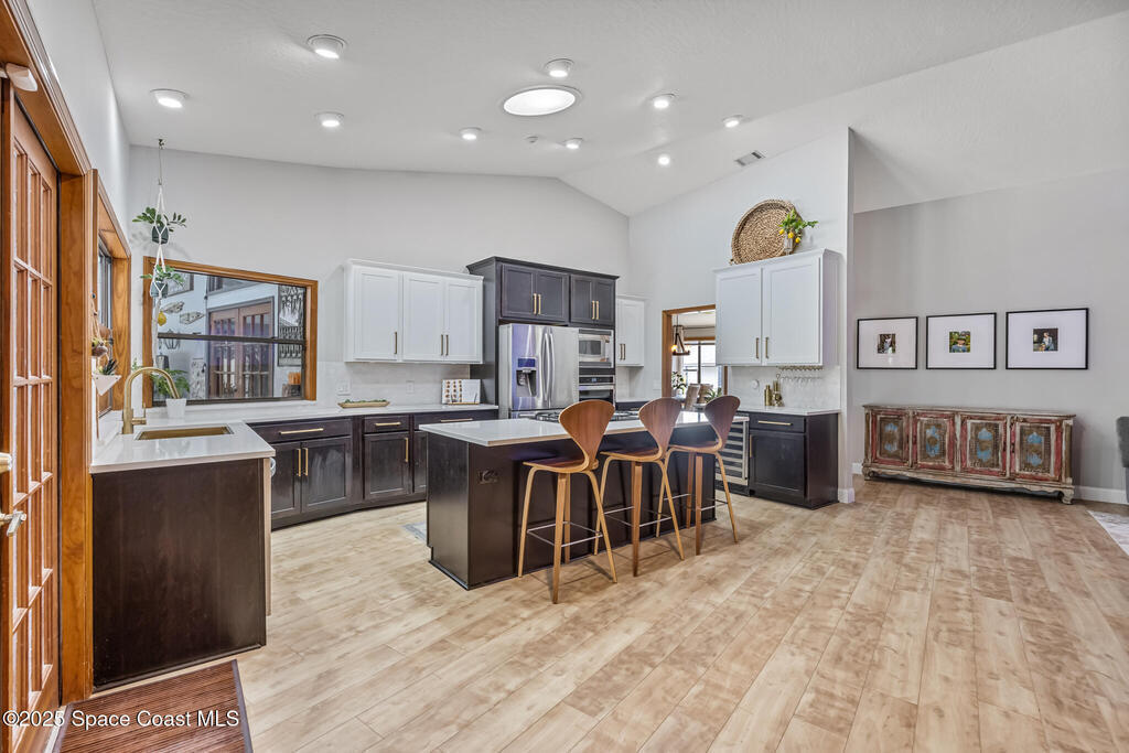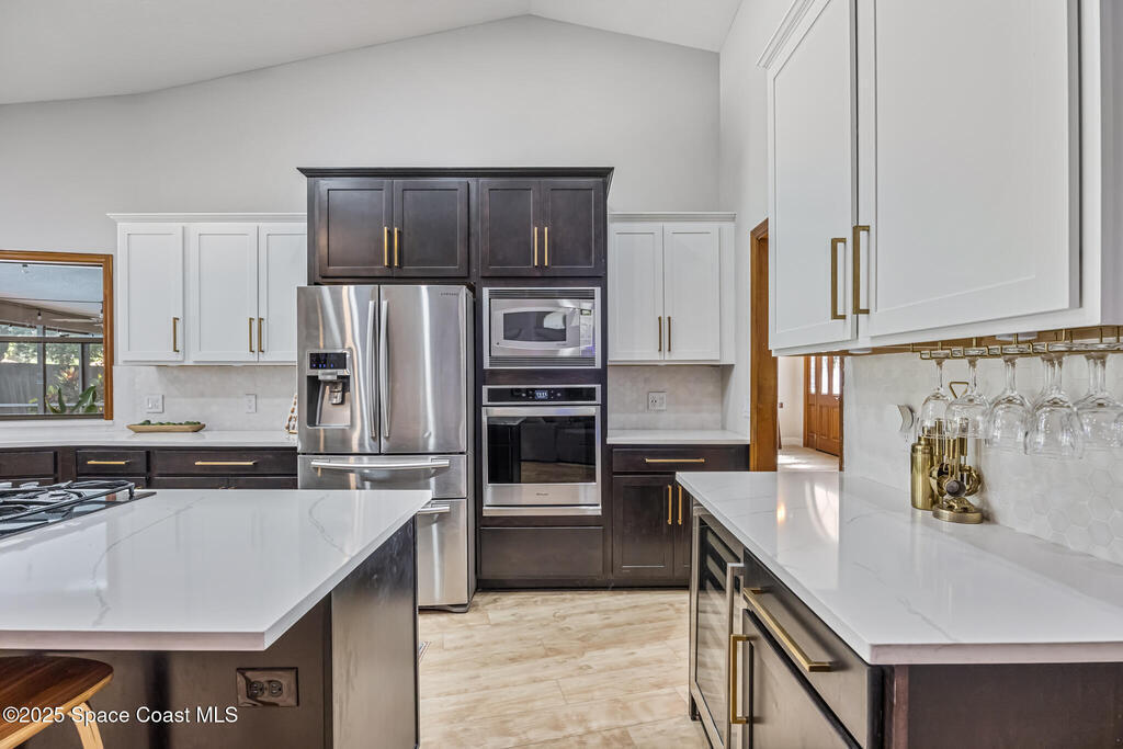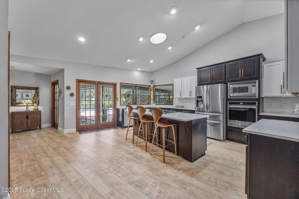 Beautifully updated 4-bed, 2-bath, 2,468 sq ft pool home in one of Suntree's most desirable golf-cart friendly neighborhoods, zoned for A-rated schools. Bright & open with vaulted ceilings, abundant natural light, & LVP flooring throughout. Two spacious living areas, including a family room with floor-to-ceiling stone gas fireplace, quartz hearth, & custom built-in cabinetry. The remodeled kitchen (2020) features two-tone cabinetry, quartz countertops, large island with deep drawers, gas Jenn-Air range, built-in wall oven/microwave, two double pantries, & bar wine fridge. Original wood doors and trim add warmth & character throughout. The large primary suite opens directly to the pool & offers a large walk-in closet & spa-style bath with dual vanities, jetted tub, w/separate shower. The three additional bedrooms are located on the opposite side of the home for privacy & shared bath with skylight.