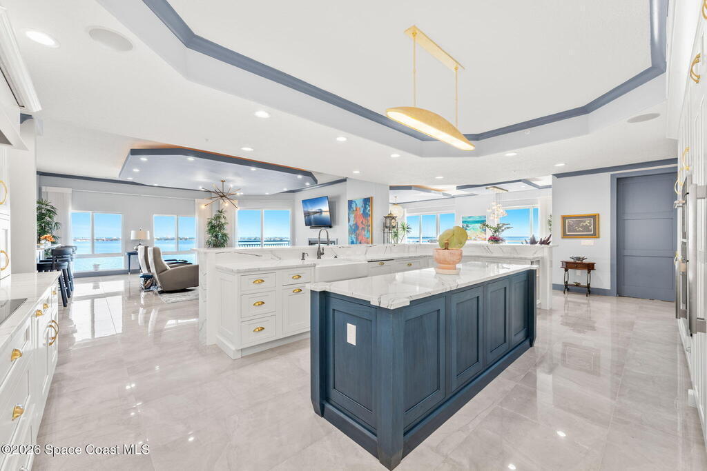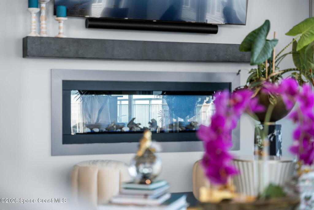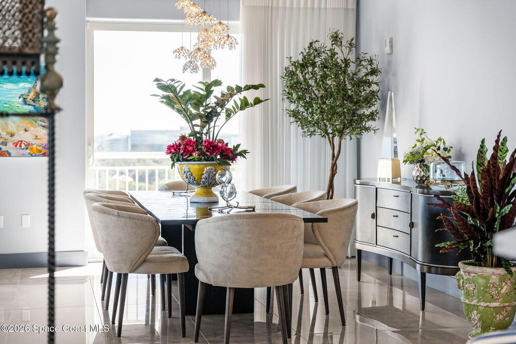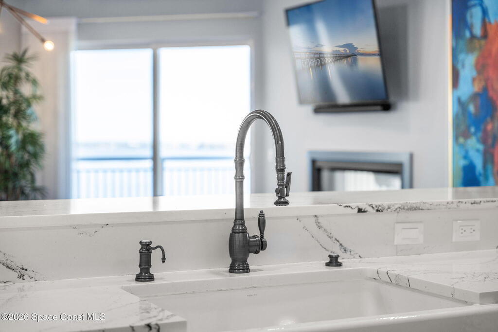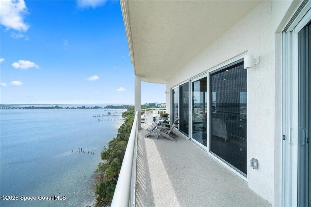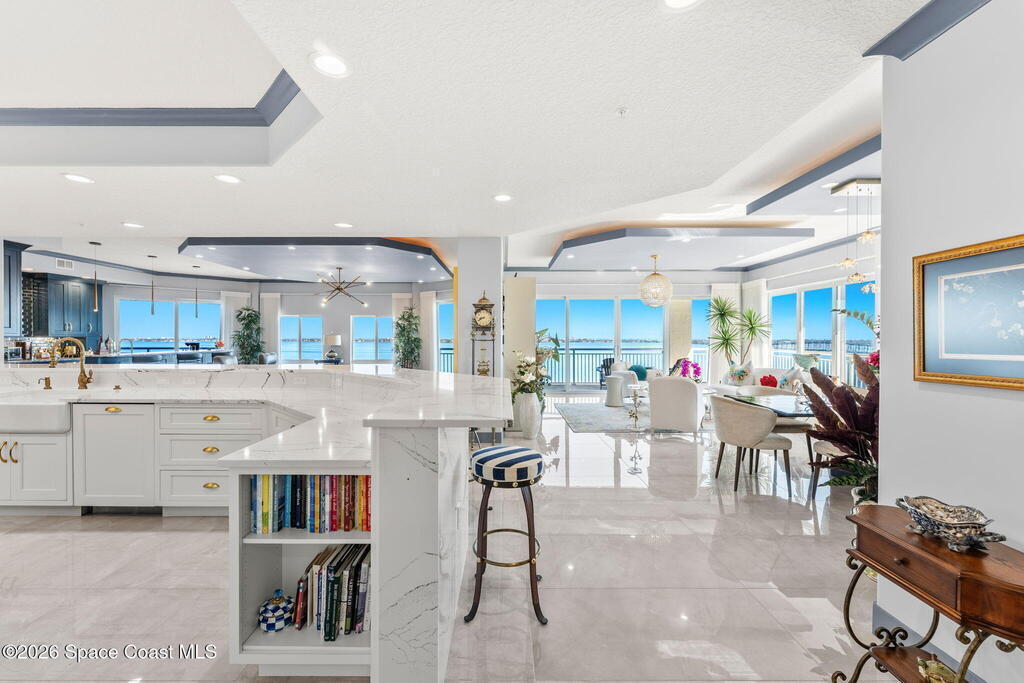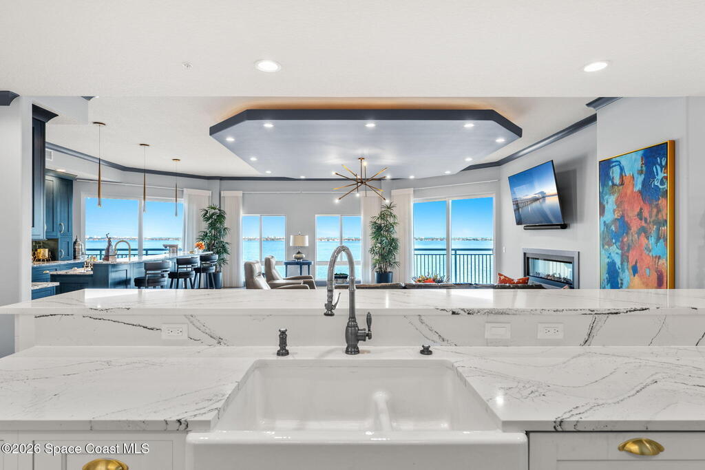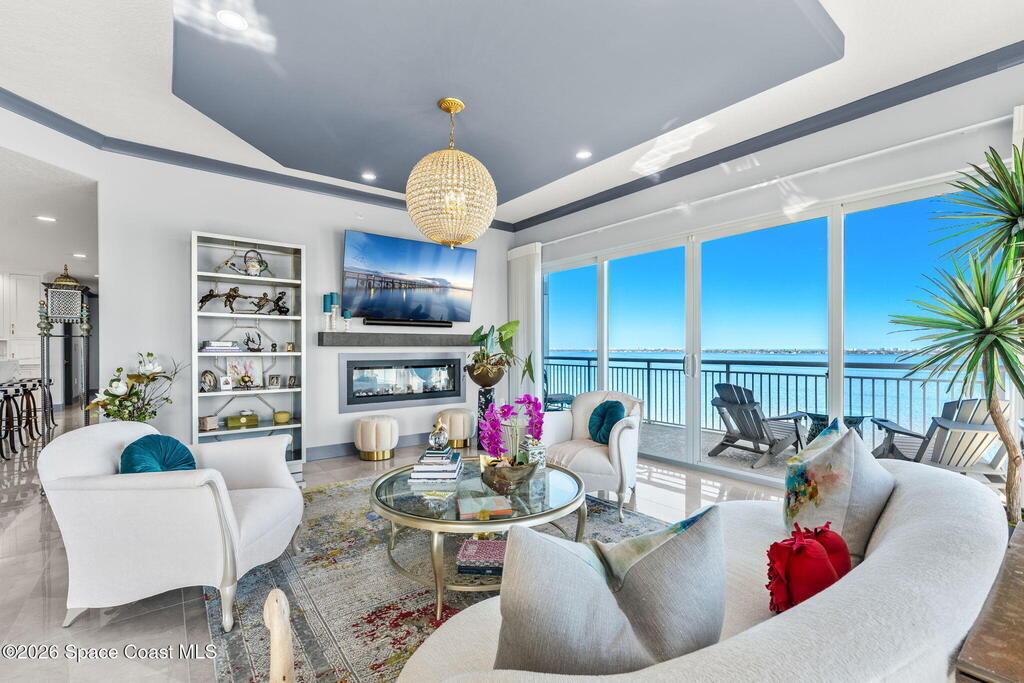 Experience elevated waterfront living in this stunning corner penthouse.This elegant home welcomes you with a beautiful hand laid marble floor highlighted by designer chandeliers lighting your way to a spacious open concept living area with floor to ceiling sliding doors.They showcase breathtaking views of the Indian River and rocket launches.The gourmet kitchen includes an induction cooktop and custom cabinets with pullout shelving.The master suite offers a private balcony, two walk-in closets, a shoe closet, spa bath, bidet and designer tile finishes. Two secondary en suite bedrooms, an office and art studio complete the living space.There are quartz countertops,electric window treatments,upgraded plumbing and light fixtures in every room.A see through fireplace separates the living and family areas. Sip your morning coffee watching beautiful sunrises or enjoy cocktails from your full bar with pull out shelves and its own refrigerator, freezer, wine cooler and nugget ice maker.