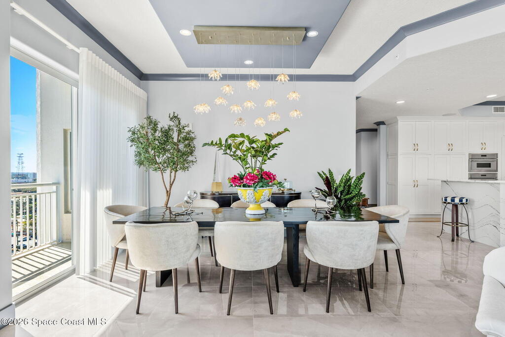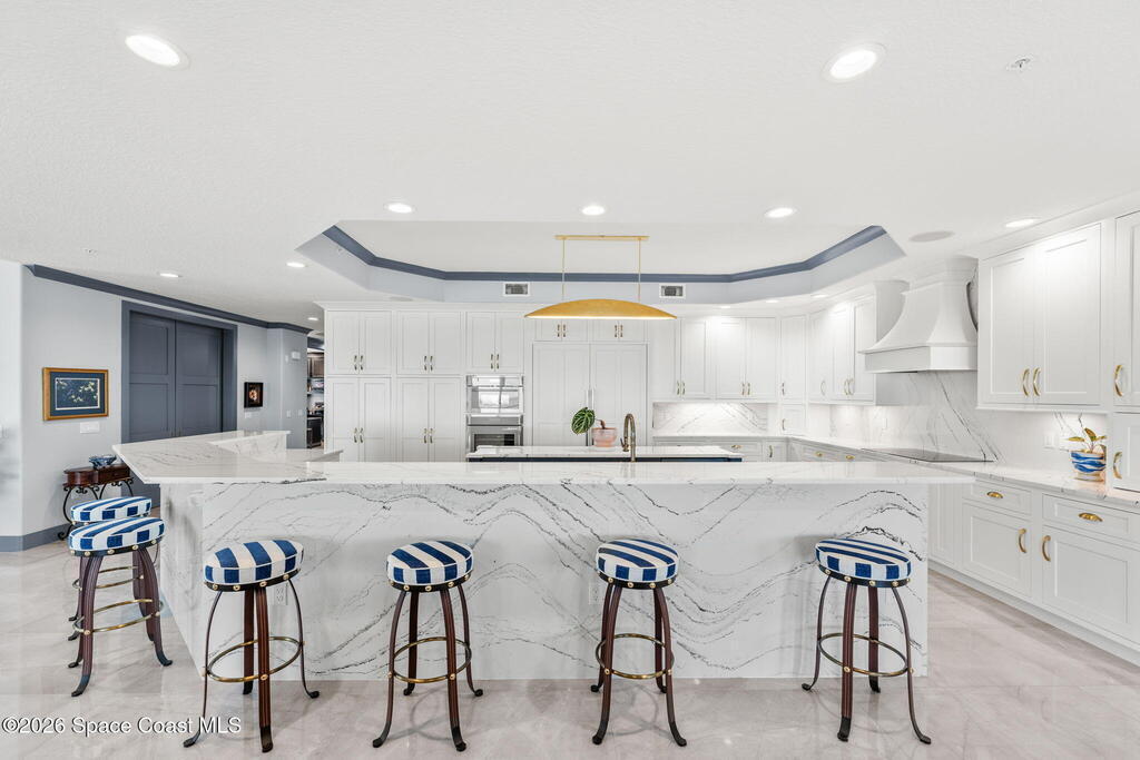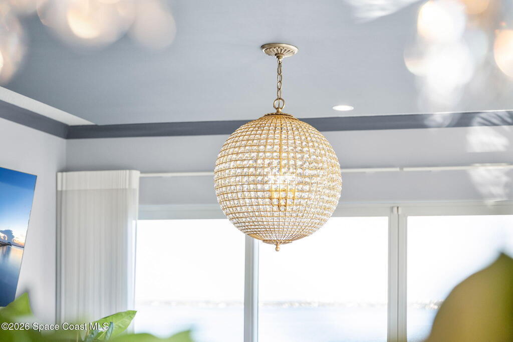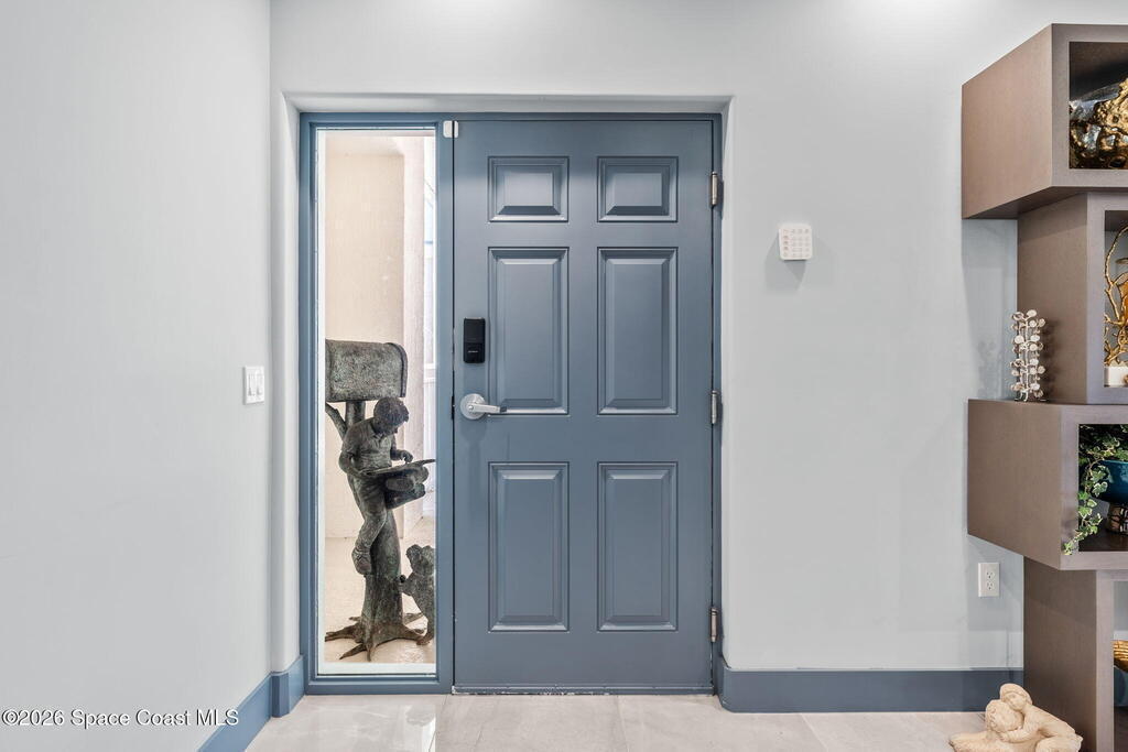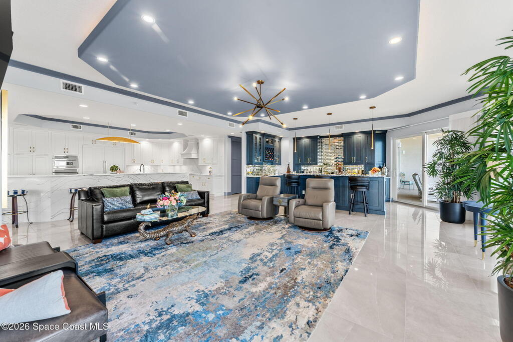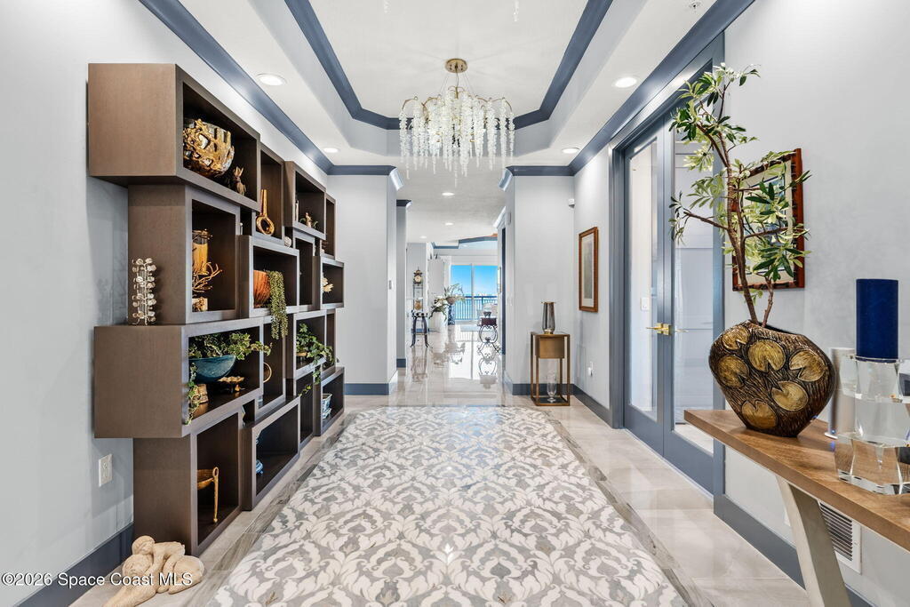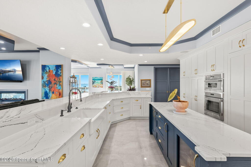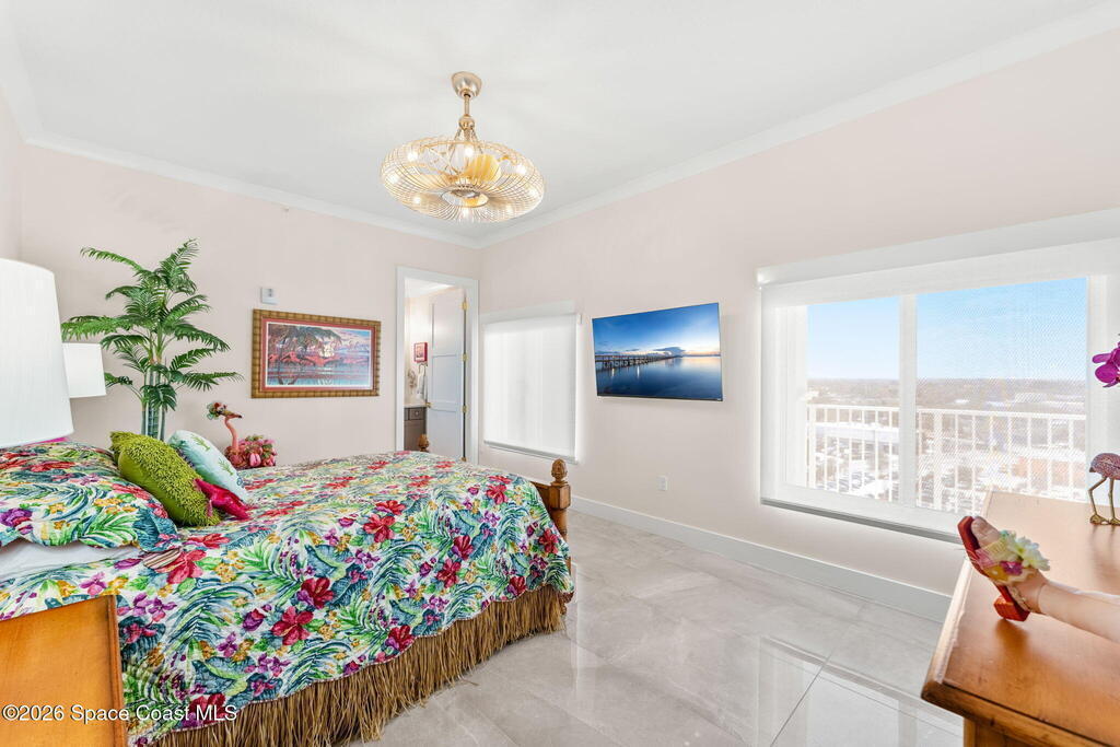 Experience elevated waterfront living in this stunning corner penthouse.This elegant home welcomes you with a beautiful hand laid marble floor highlighted by designer chandeliers lighting your way to a spacious open concept living area with floor to ceiling sliding doors.They showcase breathtaking views of the Indian River and rocket launches.The gourmet kitchen includes an induction cooktop and custom cabinets with pullout shelving.The master suite offers a private balcony, two walk-in closets, a shoe closet, spa bath, bidet and designer tile finishes. Two secondary en suite bedrooms, an office and art studio complete the living space.There are quartz countertops,electric window treatments,upgraded plumbing and light fixtures in every room.A see through fireplace separates the living and family areas. Sip your morning coffee watching beautiful sunrises or enjoy cocktails from your full bar with pull out shelves and its own refrigerator, freezer, wine cooler and nugget ice maker.