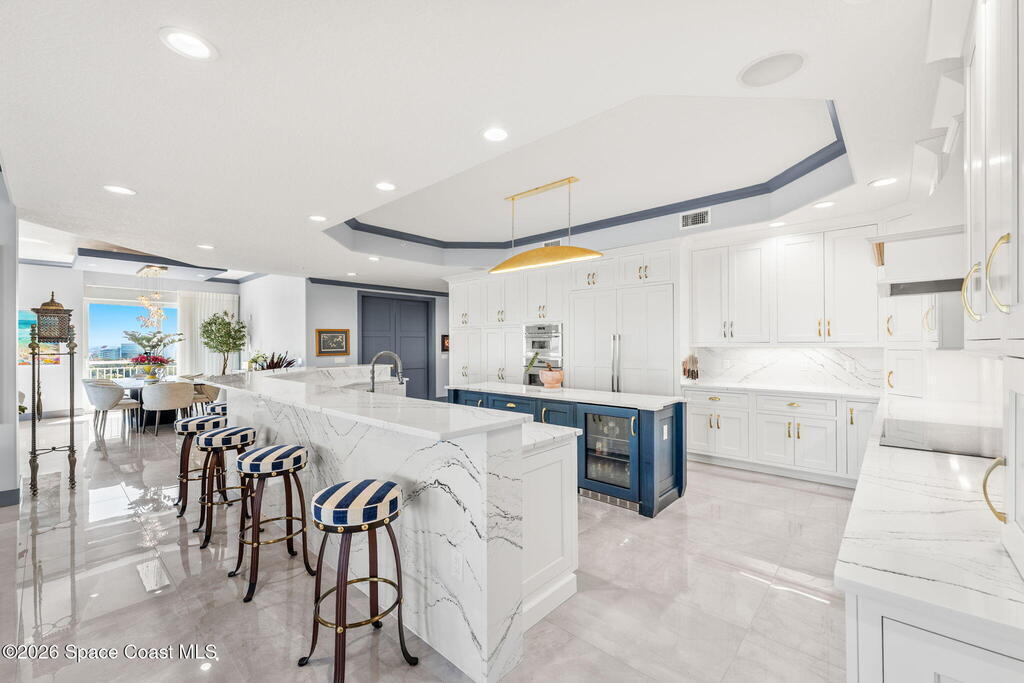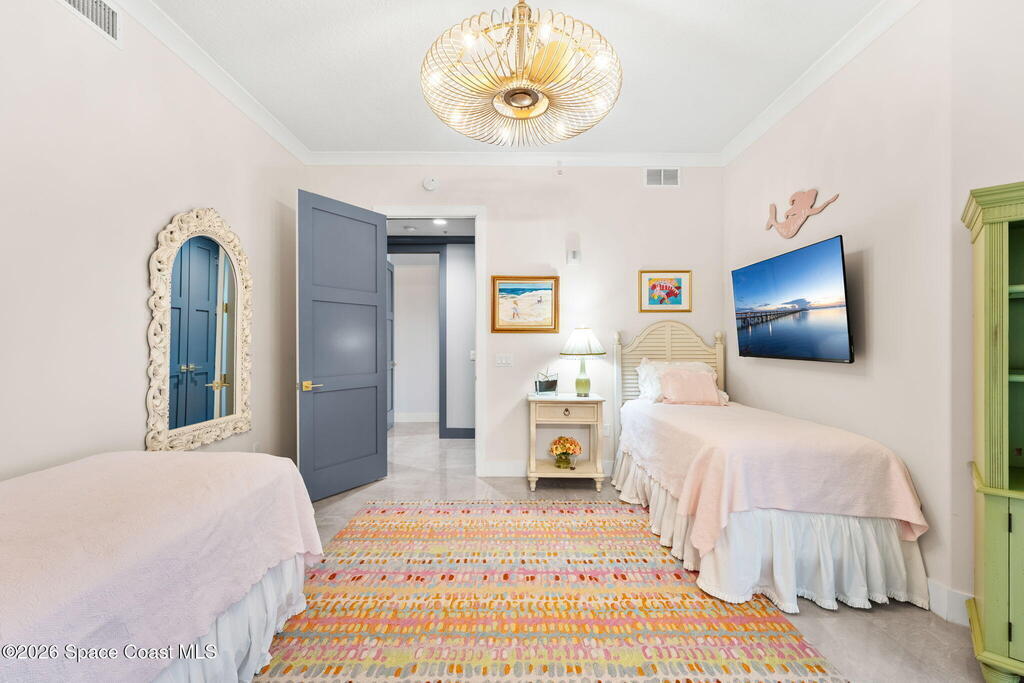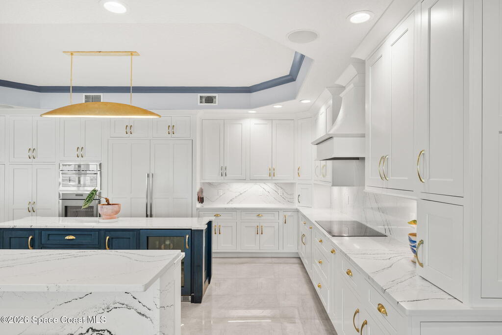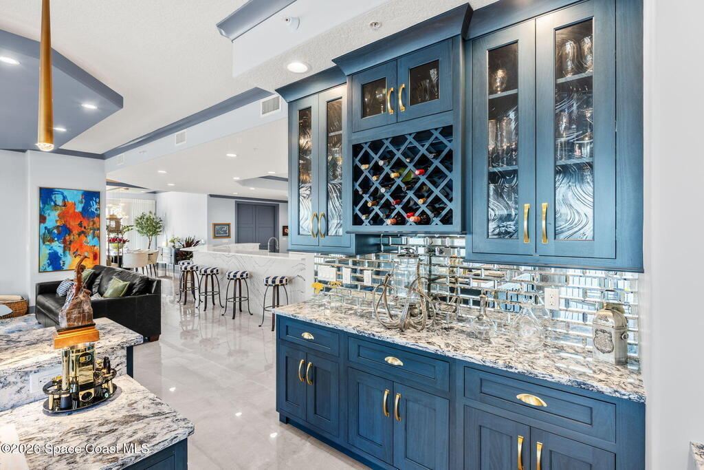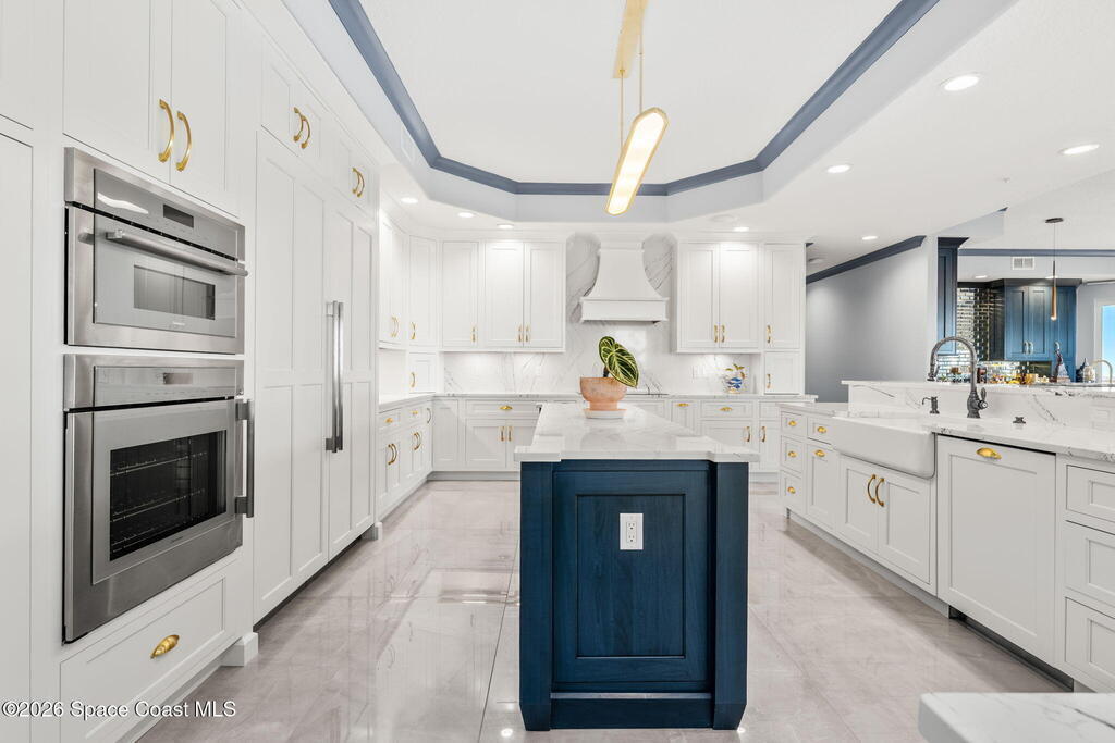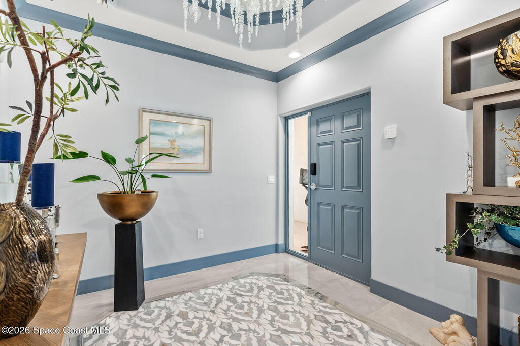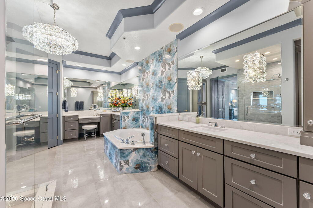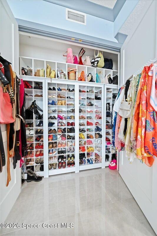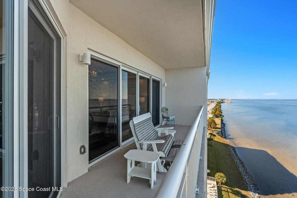 Experience elevated waterfront living in this stunning corner penthouse.This elegant home welcomes you with a beautiful hand laid marble floor highlighted by designer chandeliers lighting your way to a spacious open concept living area with floor to ceiling sliding doors.They showcase breathtaking views of the Indian River and rocket launches.The gourmet kitchen includes an induction cooktop and custom cabinets with pullout shelving.The master suite offers a private balcony, two walk-in closets, a shoe closet, spa bath, bidet and designer tile finishes. Two secondary en suite bedrooms, an office and art studio complete the living space.There are quartz countertops,electric window treatments,upgraded plumbing and light fixtures in every room.A see through fireplace separates the living and family areas. Sip your morning coffee watching beautiful sunrises or enjoy cocktails from your full bar with pull out shelves and its own refrigerator, freezer, wine cooler and nugget ice maker.