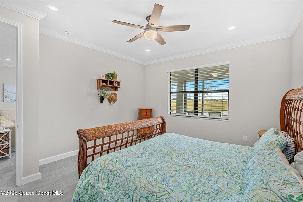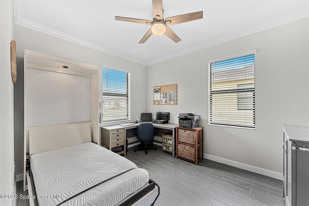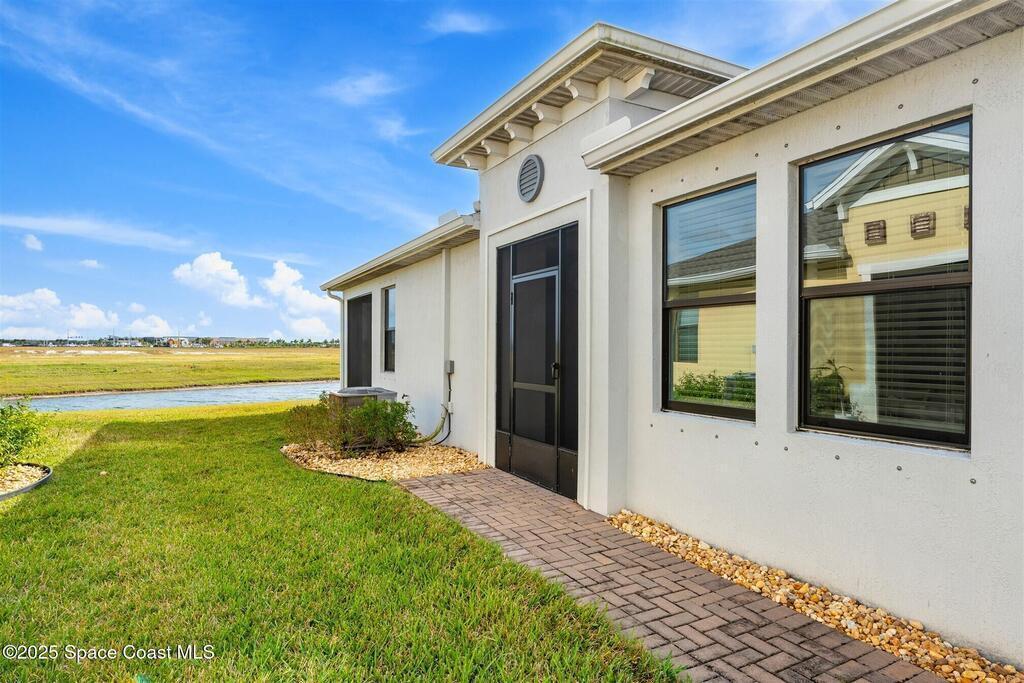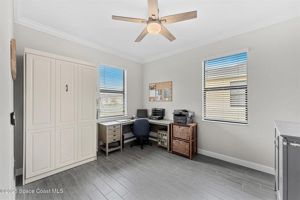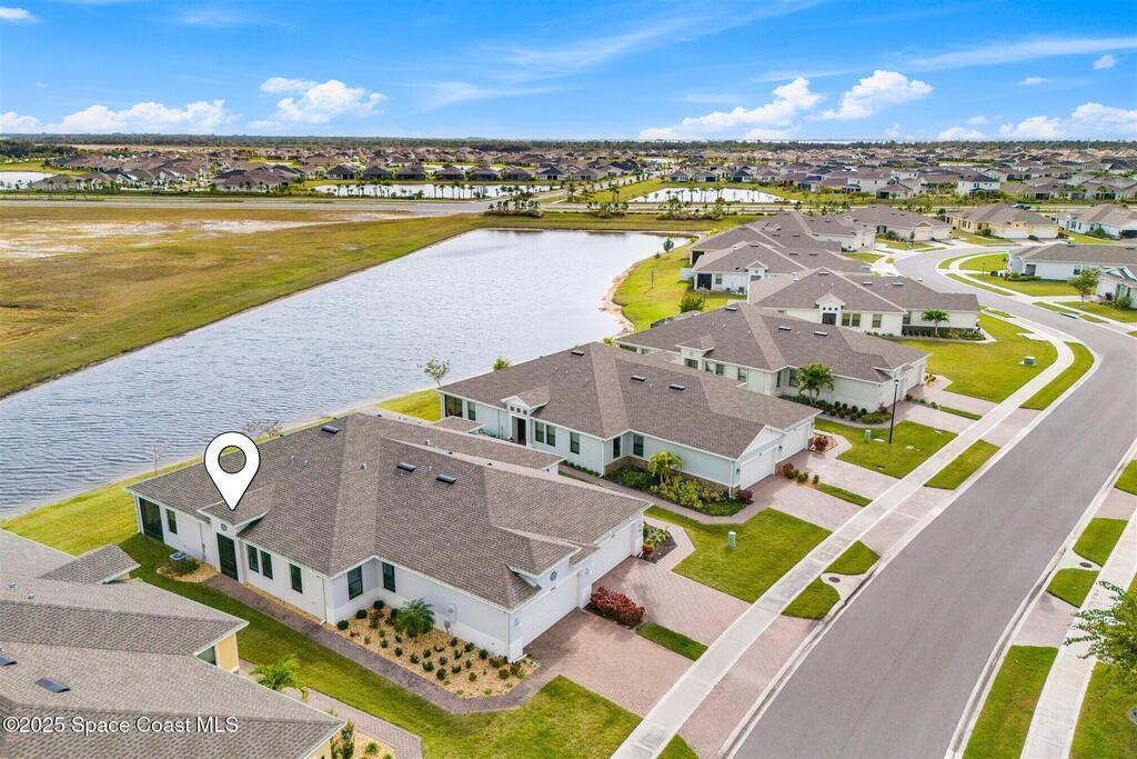 Must See 1565 Sq. ft. waterfront home in in Bridgewater, Viera's sought after 55+ resort style gated community! This 2 bedroom plus study, 2 bath, 2 car oversized garage (20X21) home checks off all the boxes: plank tile floors and crown molding throughout, 8' doors, deluxe light package with LED lights in Great Room and Primary Bedroom, and 5 ceiling fans. Designer kitchen with staggered white cabinets, marble look quartz counters, decorator backsplash, and portable island with extra drawers and cabinets! Luxury primary bath with large shower w/ bench, quartz counters and upgraded faucets! Study with double doors includes a murphy bed for those out-of-town guests! Laundry Rm has extra closet! Private screened-in entry and 270 sq. ft. back porch. Unwind at the private clubhouse, featuring a heated pool w/ waterfall & spa, fitness room, billiard room, coffee lounge, lit tennis & pickle ball courts, and a movie theater! The HOA covers lawn care! Short car ride to Atlantic beaches!