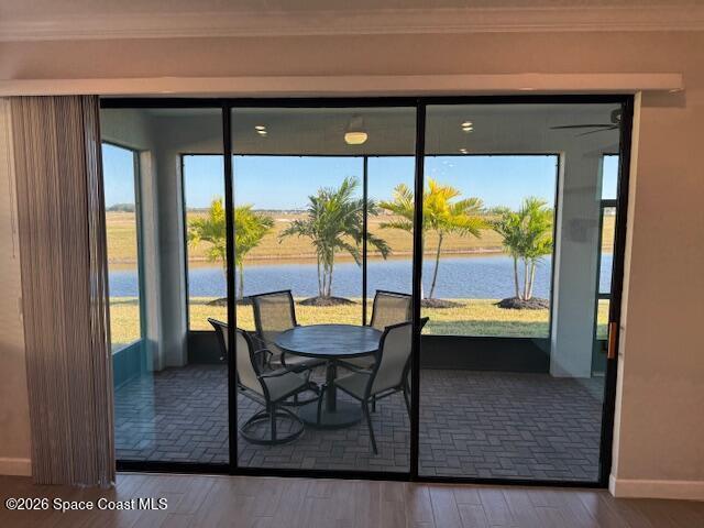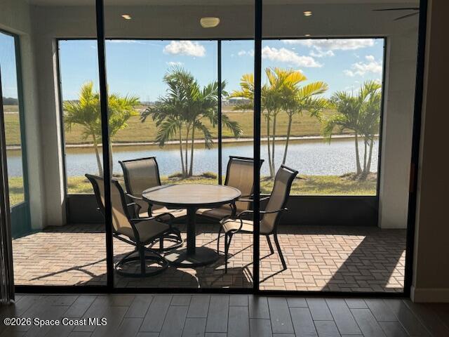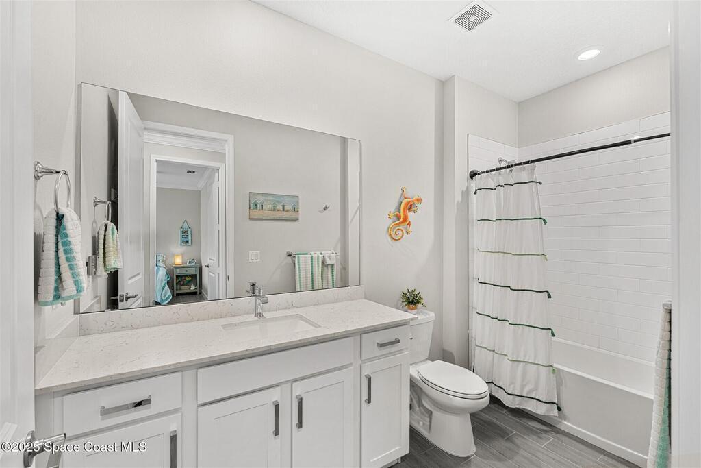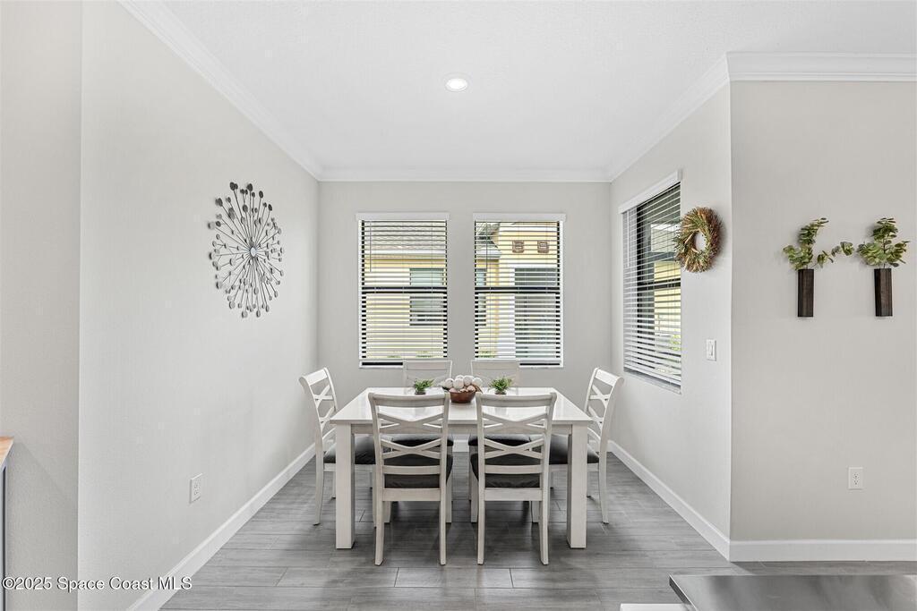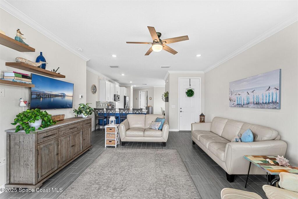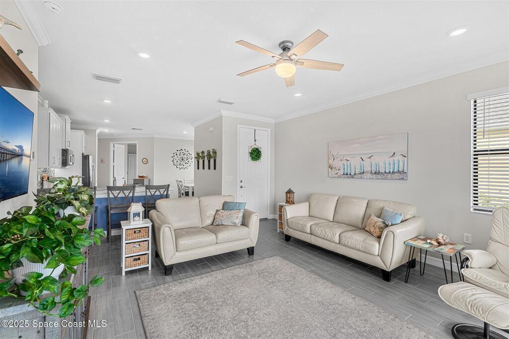 Must See 1565 Sq. ft. waterfront home in in Bridgewater, Viera's sought after 55+ resort style gated community! This 2 bedroom plus study, 2 bath, 2 car oversized garage (20X21) home checks off all the boxes: plank tile floors and crown molding throughout, 8' doors, deluxe light package with LED lights in Great Room and Primary Bedroom, and 5 ceiling fans. Designer kitchen with staggered white cabinets, marble look quartz counters, decorator backsplash, and portable island with extra drawers and cabinets! Luxury primary bath with large shower w/ bench, quartz counters and upgraded faucets! Study with double doors includes a murphy bed for those out-of-town guests! Laundry Rm has extra closet! Private screened-in entry and 270 sq. ft. back porch. Unwind at the private clubhouse, featuring a heated pool w/ waterfall & spa, fitness room, billiard room, coffee lounge, lit tennis & pickle ball courts, and a movie theater! The HOA covers lawn care! Short car ride to Atlantic beaches!