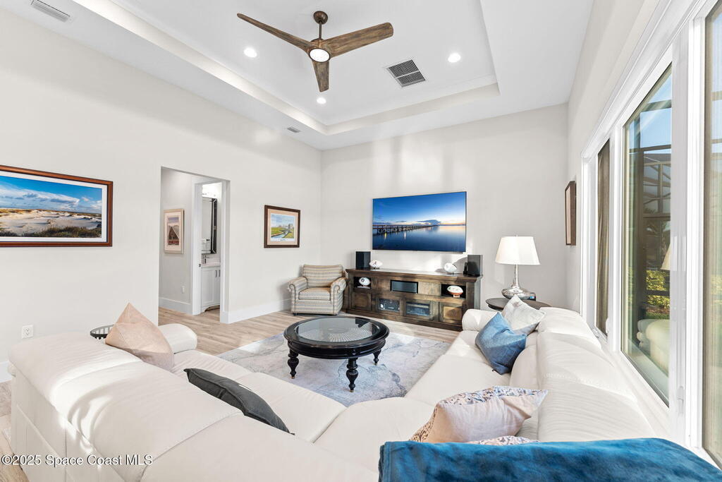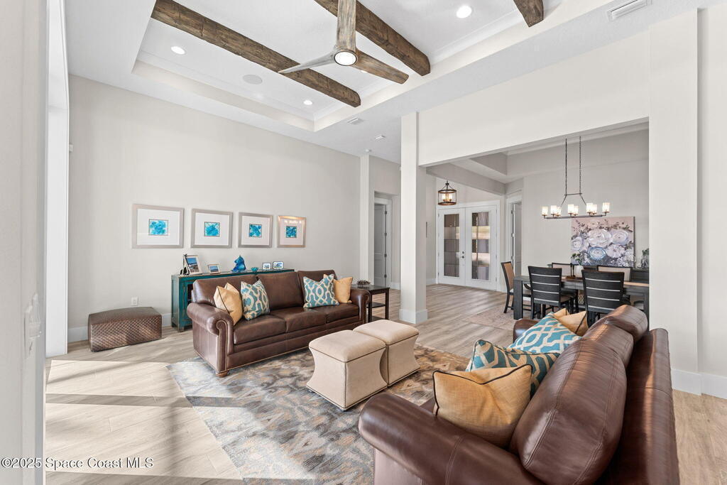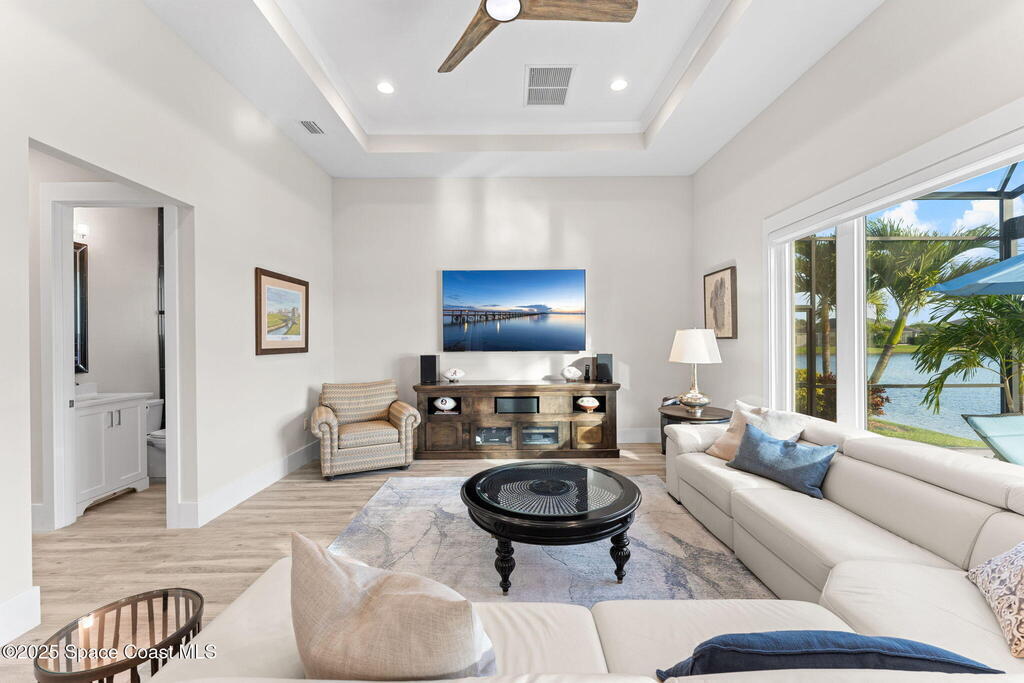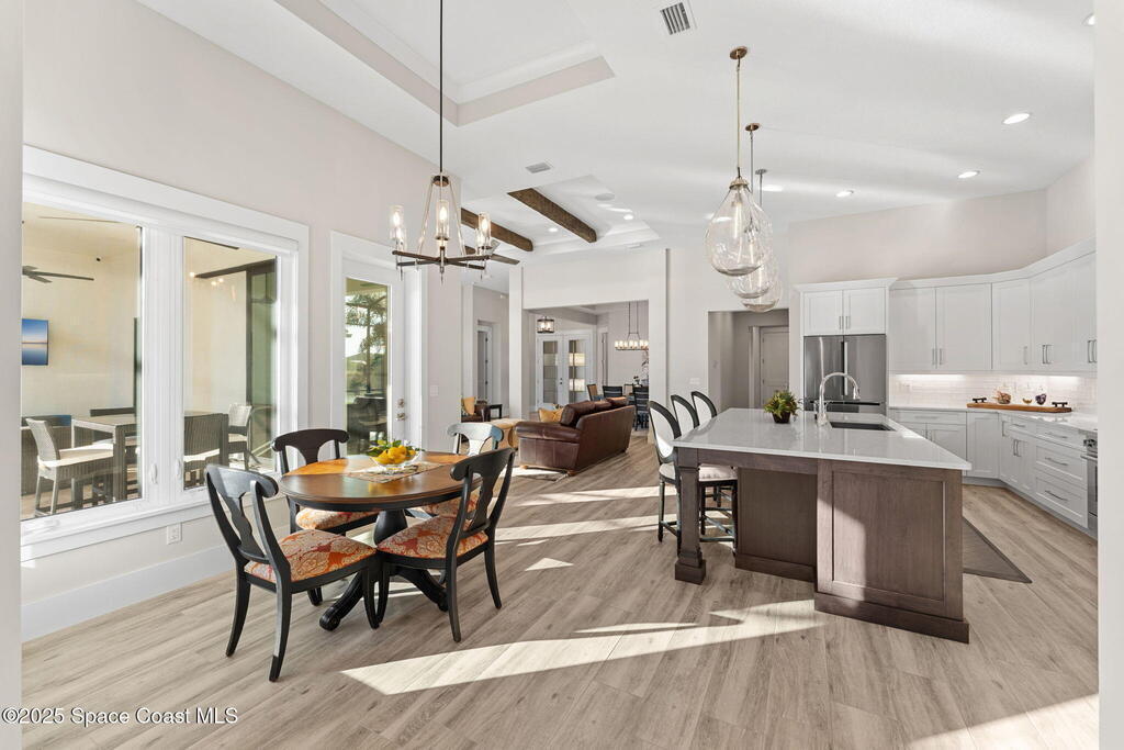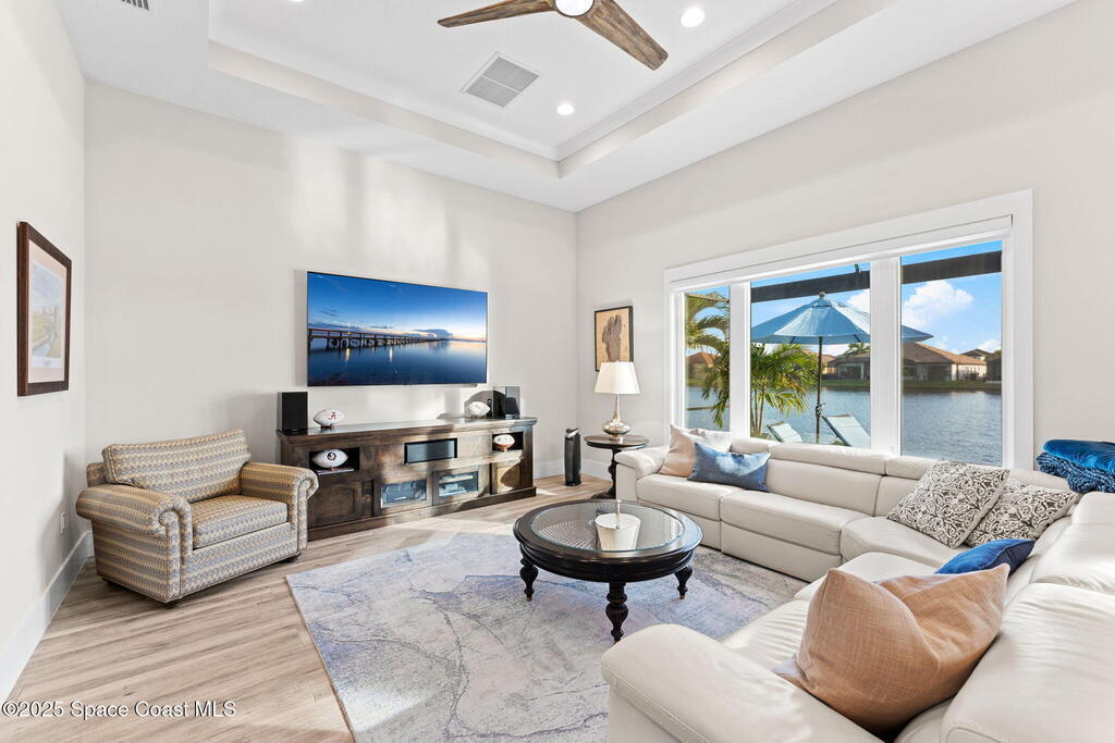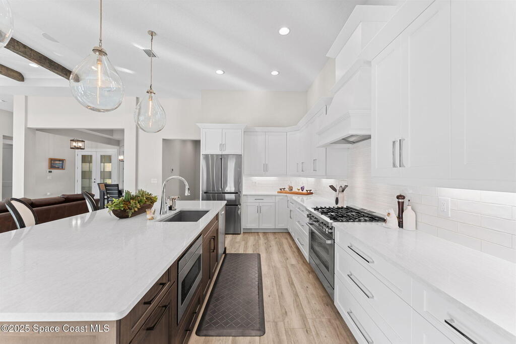 Experience this stunning Santa Rosa floor plan home featuring 3 bedrooms, a study, 3 baths, and a spacious 3-car garage. Built by one of Brevard's most reputable long-standing builders, this residence showcases quality throughout with 8' sliders, an elegant front door, wood-look porcelain tile flooring, a tile roof, soaring 10' ceilings, and tray ceilings. The gourmet kitchen offers 42'' cabinetry, a large island, quartz countertops, tile backsplash, a pantry, and upgraded stainless-steel appliances. The open layout includes two living areas filled with natural light from expansive sliders leading to the impressive screened outdoor oasis. Enjoy a resort-style pool with sun shelf, built-in loungers, tile accents, and a spacious travertine deck perfect for entertaining. The covered lanai features multiple seating areas, ceiling fans, and a full outdoor kitchen with a built-in grill. Gas is pre-piped to the lanai for easy outdoor cooking.