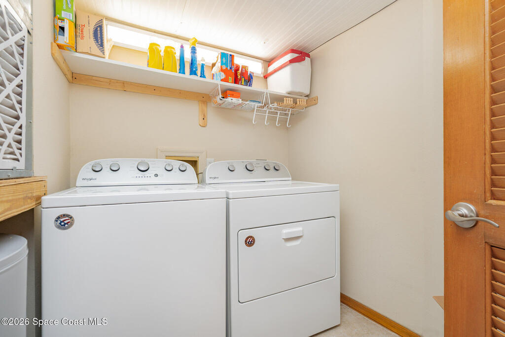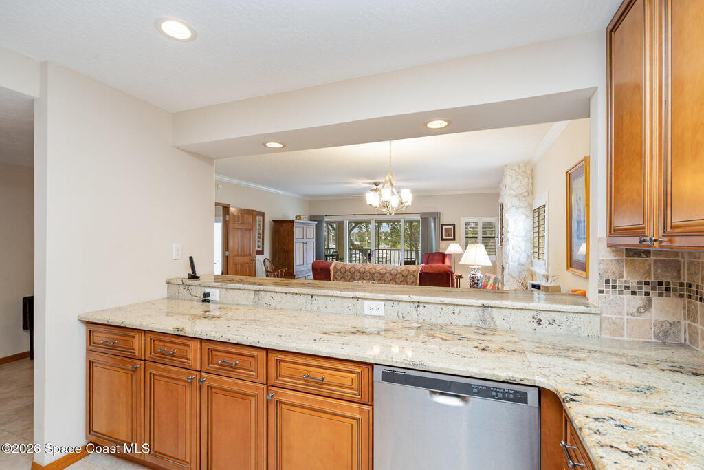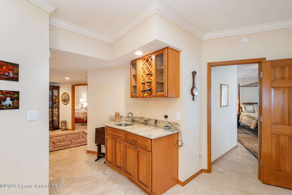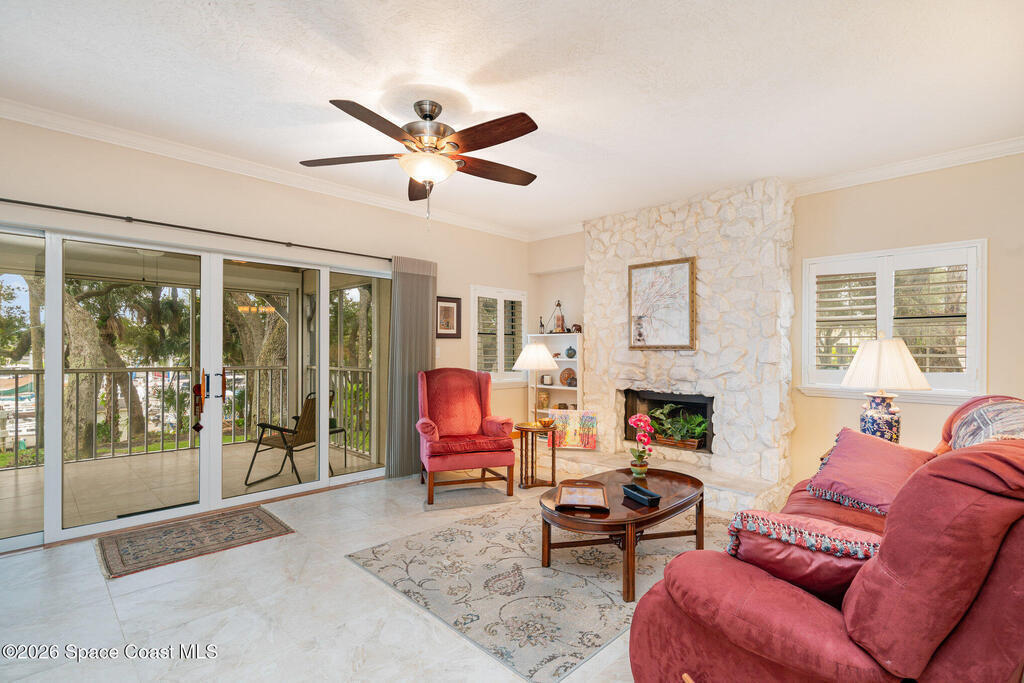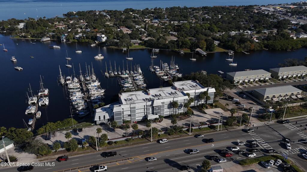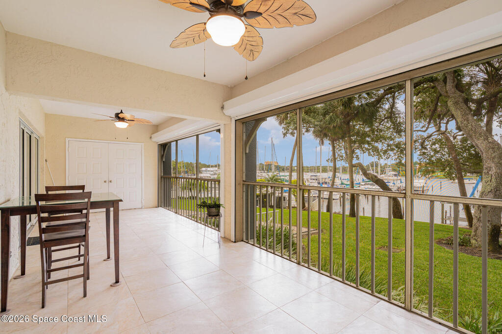 Positioned on the south end of the building, this totally renovated 1st-floor end-unit condo offers assigned parking just steps from the door. The 3-bed, 2-bath waterfront residence showcases tranquil views of the Eau Gallie River & marina & features a thoughtfully arranged floor plan. The living room opens to a large, screened balcony, an ideal extension of the living space for enjoying river breezes & daily boat activity. The dining area includes a built-in wet bar with wine storage & sink, perfect for entertaining, while the updated kitchen offers stainless steel appliances, granite countertops, & ample cabinet space. The primary suite enjoys water views along with a double-sink vanity & walk-in shower. Tile flooring, in-unit laundry, balcony hurricane rated screens, additional storage, & garage provides a dedicated parking space. Steps from the marina and minutes to Downtown Eau Gallie's dining, shopping, and arts, offering a relaxed coastal setting near local amenities.