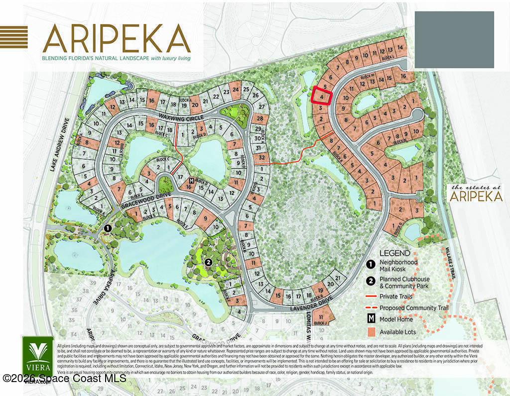 A rare opportunity to own one of the last available homesites with this spectacular lake and preserve view in the prestigious, gated community of Aripeka at Viera. This expansive .31-acre lot offers exceptional privacy, breathtaking sunset views, and a tranquil natural backdrop, creating an ideal setting for a custom luxury residence. Buyers may purchase the lot now and choose to build immediately or wait up to three years to begin construction. Homes must be built with the approved luxury custom builder. Build the TBB on MLS #1067162, select from one of our thoughtfully designed floor plans, or custom build your dream home tailored to your vision. Aripeka is a golf cart-friendly community known for preserved trees, nature trails, and distinctive architecture, ideally located near shopping, dining, I-95, beaches, and A-rated schools.