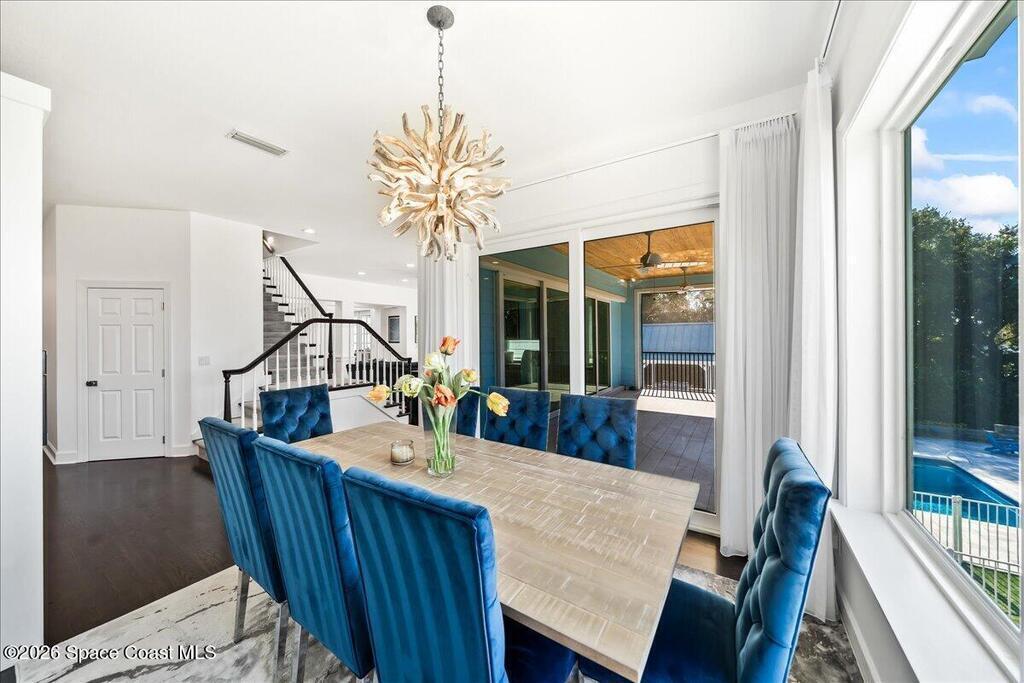 From the moment you step through the front door, you're greeted by sweeping, uninterrupted views of Honeymoon Lake, an immediate sense of arrival that sets the tone for the entire residence. Positioned along one of Brevard County's most coveted waterways, this singular waterfront estate is a study in quiet luxury and intentional design. Custom-stained oak hardwood floors, layered textures, and a gas fireplace create interiors that feel both polished and inviting, while the home's thoughtful layout draws the eye effortlessly toward the water beyond. Designed for seamless indoor-outdoor living, the exterior unfolds into a resort-style setting where a marble-framed pool, summer kitchen, and expansive pavered terraces invite long afternoons and elegant evenings. A powered dock with dual boat lifts provides direct access to the water, complemented by a Trex deck ideal for sunrise departures and sunset returns. Built with resilience and longevity in mind, the home features a metal roof,