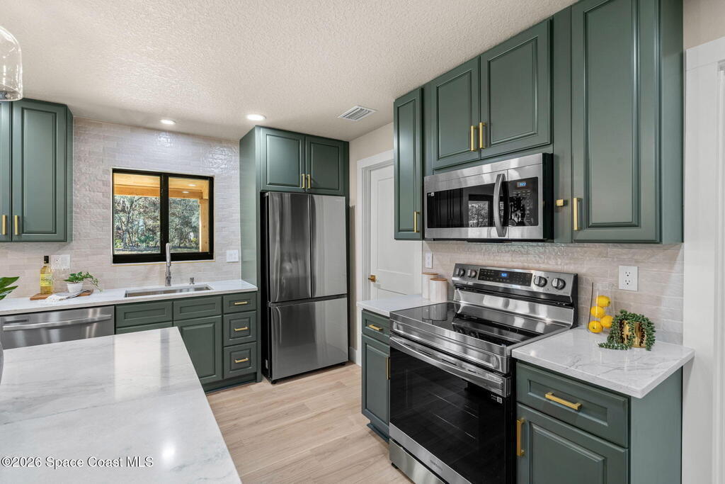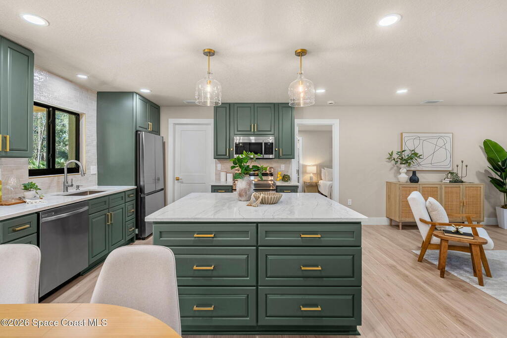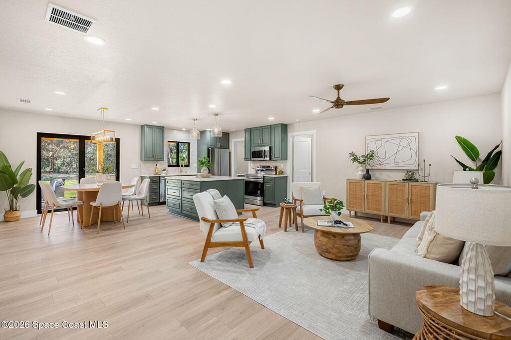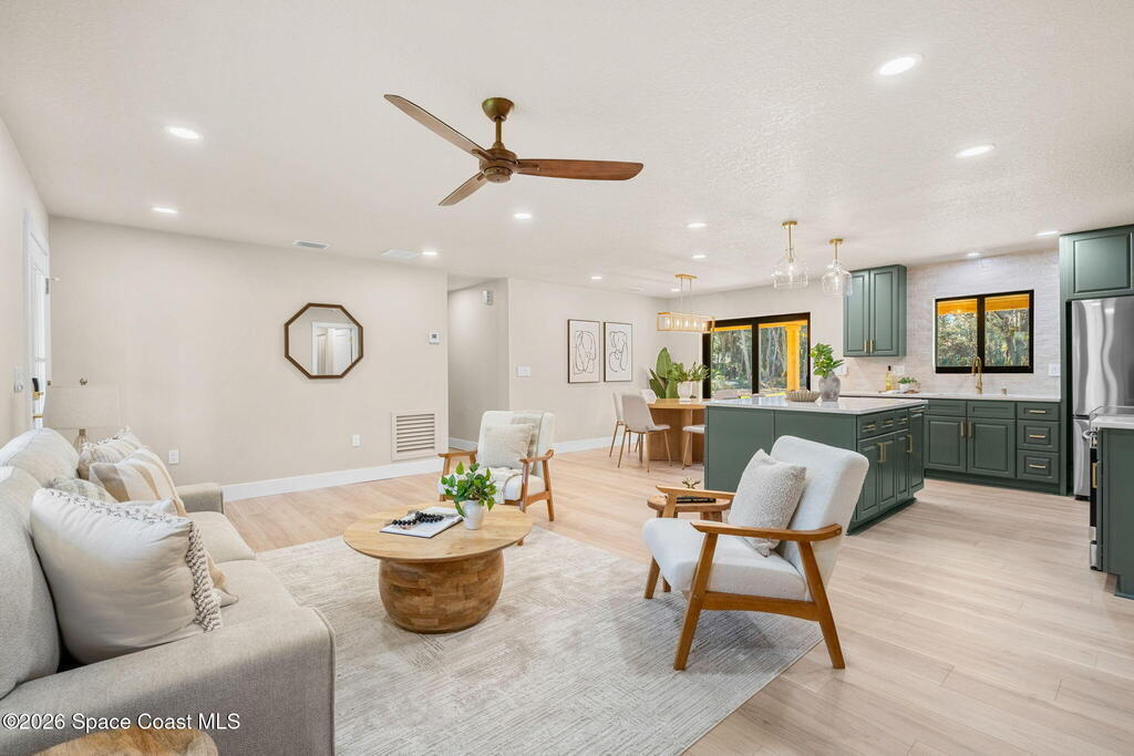 Completely Renovated From Top To Bottom, this stunning home is truly Move-in Ready, w/ everything Brand New & thoughtfully designed w/ impeccable attention to detail. Offering 4 bedrooms & 3 full bathrooms, the Re-designed Open-Concept layout delivers both style & functionality. LVP flooring throughout the living spaces, exquisite tilework in the baths, designer lighting & fans elevate every room. The gorgeous kitchen features a spacious island, quartz countertops, stainless steel appliances, tile backsplash & soft-close cabinetry. Spa-inspired bathrooms showcase top-tier finishes. Enjoy an oversized 2-car garage (705 SF) & unwind on the expansive rear porch w/ a beautiful Cedar plank ceiling. Situated on just over an acre with NO HOA, the yard is a blank canvas--add a pool, shed, ADU, or park your boat or RV. Major upgrades include New Doors, Impact Windows, New Roof, New Septic System, New HVAC, Blown-in Insulation & Much More. This home is Turn-Key & an Absolute Must-See!