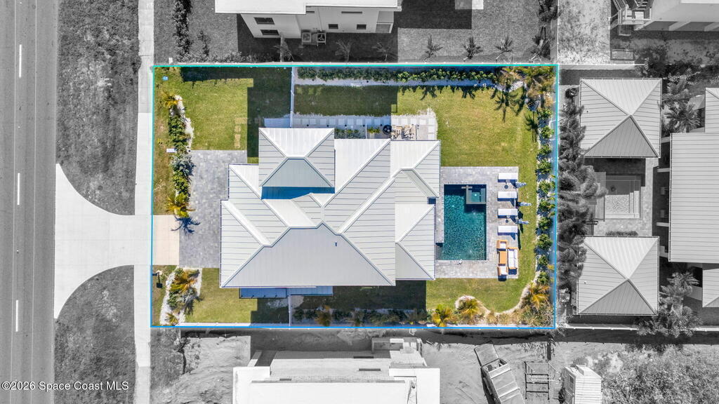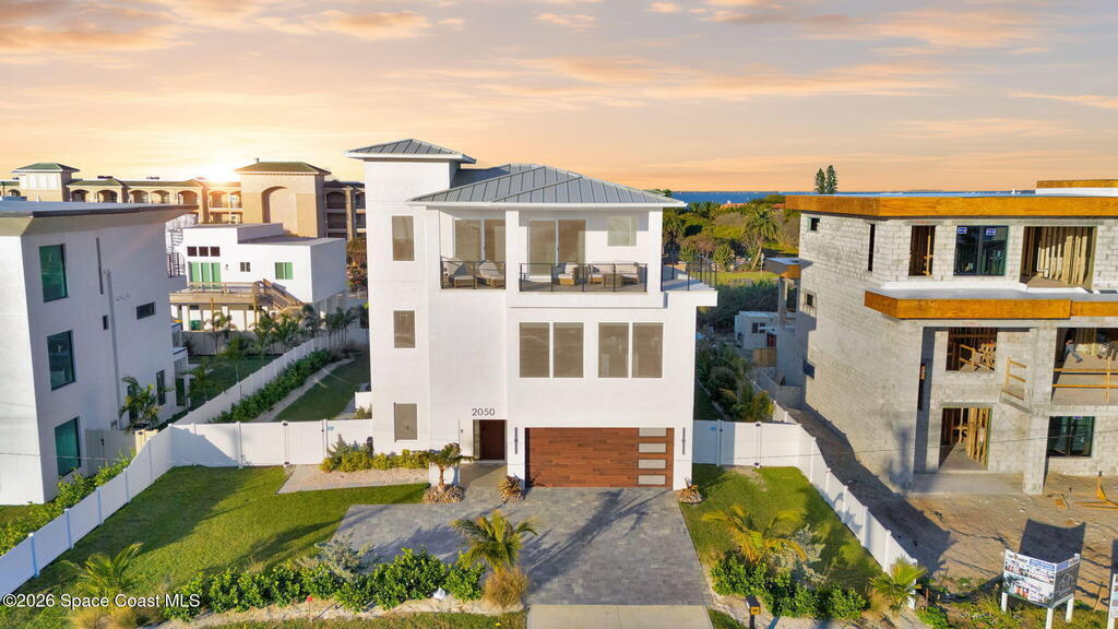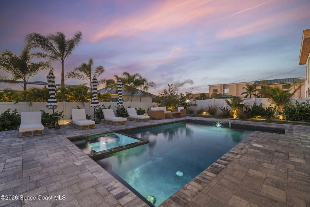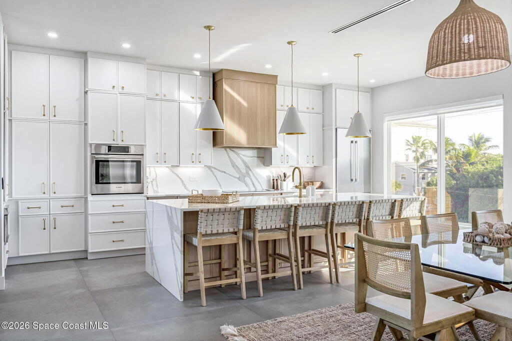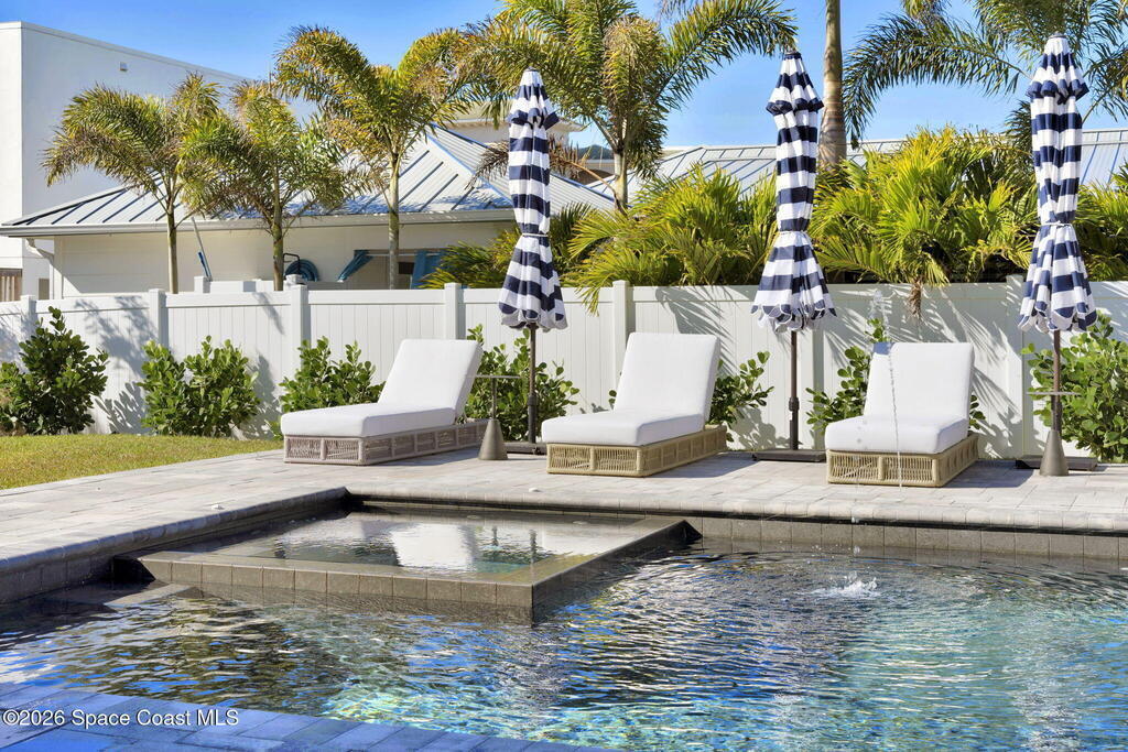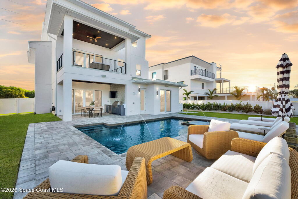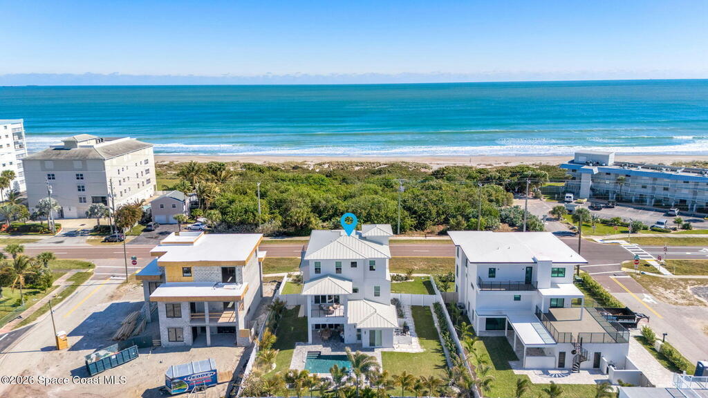 Experience the future of luxurious beachside living in South Cocoa Beach. Just steps from the sand with ocean views and state-protected oceanfront, this brand-new construction leaves no stone unturned. The flexible design is ideal as a weekend escape, full-time residence, or high-performing short-term rental. Indoor-outdoor living begins on the ground level, where oversized sliders open to a covered patio, summer kitchen, and Palm Beach-inspired pool, spa, and lounge area--perfect for entertaining or unwinding after a day at the beach. An elevator carries you to the second-floor living space, featuring a spacious family room and designer kitchen with high-end Bosch appliances, sleek Calacatta quartz, and refined coastal finishes. The third-floor primary suite offers river views to the west and blue ocean views to the east from your private balcony--perfect for sunrise coffee or sunset relaxation. Located within two miles of downtown dining, beach bars, and family entertainment!