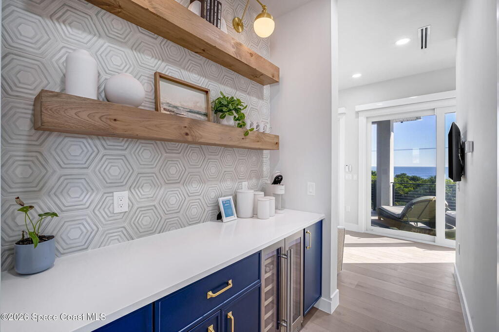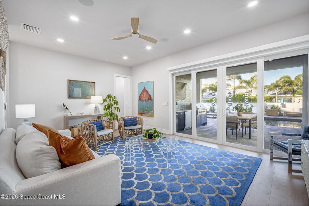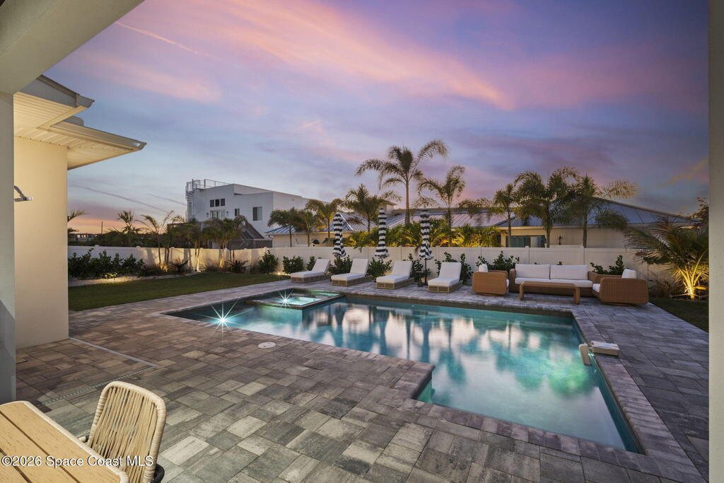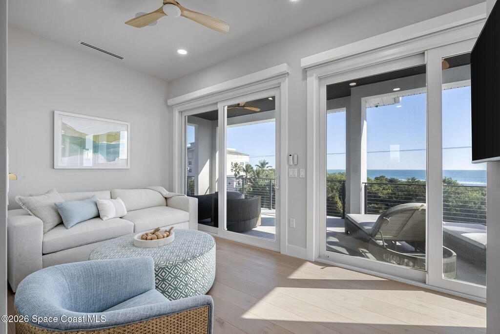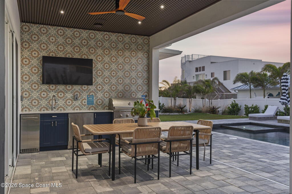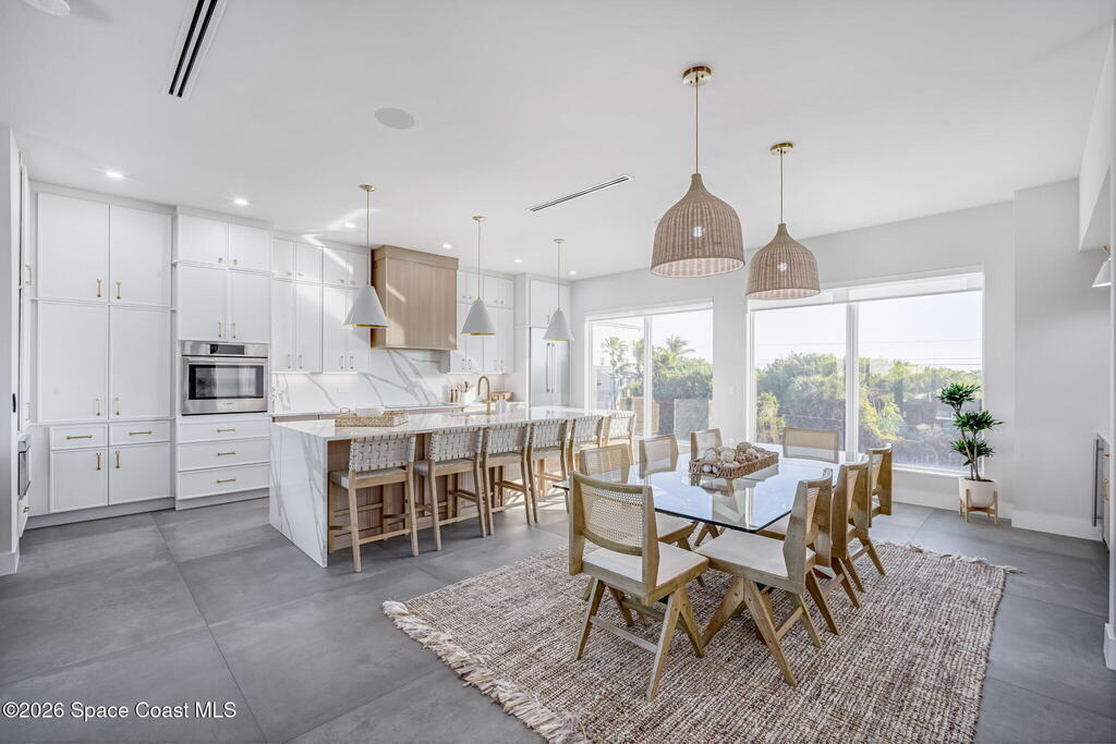Experience the future of luxurious beachside living in South Cocoa Beach. Just steps from the sand with ocean views and state-protected oceanfront, this brand-new construction leaves no stone unturned. The flexible design is ideal as a weekend escape, full-time residence, or high-performing short-term rental. Indoor-outdoor living begins on the ground level, where oversized sliders open to a covered patio, summer kitchen, and Palm Beach-inspired pool, spa, and lounge area--perfect for entertaining or unwinding after a day at the beach. An elevator carries you to the second-floor living space, featuring a spacious family room and designer kitchen with high-end Bosch appliances, sleek Calacatta quartz, and refined coastal finishes. The third-floor primary suite offers river views to the west and blue ocean views to the east from your private balcony--perfect for sunrise coffee or sunset relaxation. Located within two miles of downtown dining, beach bars, and family entertainment!