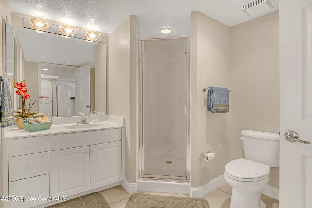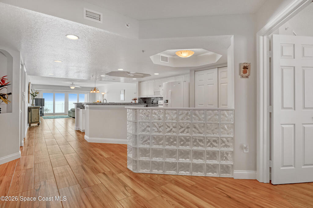Beautiful top-floor condo with direct ocean views and an open, airy layout. This 3-bedroom, 2-bath residence showcases breathtaking beachfront vistas and an inviting open floor plan ideal for coastal living. Impact sliders and tile flooring define the spacious living and dining areas, opening to a private balcony overlooking the ocean. The kitchen features a large breakfast bar, kitchen island, granite countertops, white cabinetry, and white appliances--perfect for entertaining while enjoying the view. The primary suite is a serene retreat with private balcony access, dual walk-in closets, and an ensuite bath offering double sinks, a tile shower, and a jetted soaking tub. Two additional bedrooms provide quiet comfort, one with direct access to the second bath accented by finishes and tile. Condo offers a private walled one- car garage. Residents enjoy premium amenities including a heated community pool, ocean-view fitness center, and exclusive private ocean access.