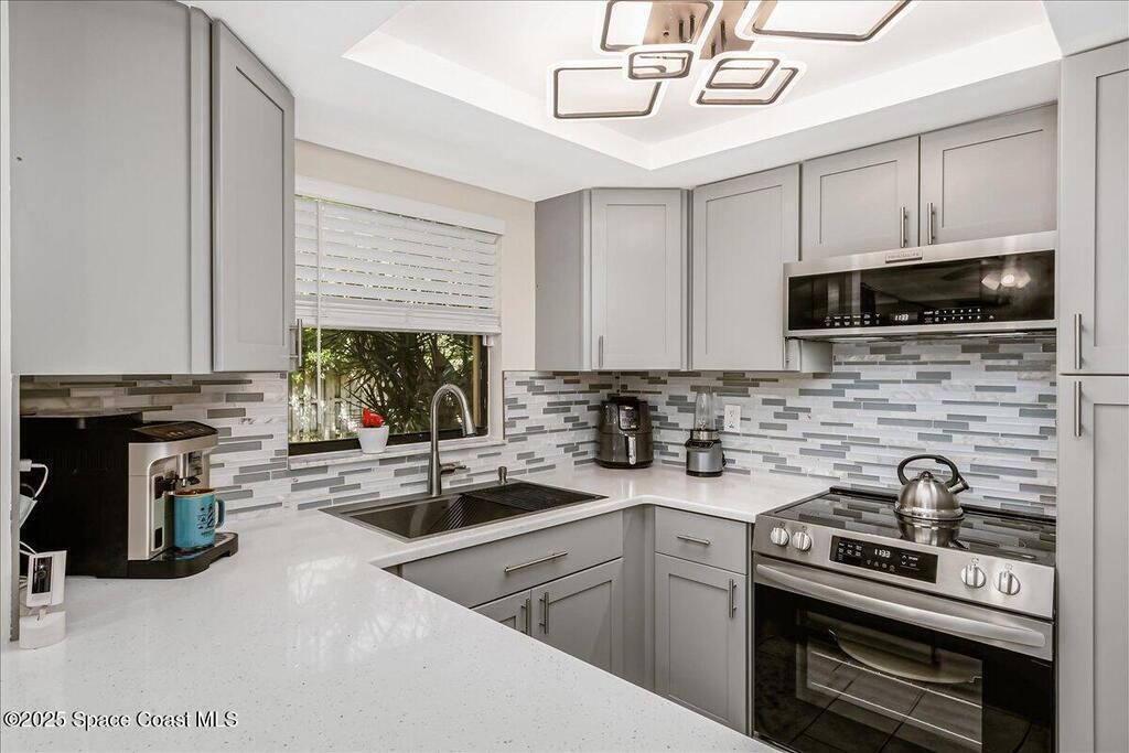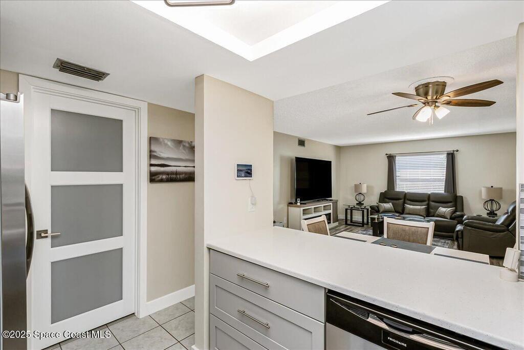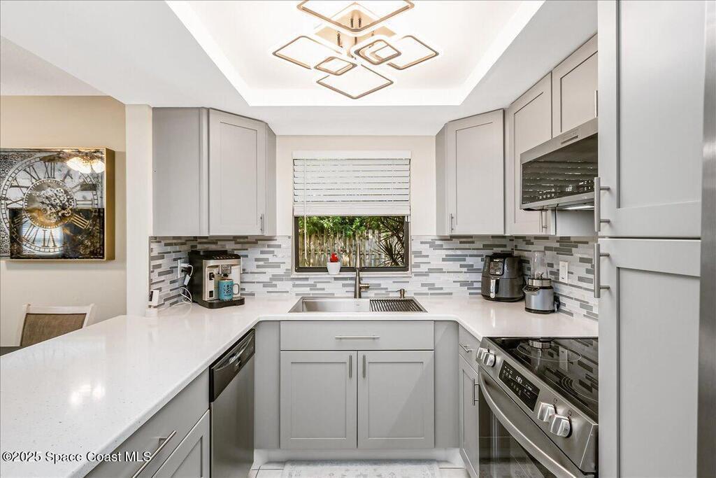 Welcome to 586 N Wickham Rd #63, a beautifully updated ground floor condo located in the heart of Melbourne. As you step through the front door, you'll be greeted by brand new six-inch baseboards, luxurious vinyl wood plank flooring, and fresh paint throughout. The modernkitchen is a chef's dream, featuring all-new cabinets with soft-close drawers, sleek stainless steel Frigidaire appliances, a stunning tile backsplash, and quartz countertops, complemented by a farmhouse-style deep sink. The adjacent indoor laundry room hosts a full-size washer and dryer for added convenience. The master suite and guest bedroomboth boast custom-designed storage closets, providing ample space for all your belongings.