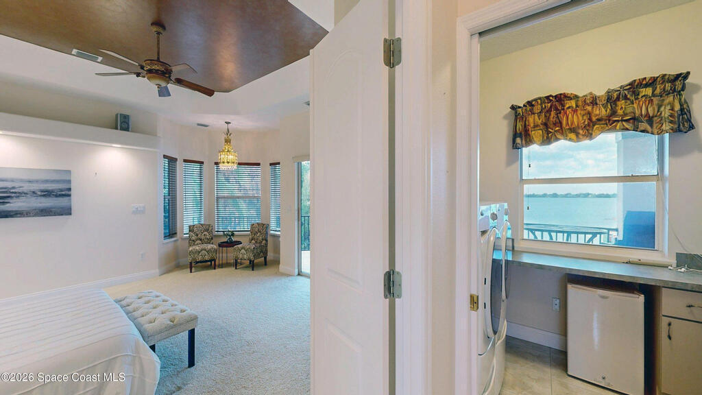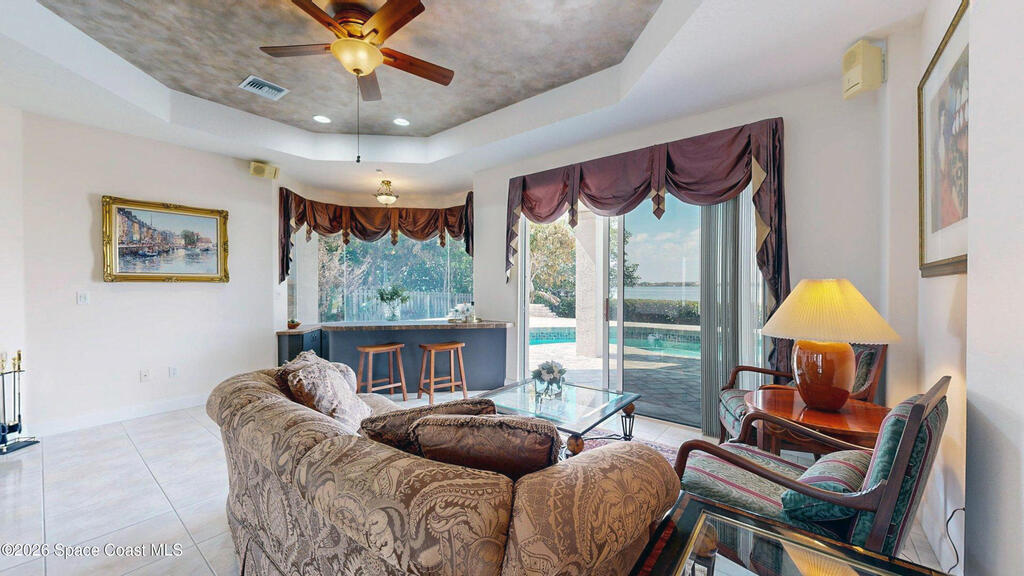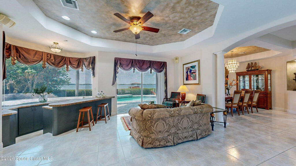 Welcome home to Tortoise Island! BEST RIVER VIEWS IN THIS COMMUMITY! 4 BED PLUS OFFICE and Bonus Room where luxury meets tranquility. Bathed in natural light, featuring soaring ceilings and panoramic water views from nearly every room. The gourmet kitchen, perfect for entertaining flows into a spacious living area. Complete with a wet bar and mini fridge and a Bose stereo system throughout the downstairs! Wander down to your own private oasis, featuring a modern deck and secure floating dock that makes launching kayaks, fishing, or docking your boat effortless. This home isn't just a place to live; it's a lifestyle, combining the peacefulness of nature with easy access to your aquatic adventures. Located on the north side of Loggerhead Island Drive is considered the most desirable street to live on in Tortoise Island due to quiet cul de sac. With ample space for family and guests, this meticulously maintained home offers a rare opportunity for unparalleled waterfront living