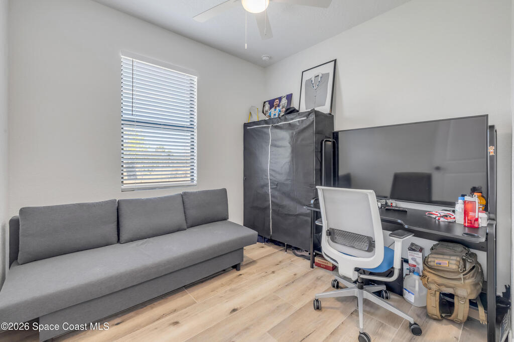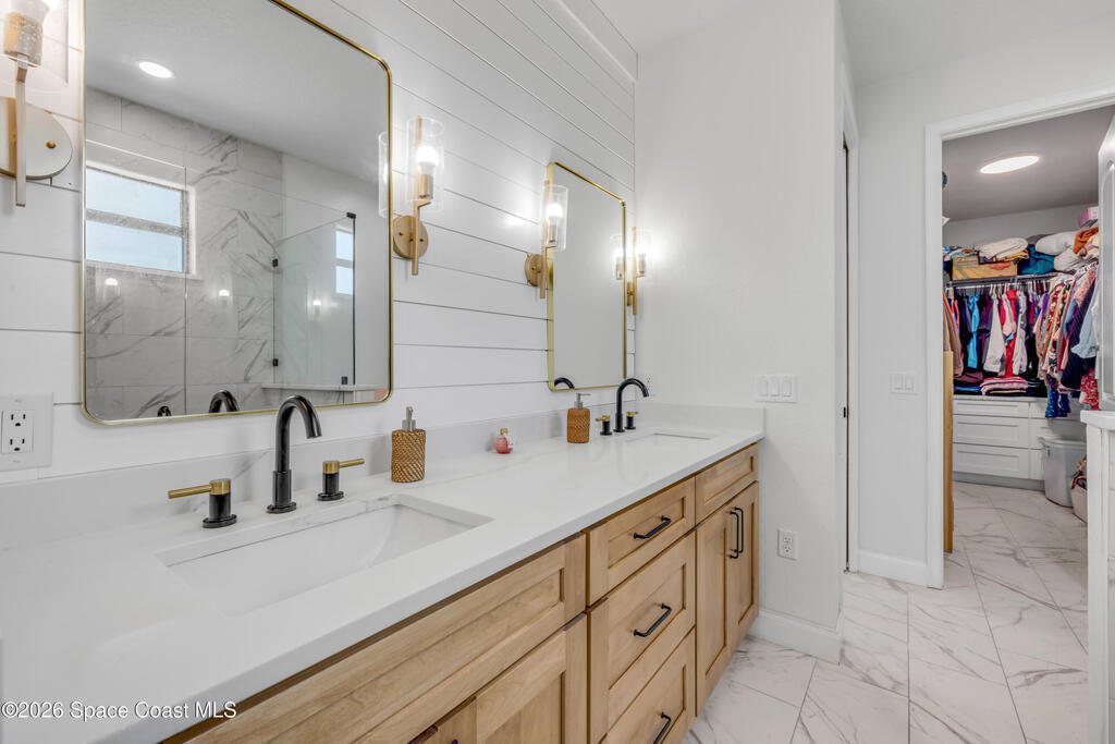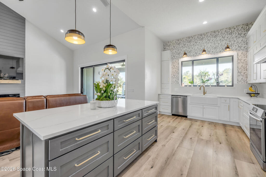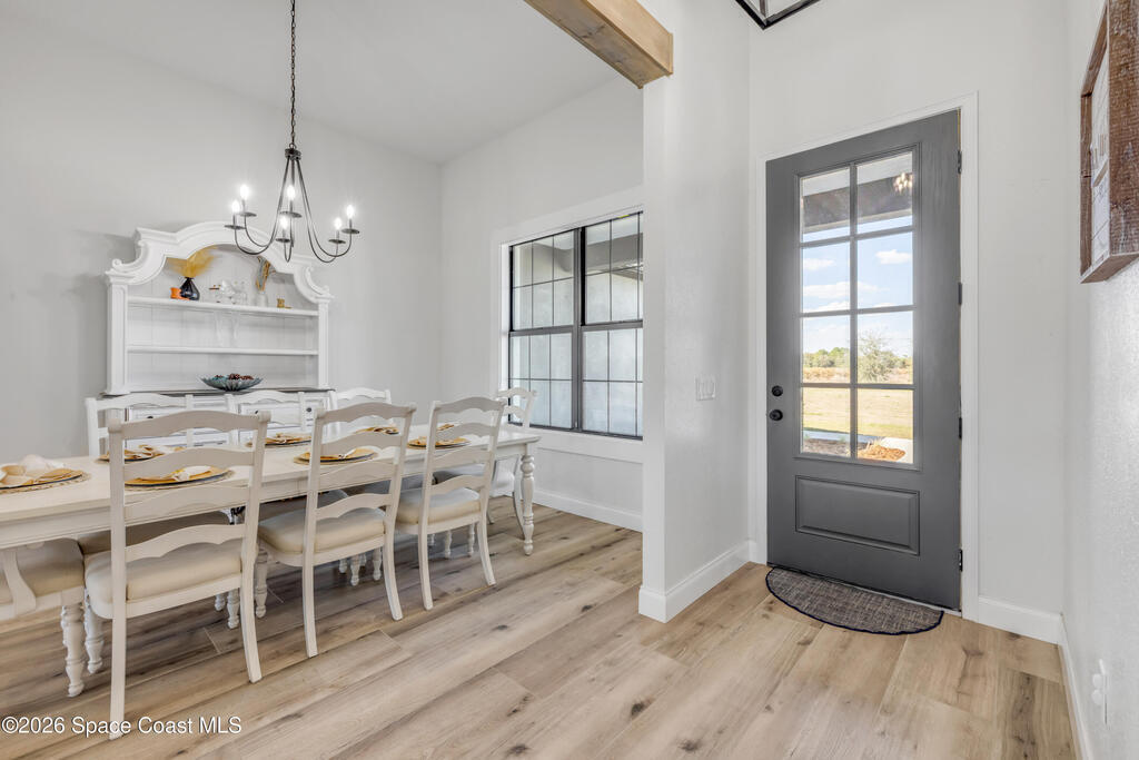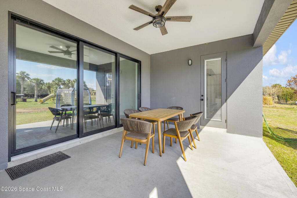 Discover luxury and space on this stunning 5-bedroom, 3-bathroom home in Mims, Florida. Built in 2024, this 2,340 sq. ft. residence sits on 3 private acres featuring a serene pond, gated entry to the property, a 3-car garage with ample cleared land for outdoor enjoyment and, a 23 ft x 39 ft detached garage/workshop. Inside, modern tile flooring and cathedral ceiling highlight an open floorplan. The living room features an electric fireplace and a 3-panel sliding glass door that opens to the outdoors. The chef's kitchen impresses with stainless steel appliances, a striking backsplash, a statement range hood, and a walk-in pantry with extra counter space perfect for a coffee bar. The primary suite offers tray ceilings, dual sinks, a walk-in shower, and a spacious closet. Outdoors, the expansive yard invites relaxation and entertaining. Tucked away on a quiet dead-end road, this property provides privacy while remaining minutes from highways and the coast.