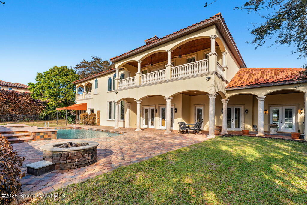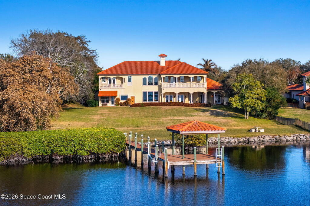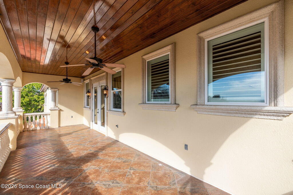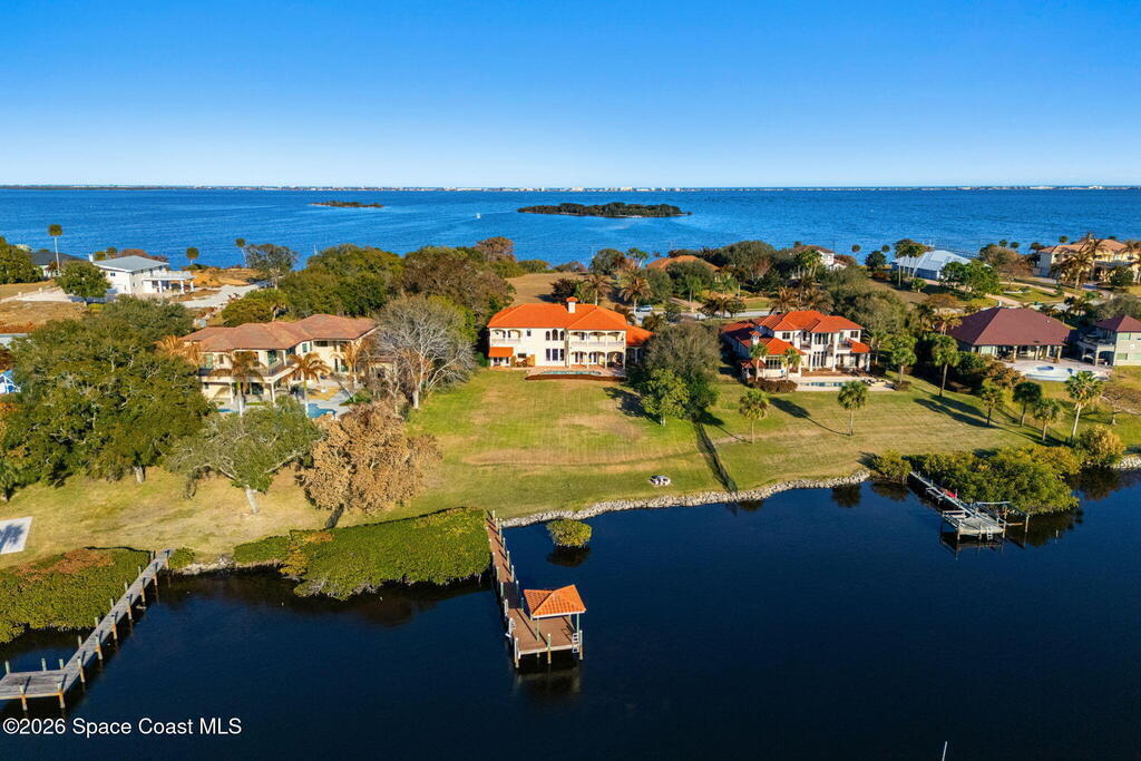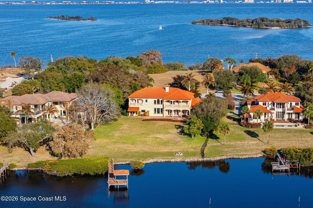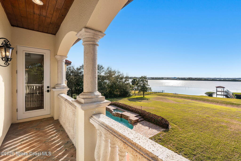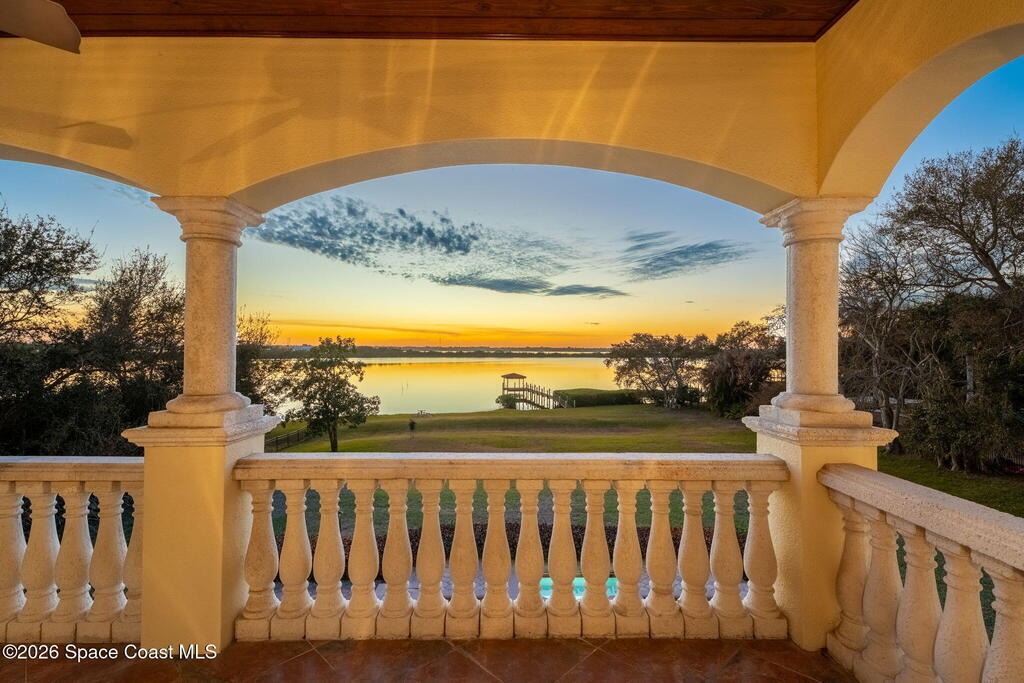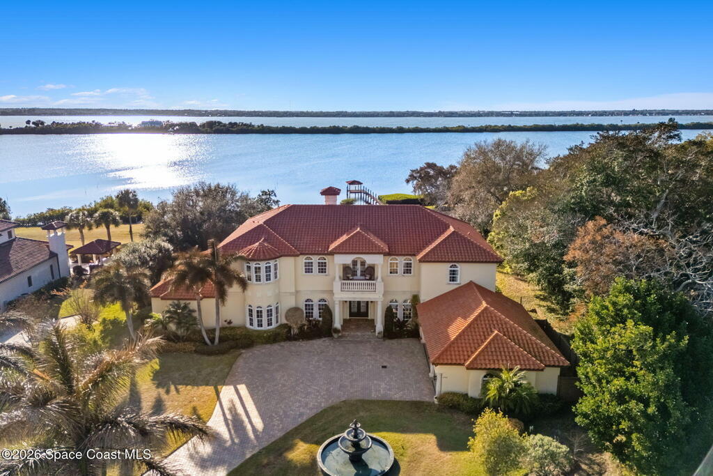 With 150 feet of direct river frontage and set on 1.15 high elevation acres, this custom concrete block estate commands its position along the protected waters of Honeymoon Lake with access to the Indian River. The private dock offers water, electric, and approximately four feet of depth, delivering both protection and navigability in one of Merritt Island's more discreet waterfront settings.Hurricane rated PGT impact windows and doors are installed throughout, immediately reinforcing the quality of construction. Built with durability and longevity in mind, the residence offers over 6,300 square feet of interior living space and nearly 8,700 total square feet under roof.The architecture makes a statement from the moment you arrive. Structural Roman columns, exterior stone detailing, and an illuminated fountain anchor the approach.