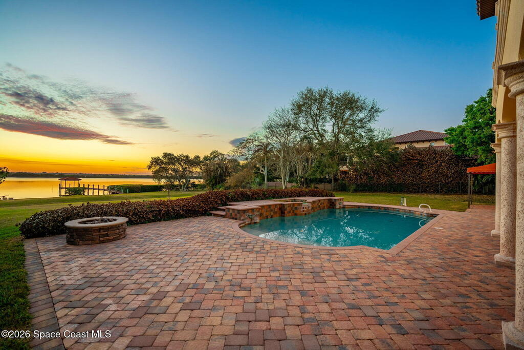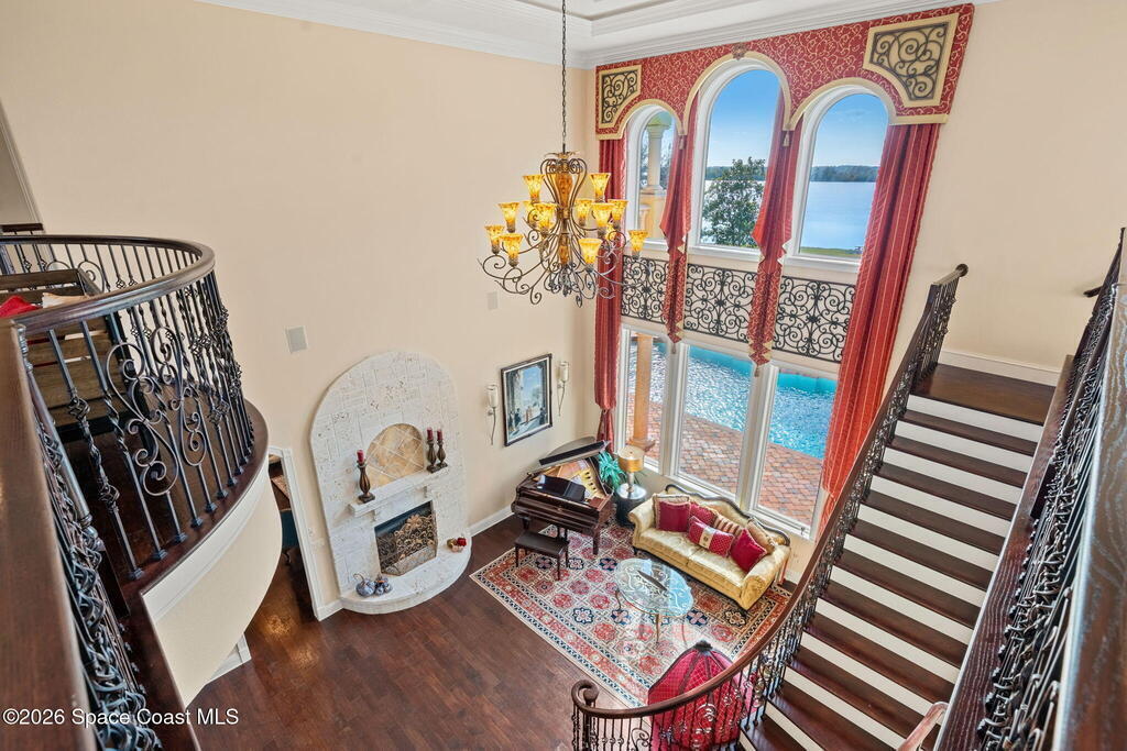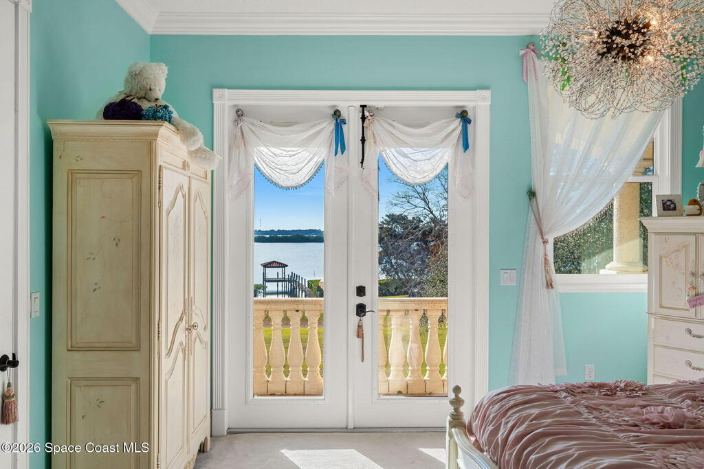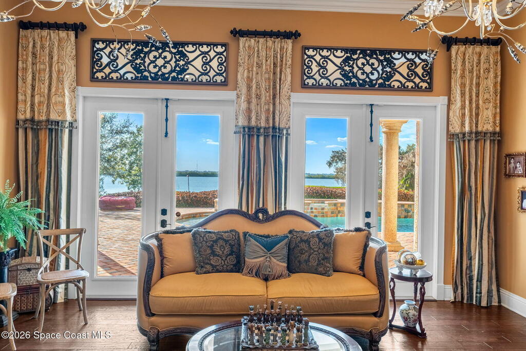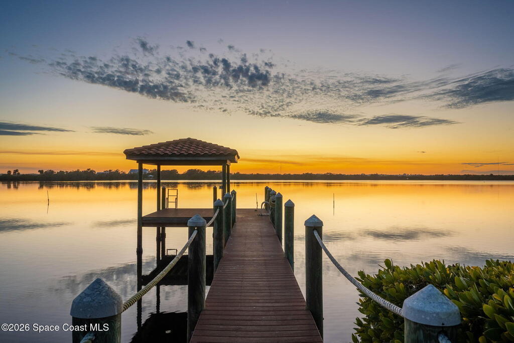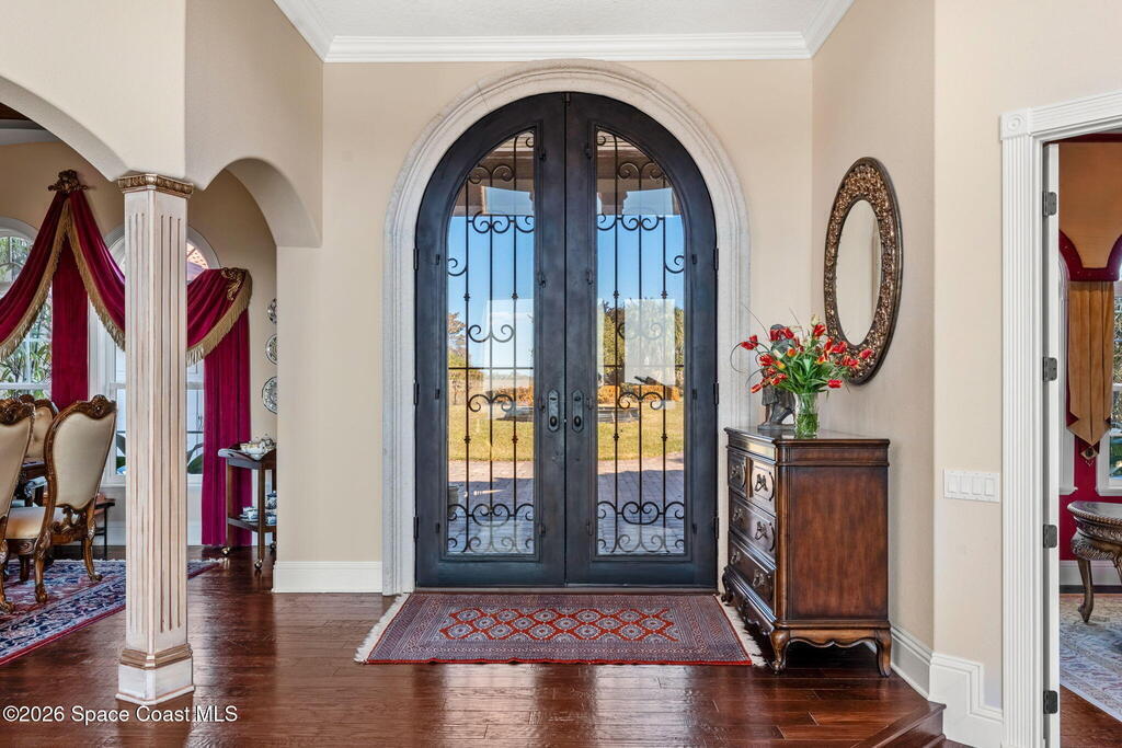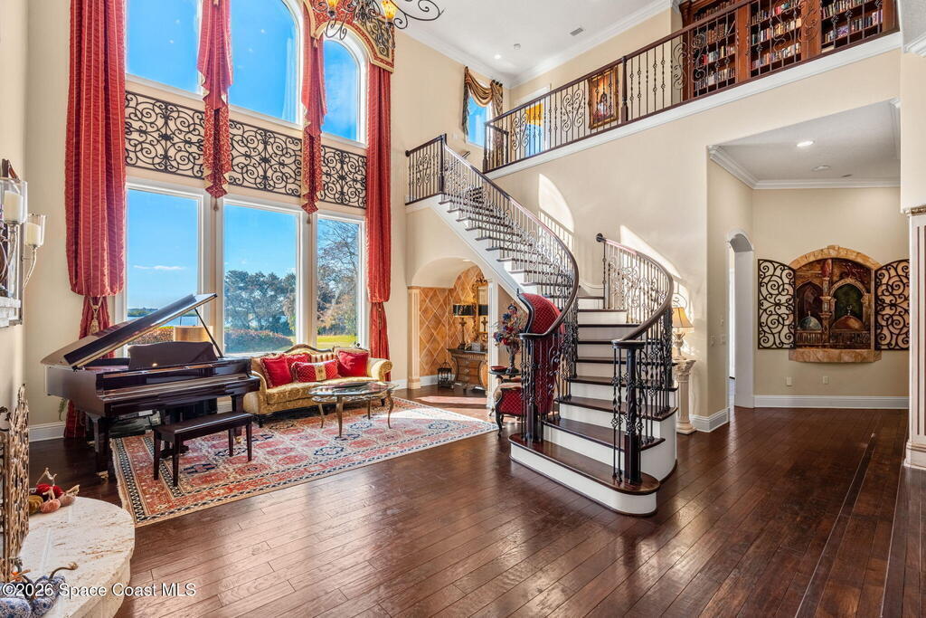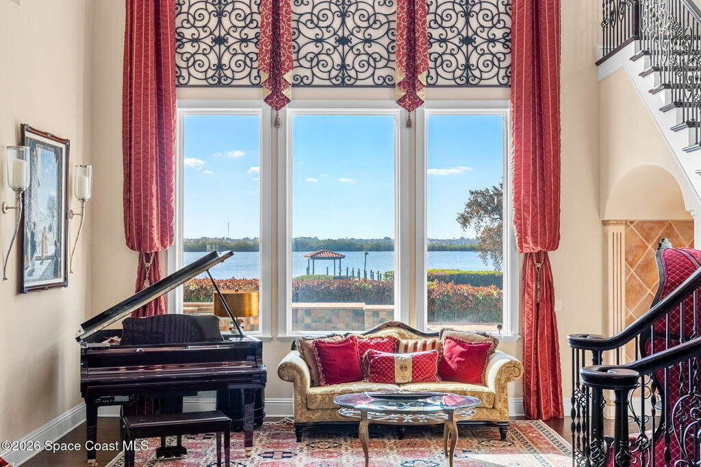 With 150 feet of direct river frontage and set on 1.15 high elevation acres, this custom concrete block estate commands its position along the protected waters of Honeymoon Lake with access to the Indian River. The private dock offers water, electric, and approximately four feet of depth, delivering both protection and navigability in one of Merritt Island's more discreet waterfront settings.Hurricane rated PGT impact windows and doors are installed throughout, immediately reinforcing the quality of construction. Built with durability and longevity in mind, the residence offers over 6,300 square feet of interior living space and nearly 8,700 total square feet under roof.The architecture makes a statement from the moment you arrive. Structural Roman columns, exterior stone detailing, and an illuminated fountain anchor the approach.