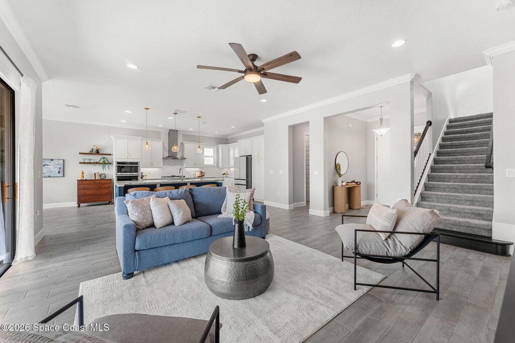 Experience the Pinnacle of Viera Living~Skip the wait for new construction with this impeccably maintained, 3 year old executive estate. Nestled in the heart of West Viera this two-story masterpiece blends sophisticated design with ultimate peace of mind featuring two living spaces, 4 bedrooms, 3.5 baths and spacious split garages. The chef's kitchen is a showstopper, boasting rich navy and white cabinetry, stunning granite countertops, and upgraded appliances. Retreat to an oversized primary suite featuring a ''to-die-for'' custom walk-in closet and spa-like bath w/glass-enclosed shower and dual sinks. Highlights include: Impact glass windows, 8-foot doors, neutral tones, wood-look tile, and custom closets in all bedrooms. Enjoy Outdoor living? An extended paver back patio, added green space distancing nearby homes & an additional side fenced courtyard all offer the perfect space for play, privacy or entertaining with ample room to add your dream pool. Prime Location...(see more..)