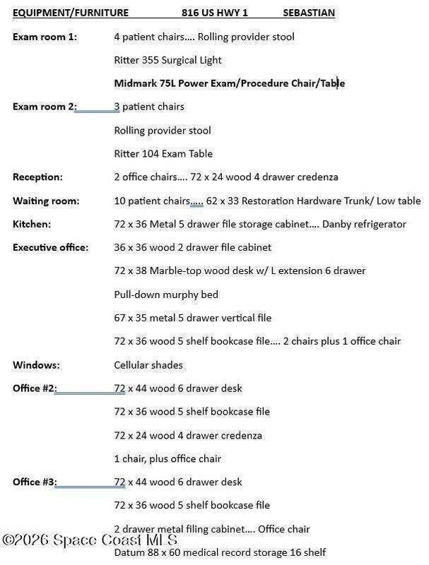 Excellent opportunity to purchase an 1,800 SF turnkey medical office in the heart of Sebastian! Interior includes a reception with checkin/out, waiting room, 2 plumbed exam rooms, 3 offices, a break room and 3 restrooms (1 with shower). Finishes include drop ceiling throughout; mix of carpet, tile and vinyl flooring. Utilities include Water, Septic (pumped 2024), and FPL electric. There are 14 asphalt paved/striped/illuminated parking spaces. Traffic count is est. 22,000 VPD on US1. Property is strategically positioned directly on US1 approximately halfway between the Indian River County Line and the Wabasso Causeway. Orlando Health Sebastian River Medical Center, Cleveland Clinic Indian River Hospital and the Vero Beach Regional Airport are a short drive away. Lots of golfing, waterfront dining and boating nearby. Make this the future home for your business today!