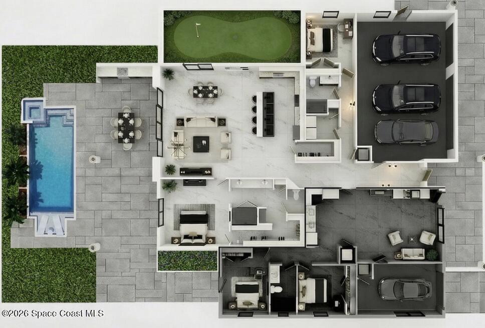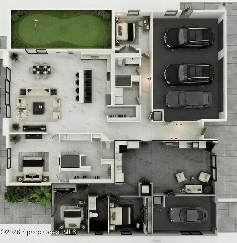 This stunning smart home sits on 1-acre offering the perfect multi-generational living experience with 4 spacious bedrooms and three baths. Enjoy luxurious amenities, including a modern kitchen with quartz countertops, a built-in icemaker, custom cabinets, a hidden coffee bar, and a large walk-in pantry. The main living area features soaring 12-foot ceilings, while the in-laws' side has cozy 9.4-foot ceilings. Entertain outdoors with a summer kitchen, propane gas fire pit, sparkling heated pool, and hot tub. Safety is enhanced with IMPACT windows. The home boasts a total of four garages: three on the main side and one for the in-laws' suite, with a lift ready for a fifth vehicle. A durable metal roof, double-paned insulated wall and door in the primary bedroom, and tile flooring throughout ensuring comfort and efficiency. The spacious kitchen and living area are perfect for gatherings, while a mini putting green adds recreational fun. This home embodies luxury and family togetherness