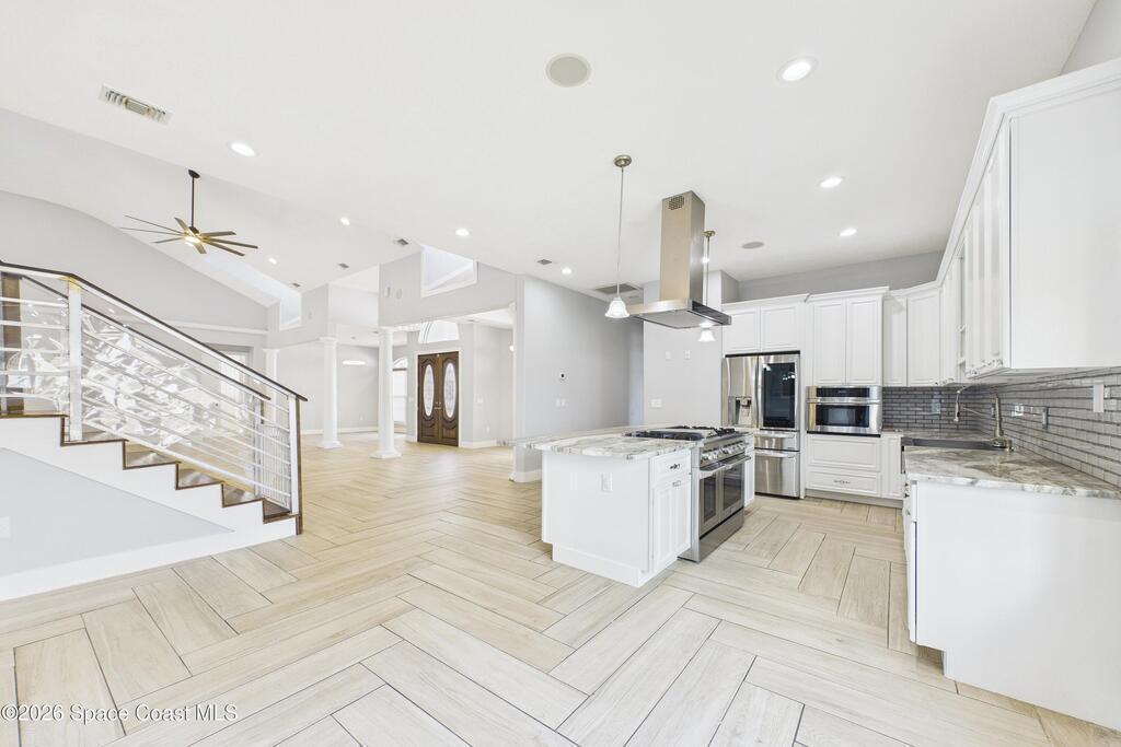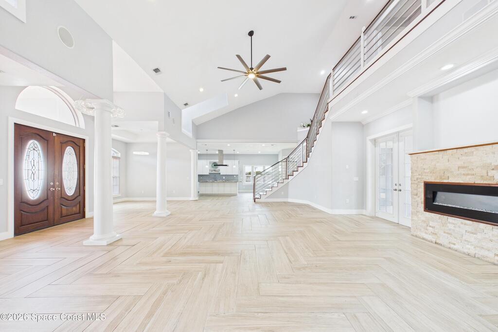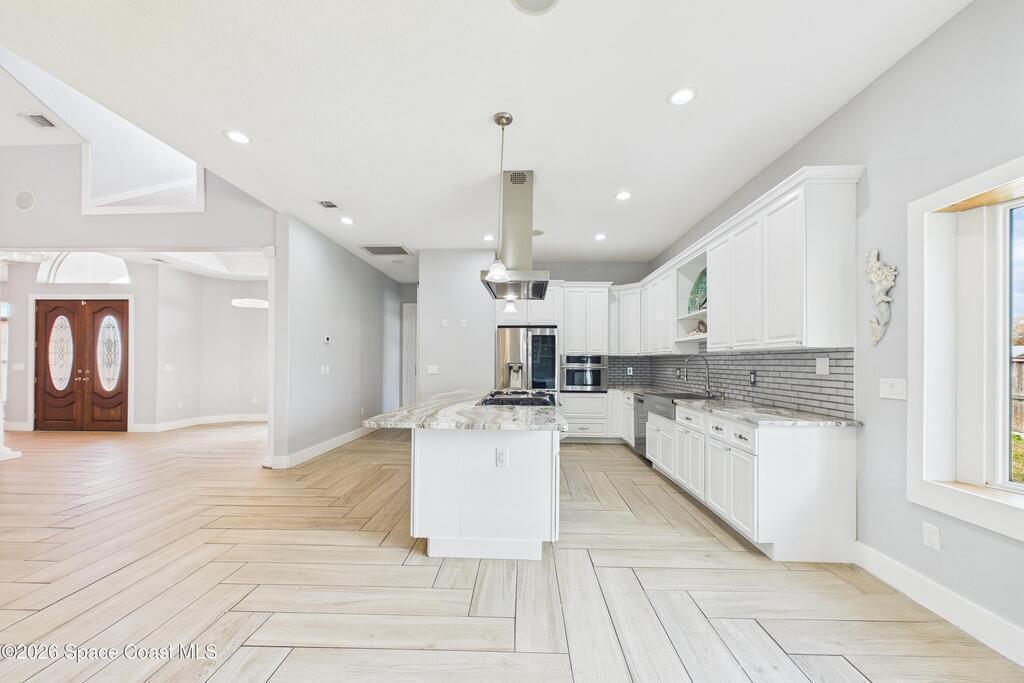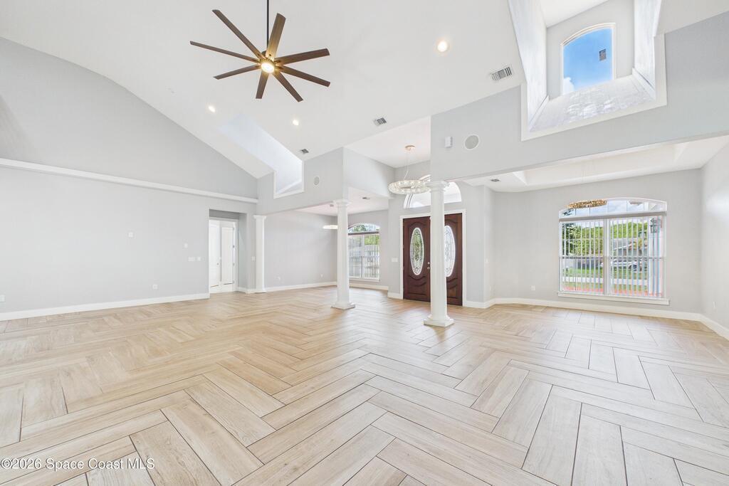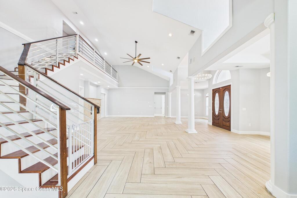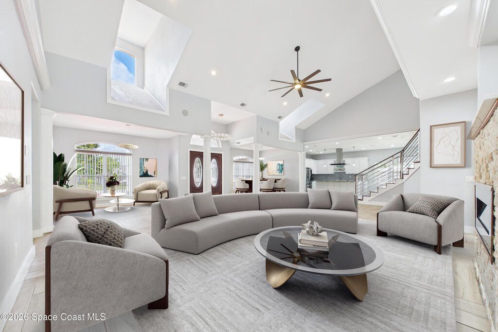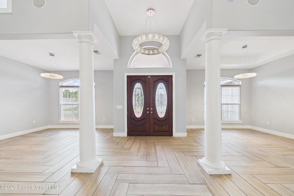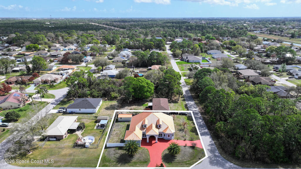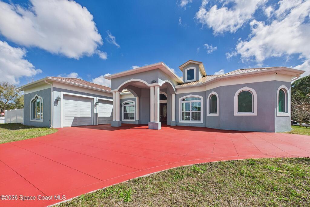 *Some photos digitally staged* Welcome to an exceptional opportunity in the heart of Palm Bay- a beautifully designed 2020 custom home that blends modern luxury, space, and functionality on a generous corner lot.From the moment you arrive, the home's circular driveway, expansive lot, and impressive two-story presence create undeniable curb appeal. Step inside and you'll immediately notice the soaring ceilings, open-concept design, and abundant natural light that make the home feel both grand and inviting.The centerpiece of the home is the chef-inspired kitchen, thoughtfully designed for both everyday living and entertaining. Featuring a large island, breakfast bar seating, double ovens, gas range, and extensive cabinetry, this kitchen flows seamlessly into the main living and dining areas--perfect for hosting gatherings or enjoying relaxed evenings at home.