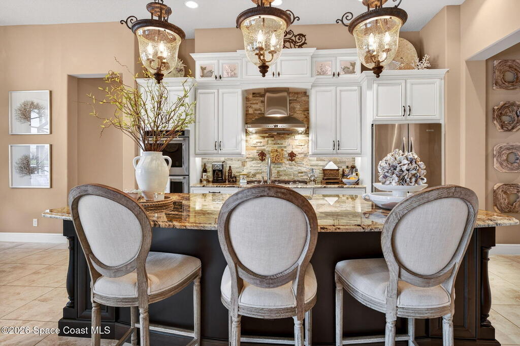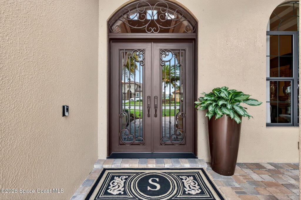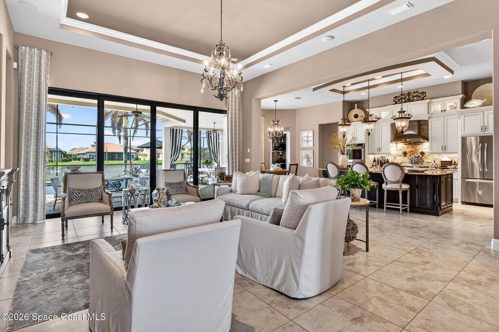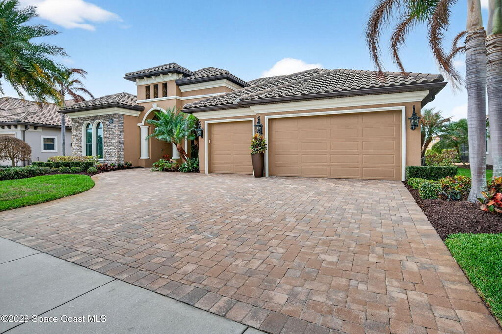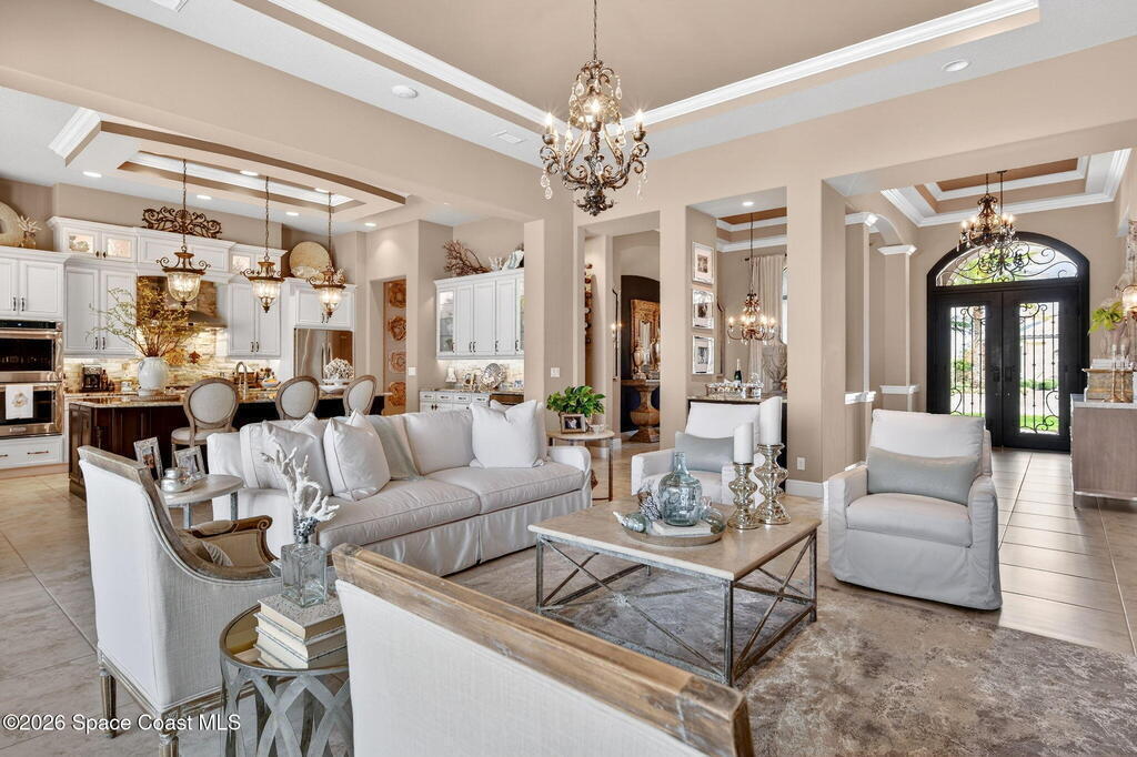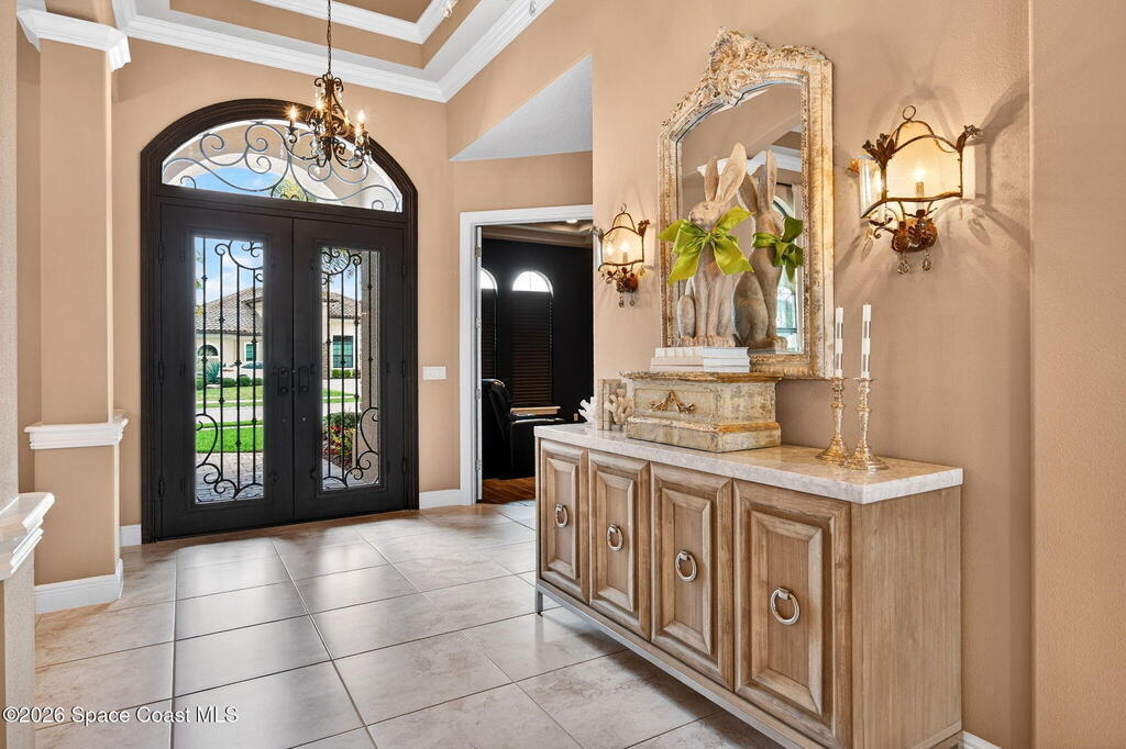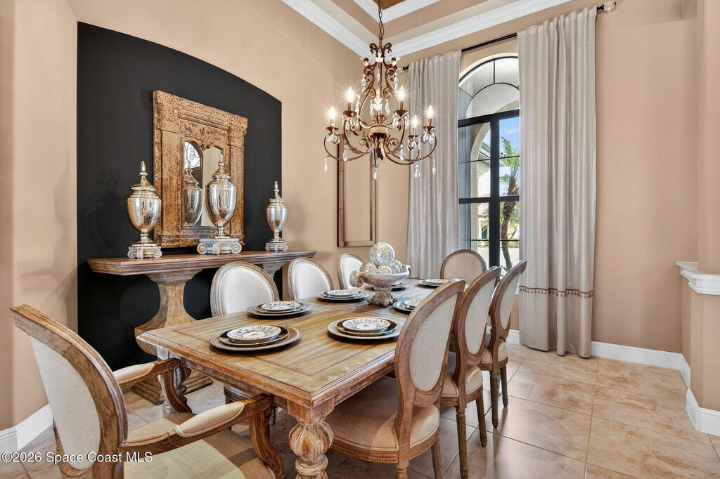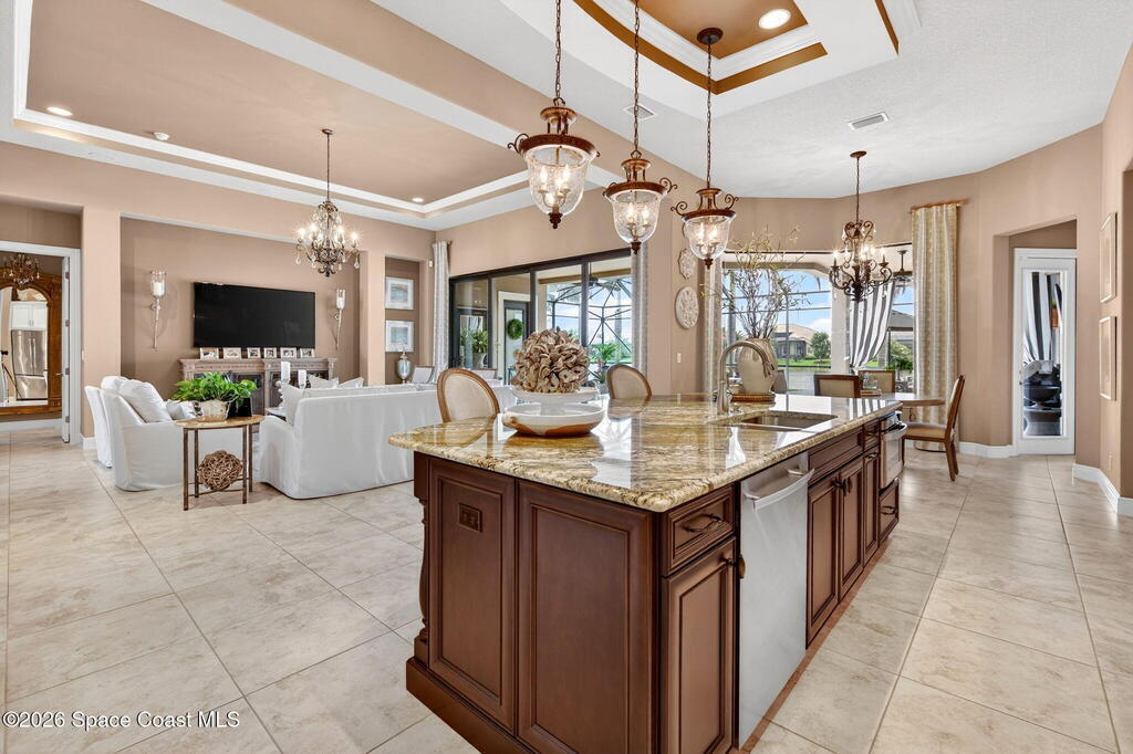 One of the most special homes in Viera has come to market for the first time ever. This home was custom built by one of Brevard's premier builders, and each phase of construction was meticulously monitored by the owner. The front of the home boast stacked stone accents, crown molding, corbels, and a raised covered entry framing the stunning Abbey Doors. Enter to a grand foyer defined by a tray ceiling w/crown molding & 2 decorative chandeliers. The view from the foyer is across the great room to the pool and lake beyond. The semi formal dining rm w/tray ceil. and double crown molding is illuminated by 2 recessed lights plus a beautiful chandelier. As you transition from the dining rm to the kitchen area you'll pass the built-in wine rack. The kitchen is the heart of the home, and this home has a lot of heart! Loads of beautiful cabinetry, some w/glass inserts and illuminated, extra deep drawers, a 5 burner gas cooktop with a stacked stone wall. Please click more.