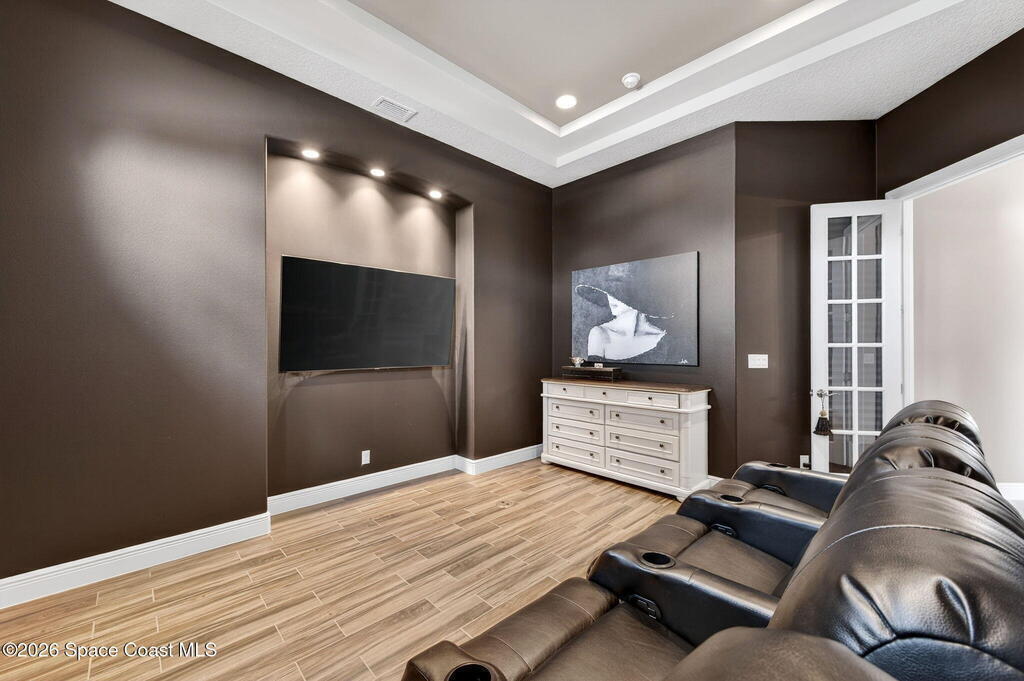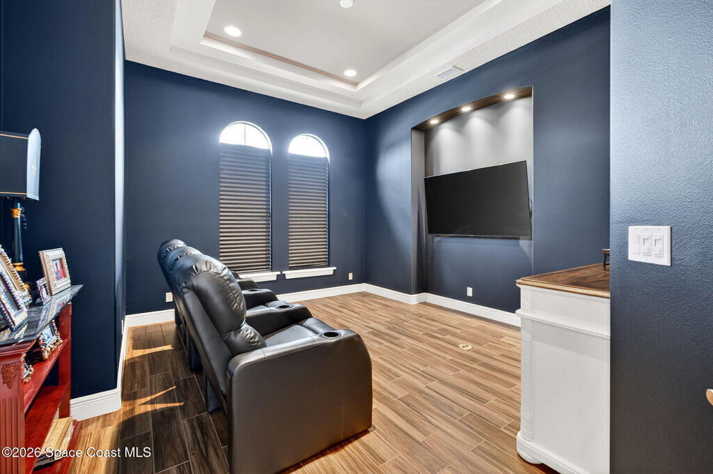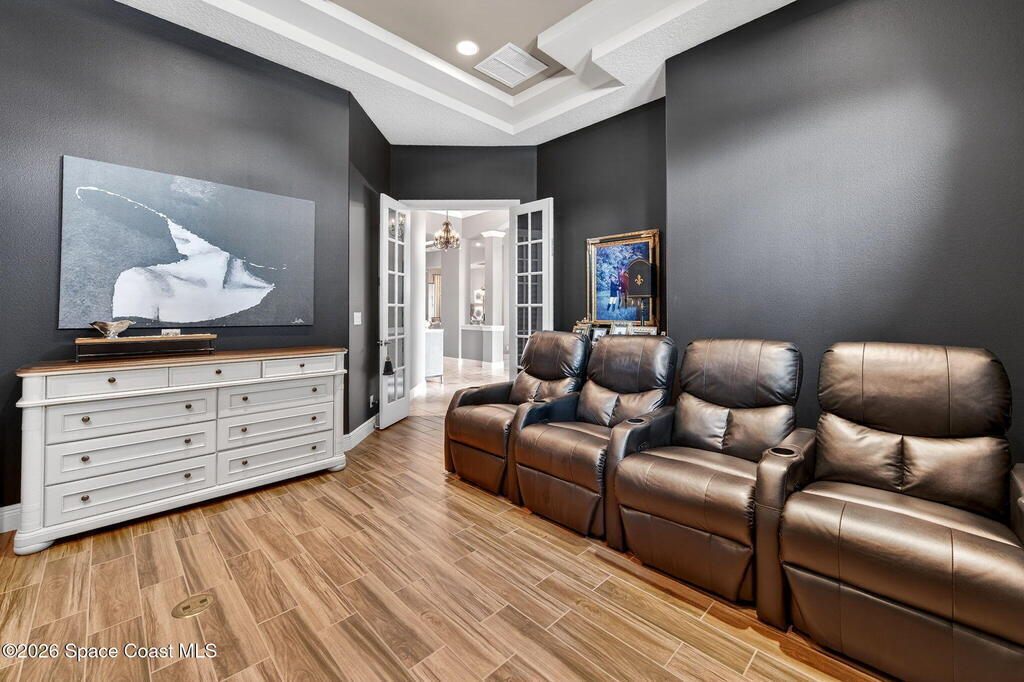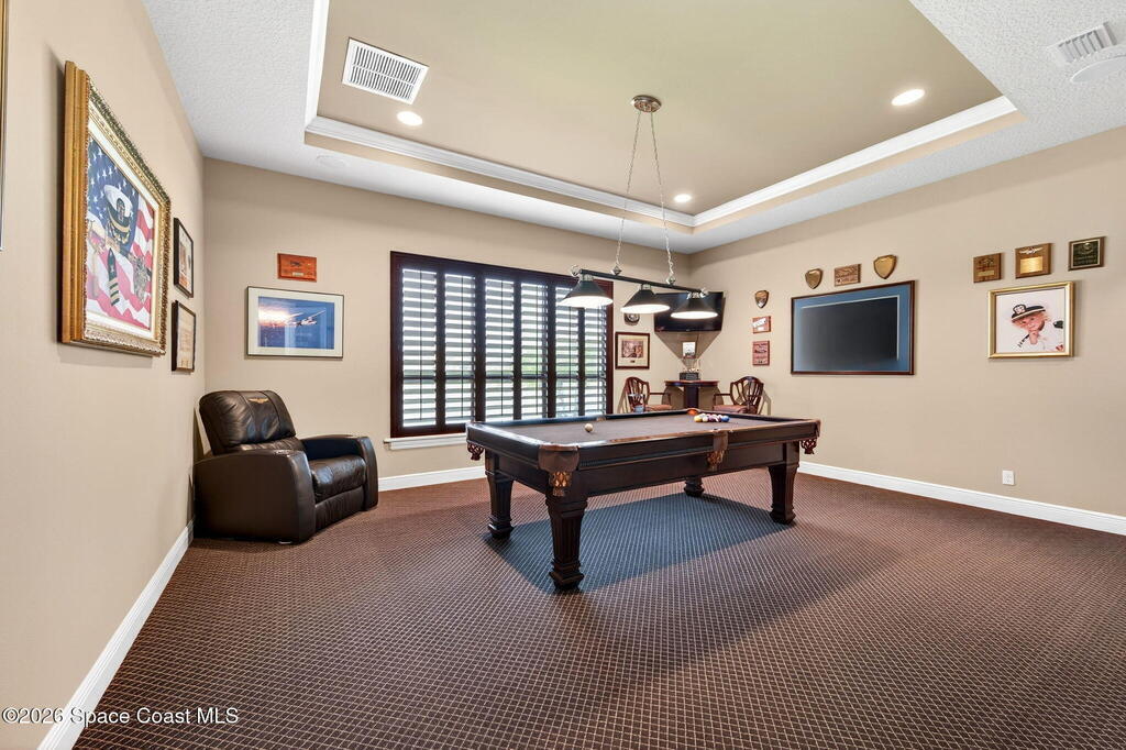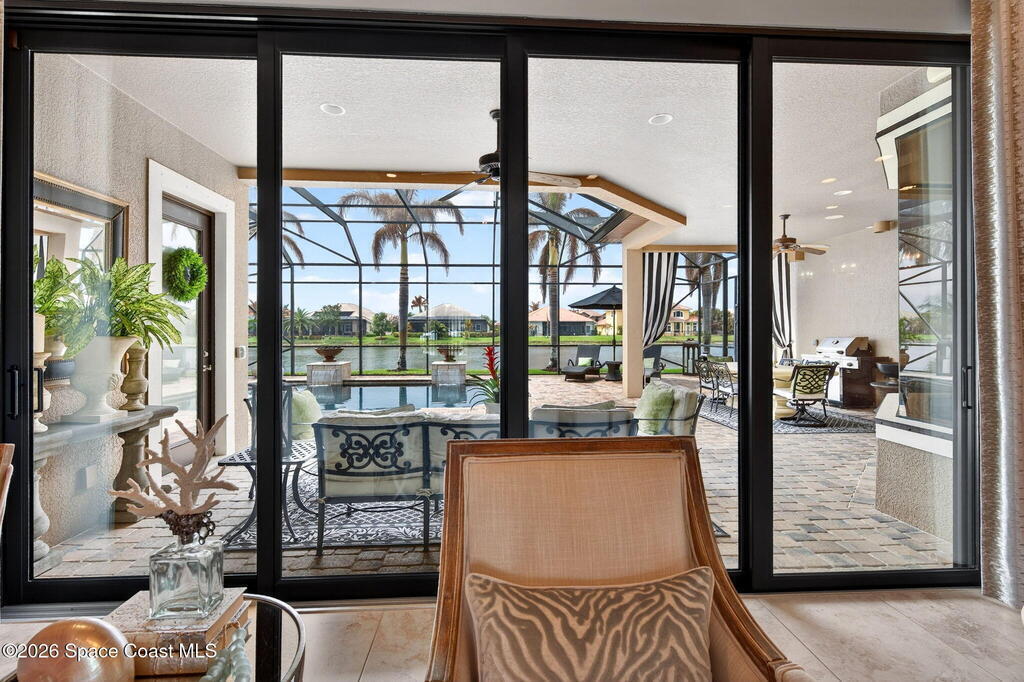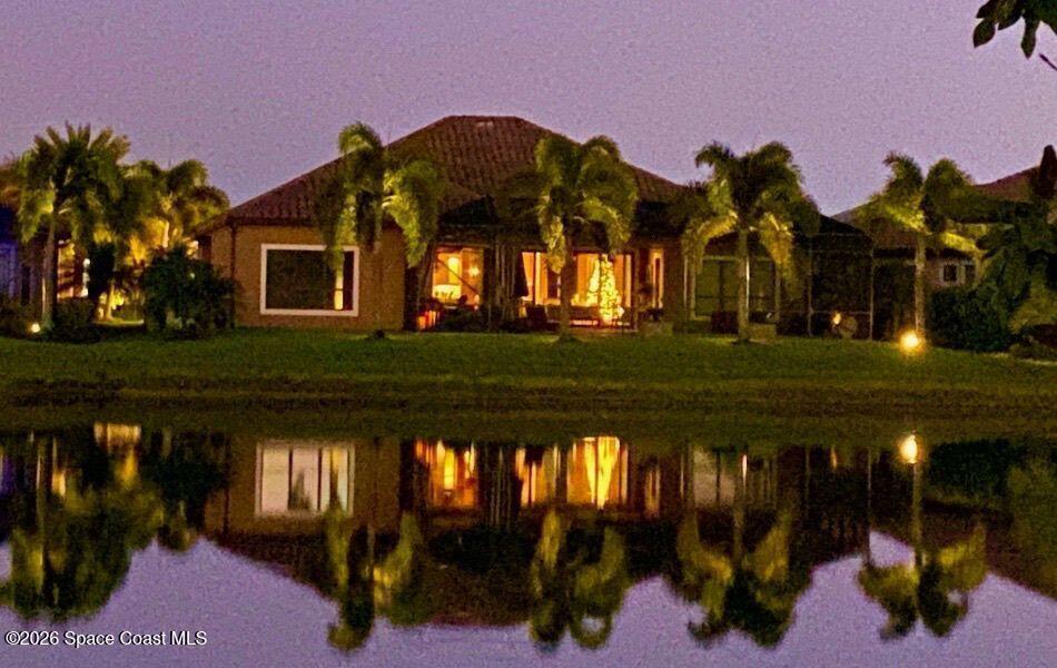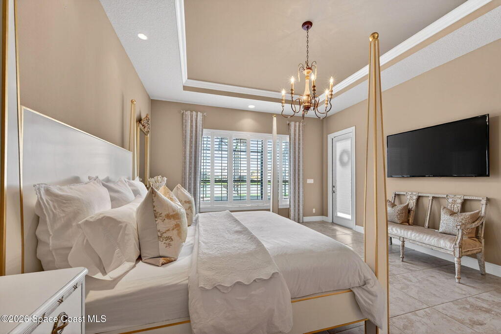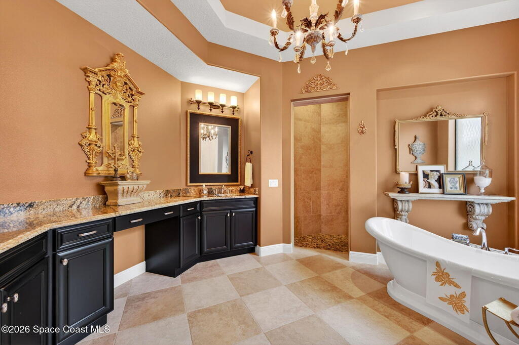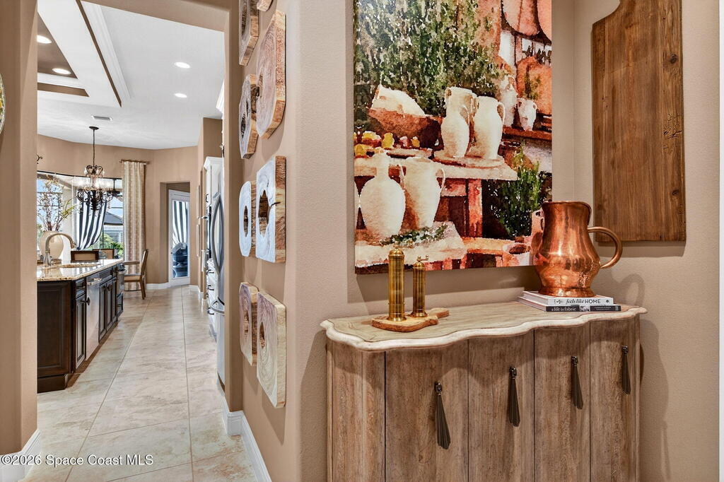 One of the most special homes in Viera has come to market for the first time ever. This home was custom built by one of Brevard's premier builders, and each phase of construction was meticulously monitored by the owner. The front of the home boast stacked stone accents, crown molding, corbels, and a raised covered entry framing the stunning Abbey Doors. Enter to a grand foyer defined by a tray ceiling w/crown molding & 2 decorative chandeliers. The view from the foyer is across the great room to the pool and lake beyond. The semi formal dining rm w/tray ceil. and double crown molding is illuminated by 2 recessed lights plus a beautiful chandelier. As you transition from the dining rm to the kitchen area you'll pass the built-in wine rack. The kitchen is the heart of the home, and this home has a lot of heart! Loads of beautiful cabinetry, some w/glass inserts and illuminated, extra deep drawers, a 5 burner gas cooktop with a stacked stone wall. Please click more.