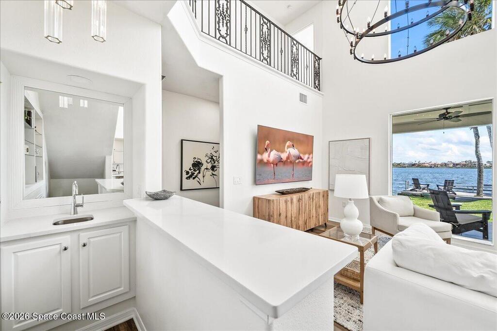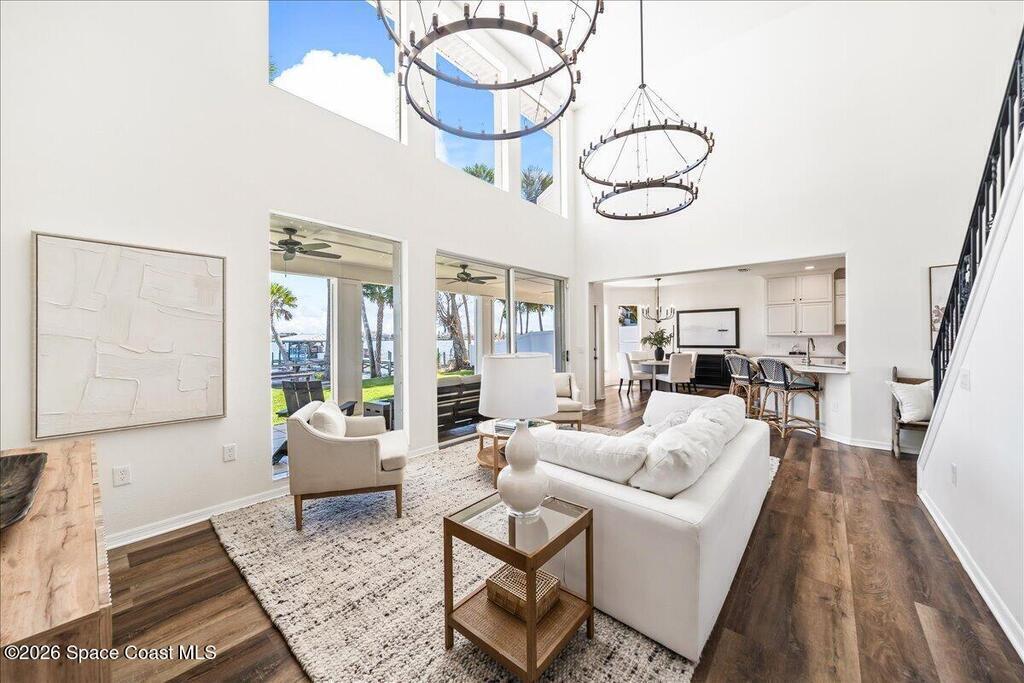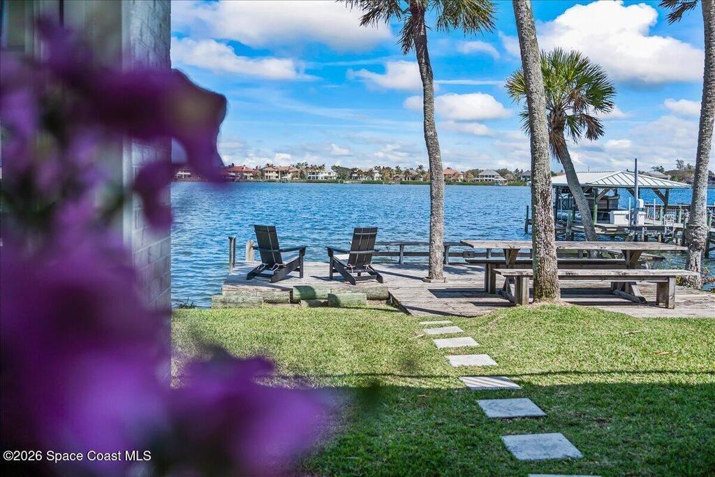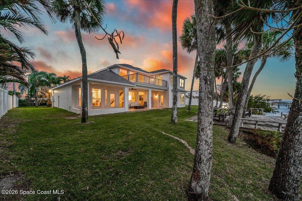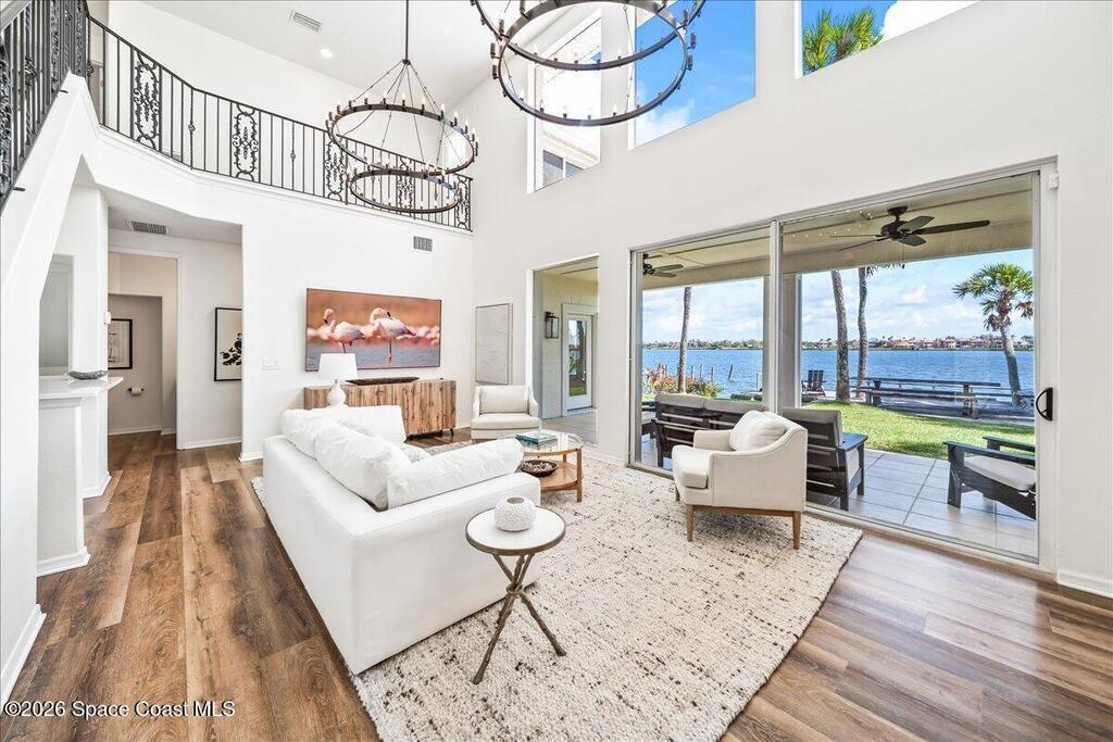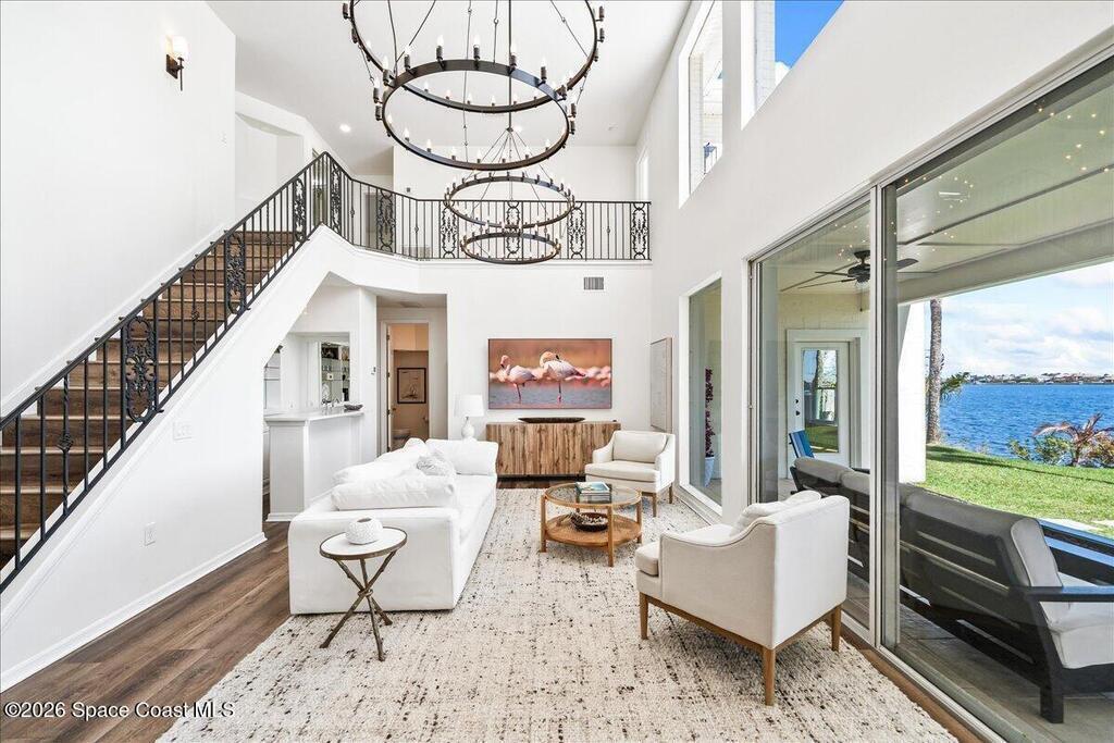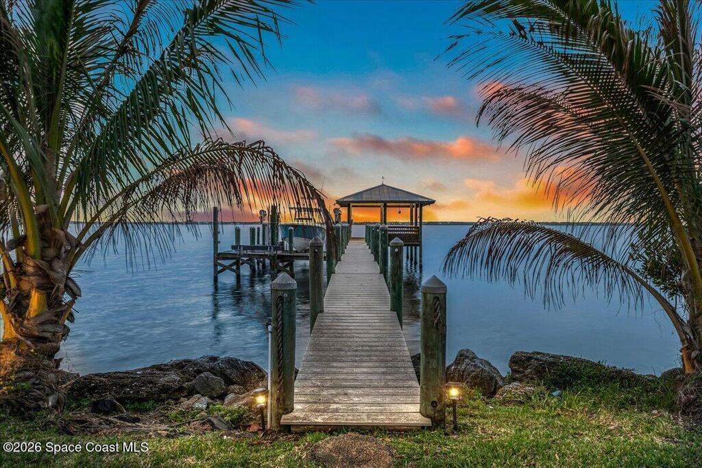 Discover true river-to-river living with over 200 feet of deep water frontage-more than 100 feet on both the Indian and Banana Rivers at this stunning, remodeled retreat. Privately set back on an oversized lot, this home offers 4 bedrooms plus a dedicated office, 3.5 baths, two spacious master suites, and a 3-car garage with ample guest parking. The upgraded kitchen features modern appliances and new countertops, while every bathroom showcases new modern tile and fixtures. Step outside to watch rocket launches from your balcony or take advantage of the 27,000 lb boat lift and jet ski lift with quick access to the Intracoastal and Atlantic. Enjoy a beautiful sunrise or sunset from nearly every room. Mature mango and avocado trees enhance the lush tropical setting, and beaches, dining, and shopping are just minutes away. Close to Melbourne International Airport and 45 min to Orlando. This home has it all! A rare opportunity for authentic Florida river- to- river waterfront living!