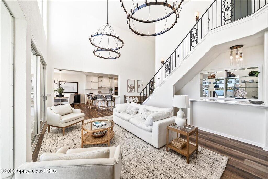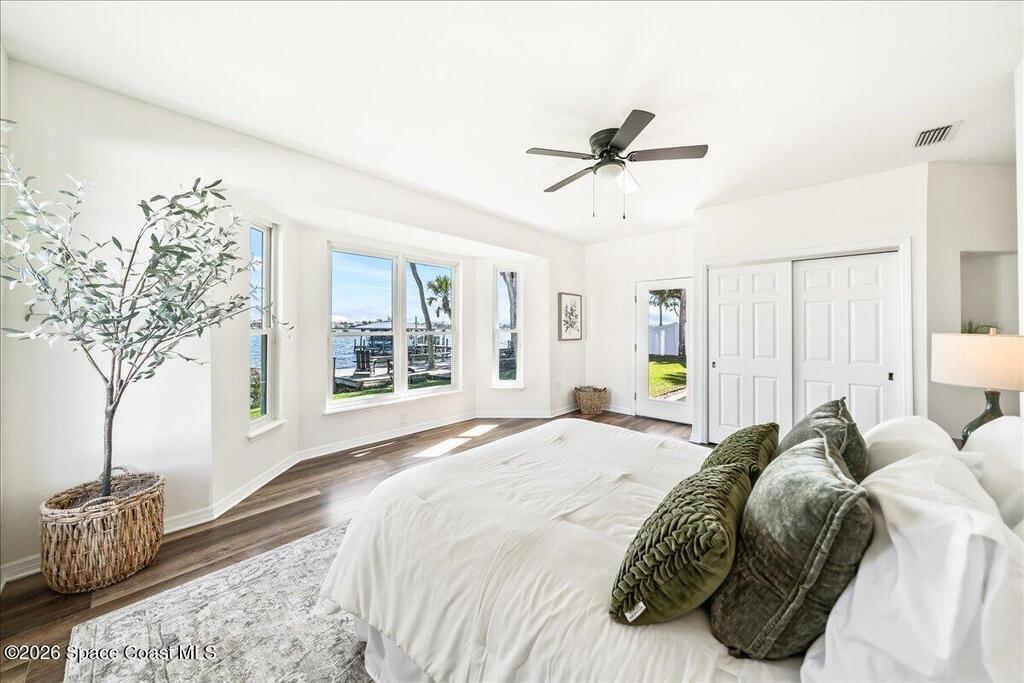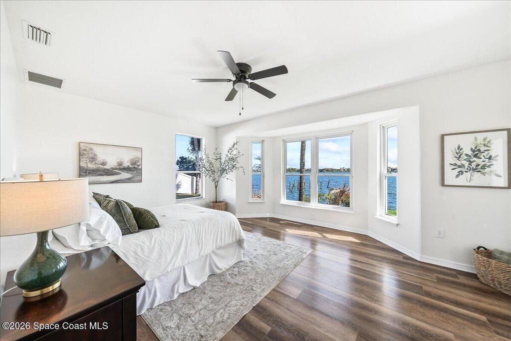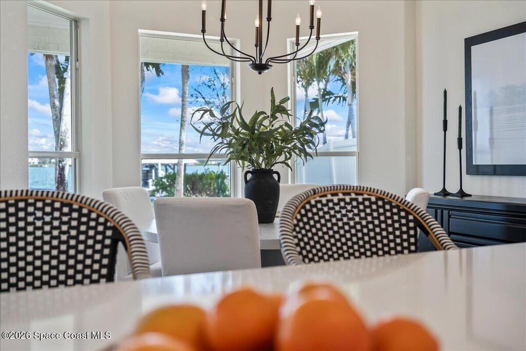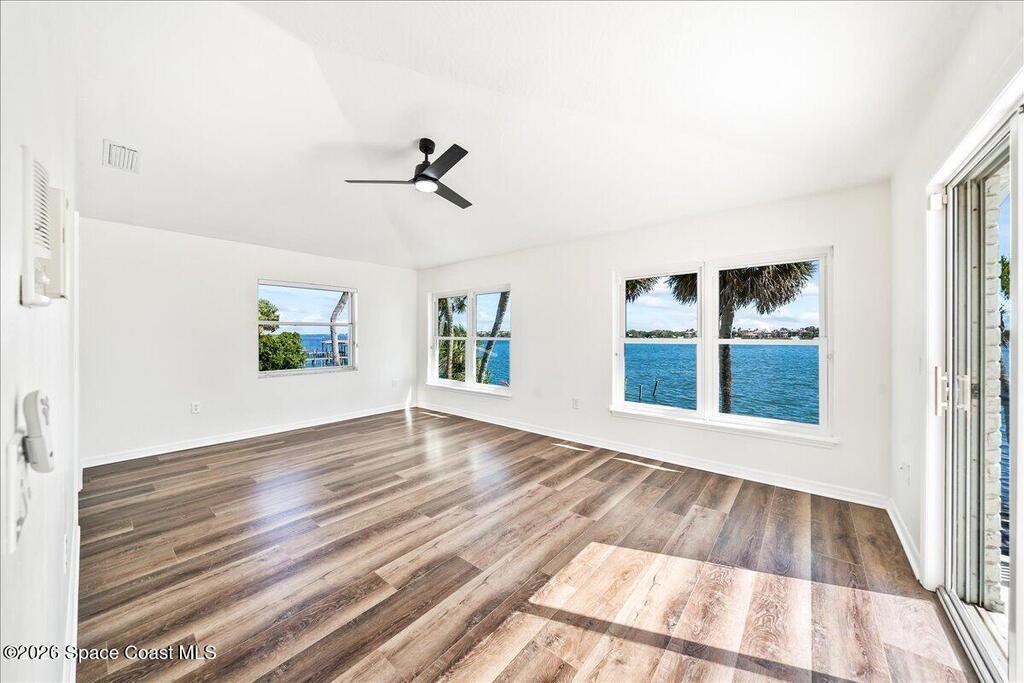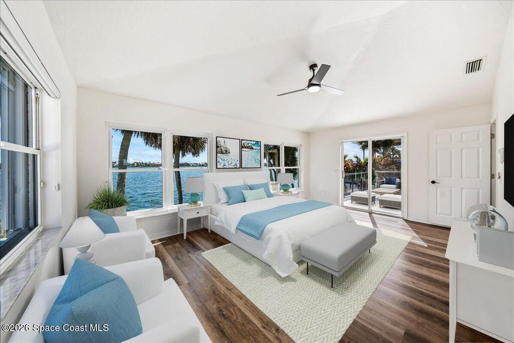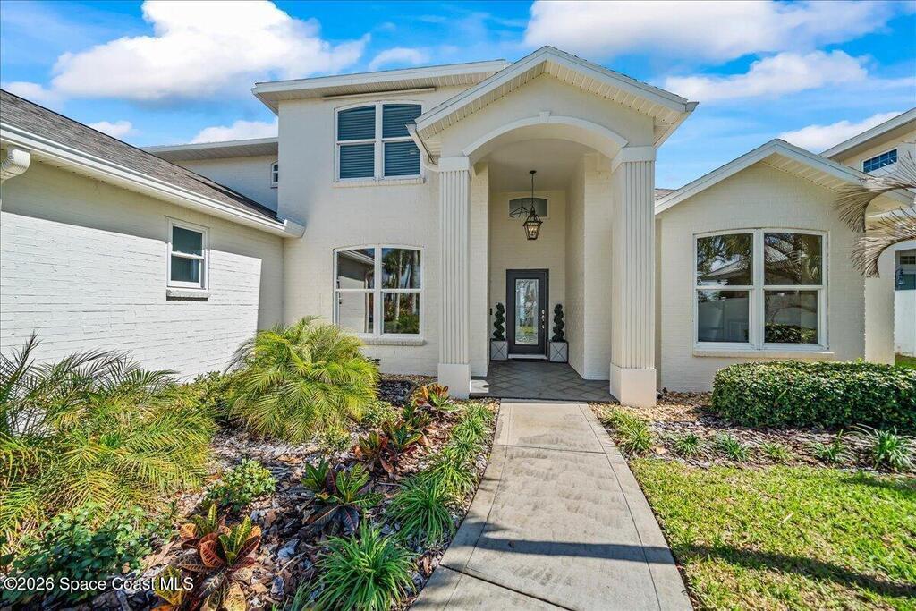 Discover true river-to-river living with over 200 feet of deep water frontage-more than 100 feet on both the Indian and Banana Rivers at this stunning, remodeled retreat. Privately set back on an oversized lot, this home offers 4 bedrooms plus a dedicated office, 3.5 baths, two spacious master suites, and a 3-car garage with ample guest parking. The upgraded kitchen features modern appliances and new countertops, while every bathroom showcases new modern tile and fixtures. Step outside to watch rocket launches from your balcony or take advantage of the 27,000 lb boat lift and jet ski lift with quick access to the Intracoastal and Atlantic. Enjoy a beautiful sunrise or sunset from nearly every room. Mature mango and avocado trees enhance the lush tropical setting, and beaches, dining, and shopping are just minutes away. Close to Melbourne International Airport and 45 min to Orlando. This home has it all! A rare opportunity for authentic Florida river- to- river waterfront living!