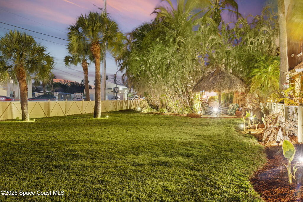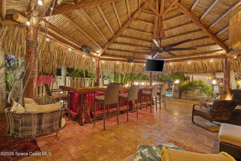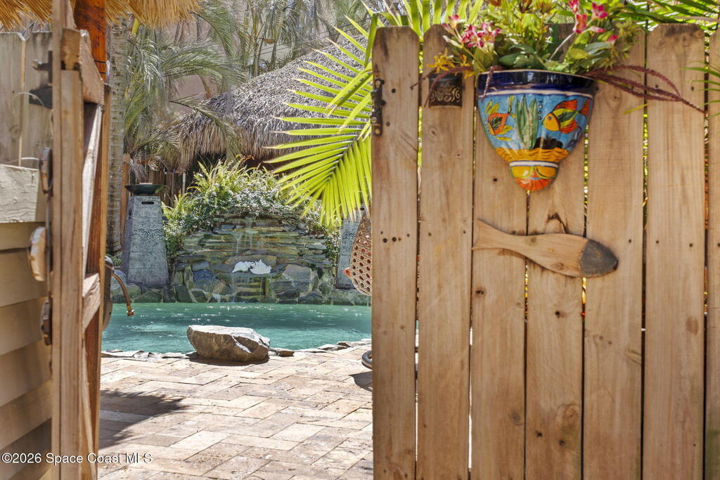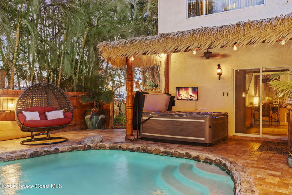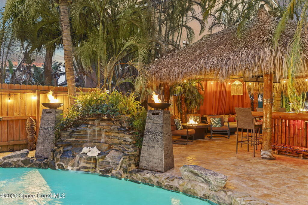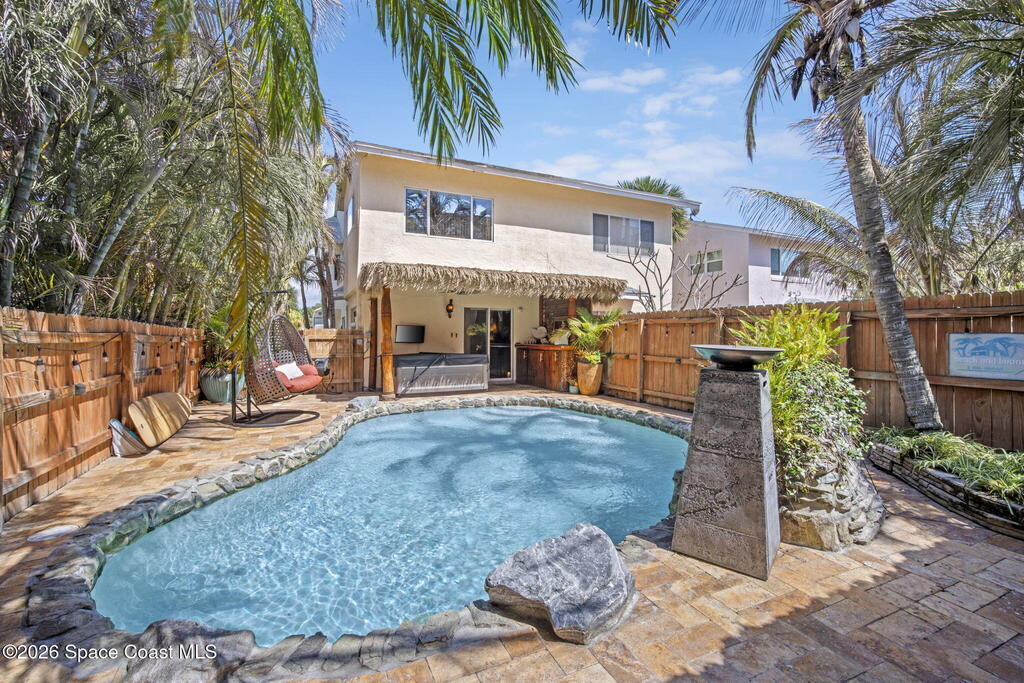 Tropical paradise just steps from the beach in Cape Canaveral! This one-of-a-kind 3 bedroom, 2 baths + office townhome is the only property on the east side of Ridgewood Ave to span an entire city block (BUILDABLE LOT INCLUDED), offering rare privacy and endless possibilities. Arrive through lush, manicured tropical landscaping that feels like your own island retreat. The backyard is an entertainer's dream with a stunning blue lagoon pool, travertine pavers, and a one-of-a-kind tiki pavilion with a fully built-out bar. A rare vacant lot provides room for a guest house, future investment property, or space for all your toys. Inside feels like a Hawaiian escape with wood-look tile floors and custom touches throughout. The open floor plan flows effortlessly as the kitchen overlooks the spacious family room with vaulted ceilings. The primary suite overlooks the tropical backyard and features a spa-like bath with steam shower and soaking tub.