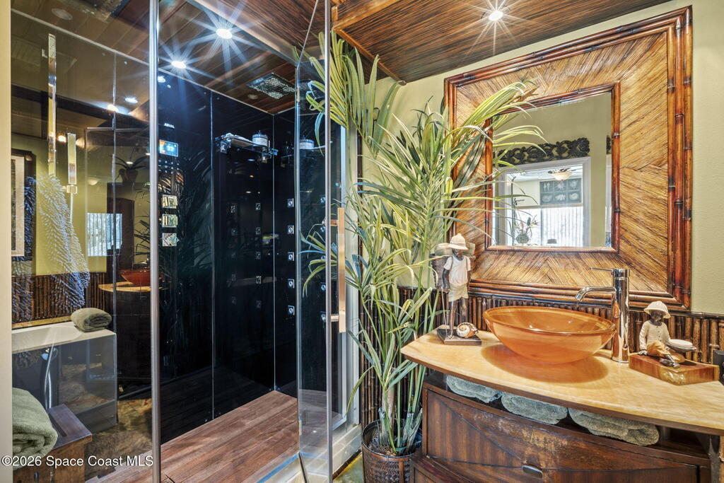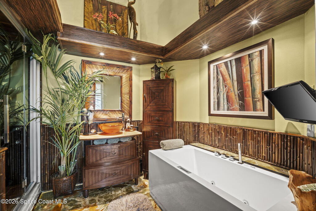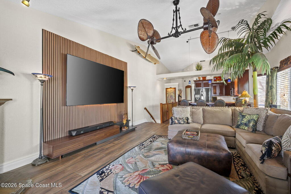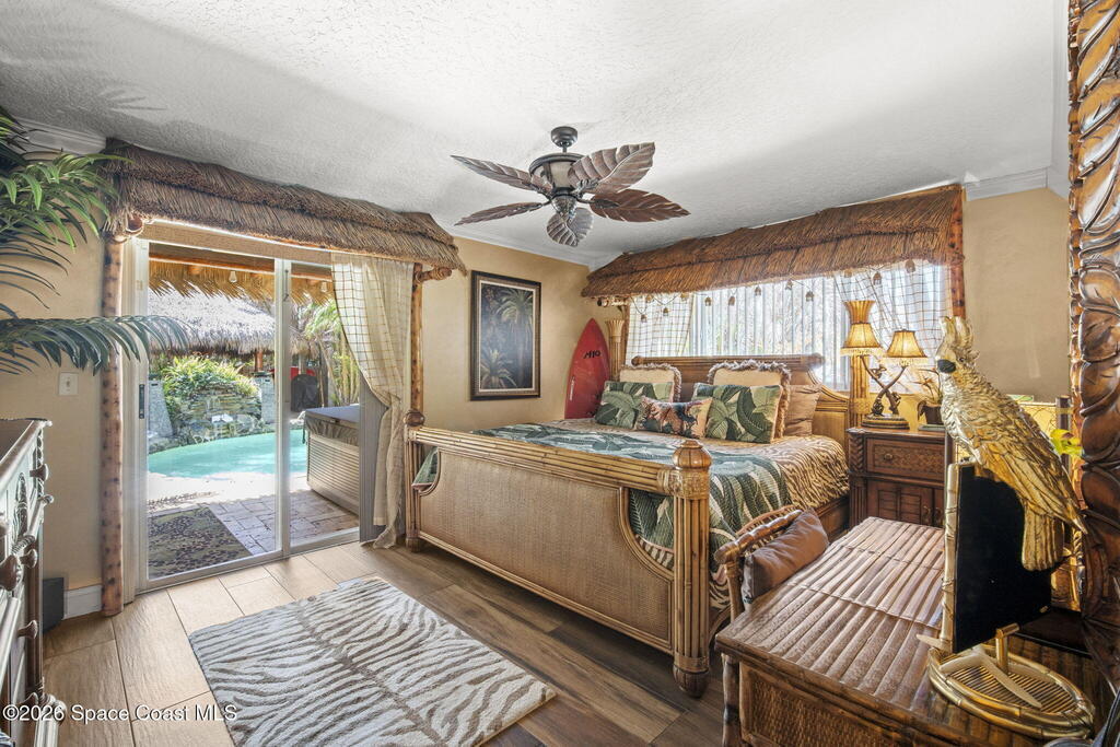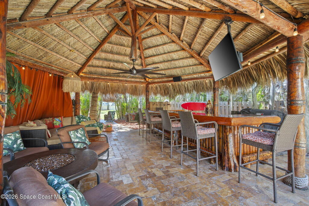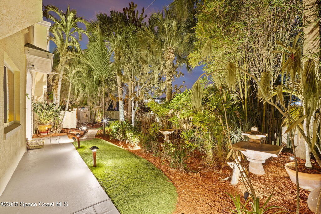 Tropical paradise just steps from the beach in Cape Canaveral! This one-of-a-kind 3 bedroom, 2 baths + office townhome is the only property on the east side of Ridgewood Ave to span an entire city block (BUILDABLE LOT INCLUDED), offering rare privacy and endless possibilities. Arrive through lush, manicured tropical landscaping that feels like your own island retreat. The backyard is an entertainer's dream with a stunning blue lagoon pool, travertine pavers, and a one-of-a-kind tiki pavilion with a fully built-out bar. A rare vacant lot provides room for a guest house, future investment property, or space for all your toys. Inside feels like a Hawaiian escape with wood-look tile floors and custom touches throughout. The open floor plan flows effortlessly as the kitchen overlooks the spacious family room with vaulted ceilings. The primary suite overlooks the tropical backyard and features a spa-like bath with steam shower and soaking tub.