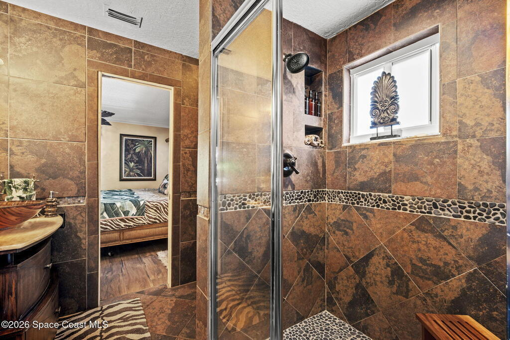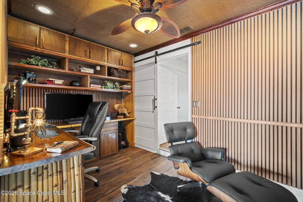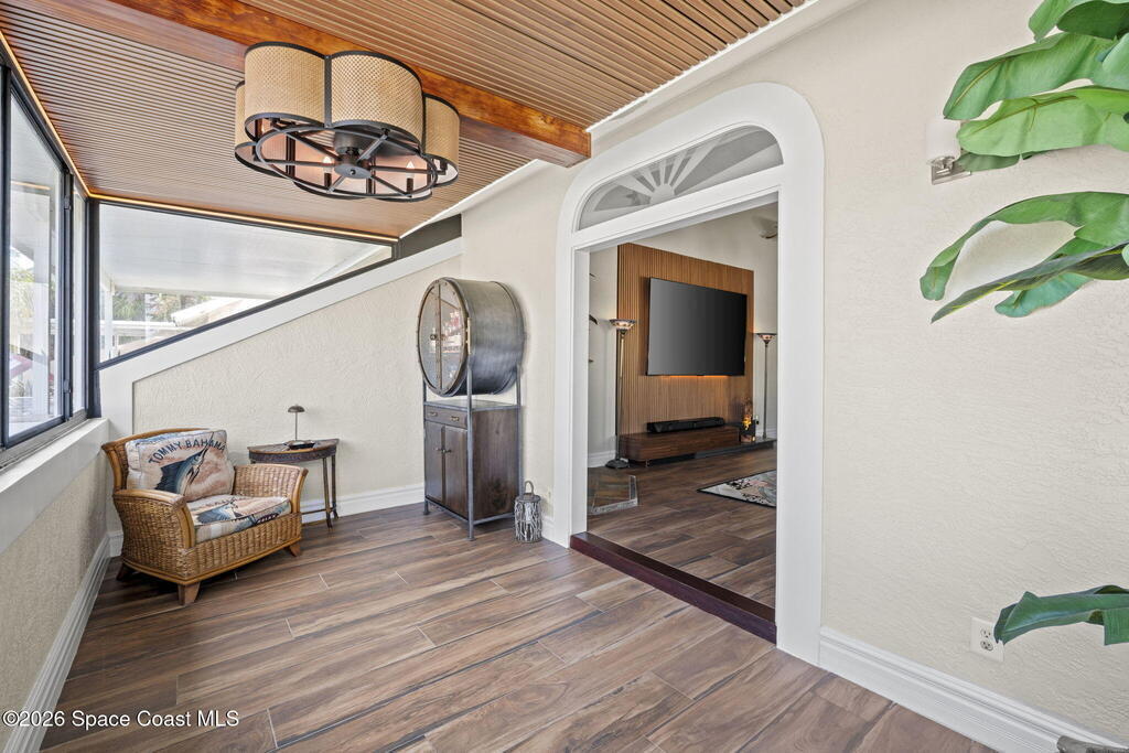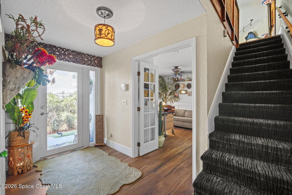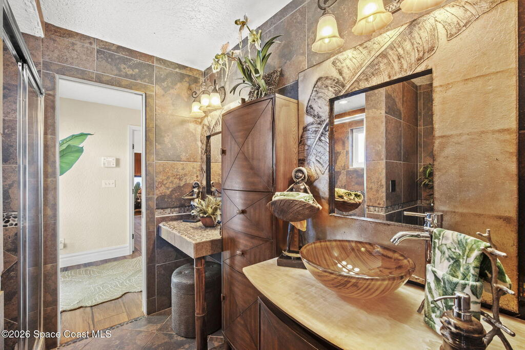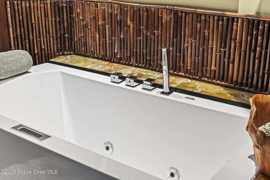 Tropical paradise just steps from the beach in Cape Canaveral! This one-of-a-kind 3 bedroom, 2 baths + office townhome is the only property on the east side of Ridgewood Ave to span an entire city block (BUILDABLE LOT INCLUDED), offering rare privacy and endless possibilities. Arrive through lush, manicured tropical landscaping that feels like your own island retreat. The backyard is an entertainer's dream with a stunning blue lagoon pool, travertine pavers, and a one-of-a-kind tiki pavilion with a fully built-out bar. A rare vacant lot provides room for a guest house, future investment property, or space for all your toys. Inside feels like a Hawaiian escape with wood-look tile floors and custom touches throughout. The open floor plan flows effortlessly as the kitchen overlooks the spacious family room with vaulted ceilings. The primary suite overlooks the tropical backyard and features a spa-like bath with steam shower and soaking tub.