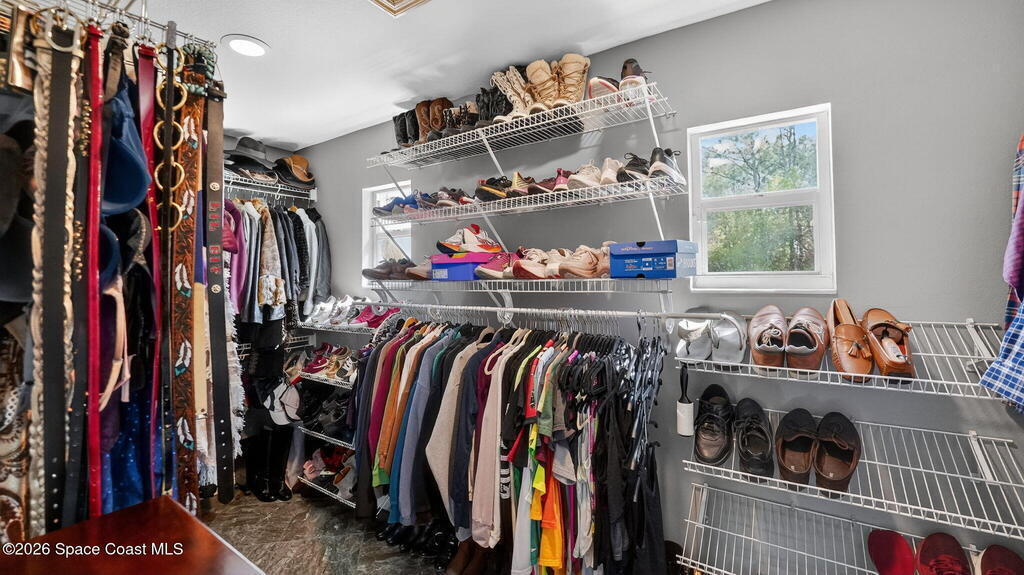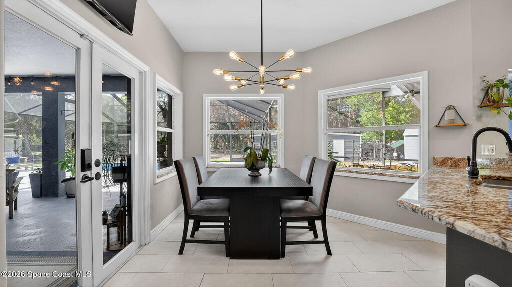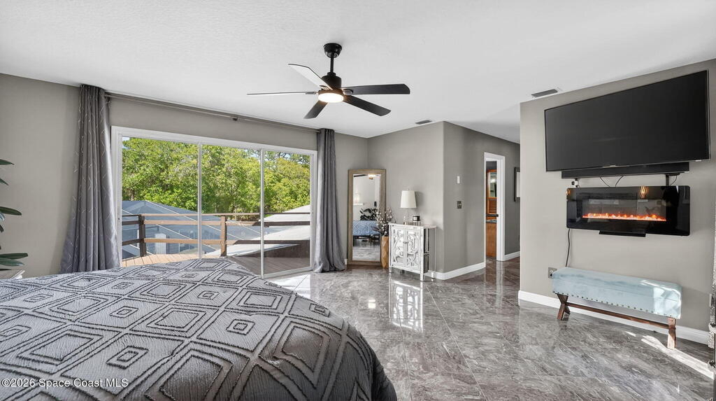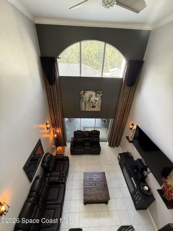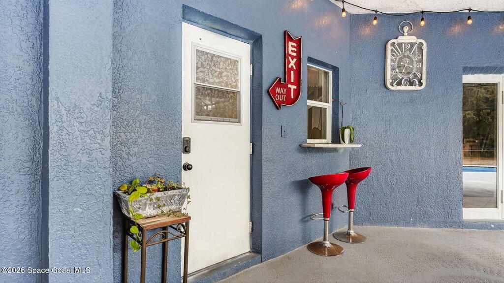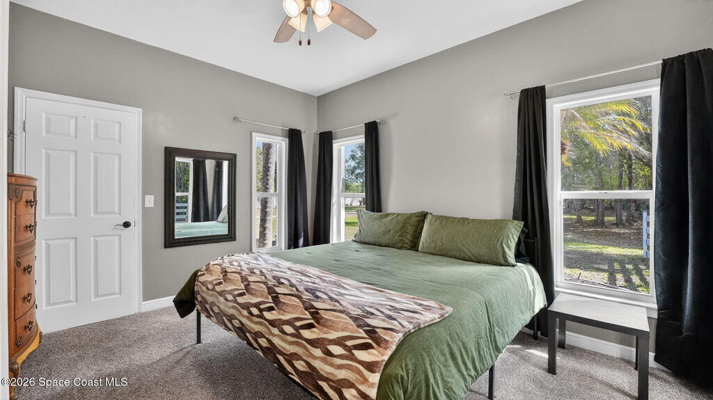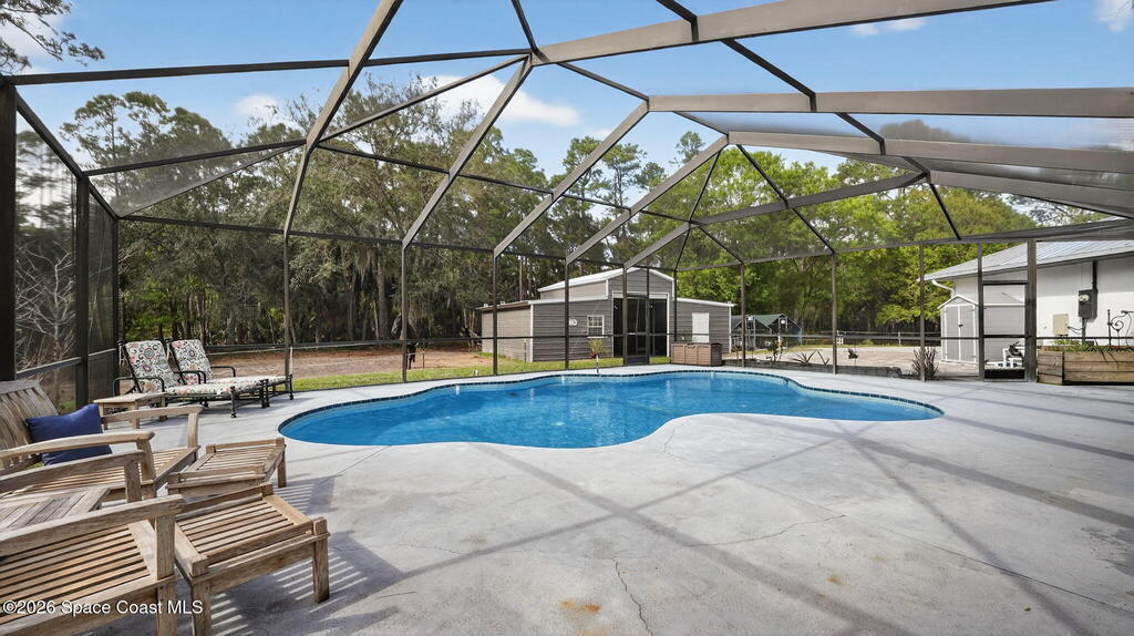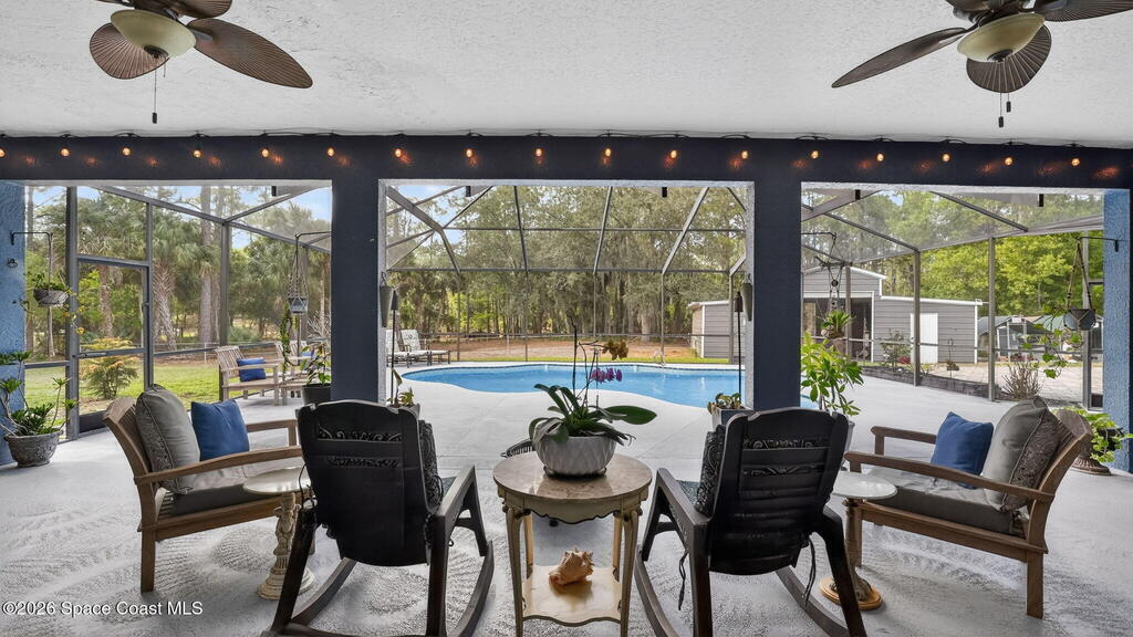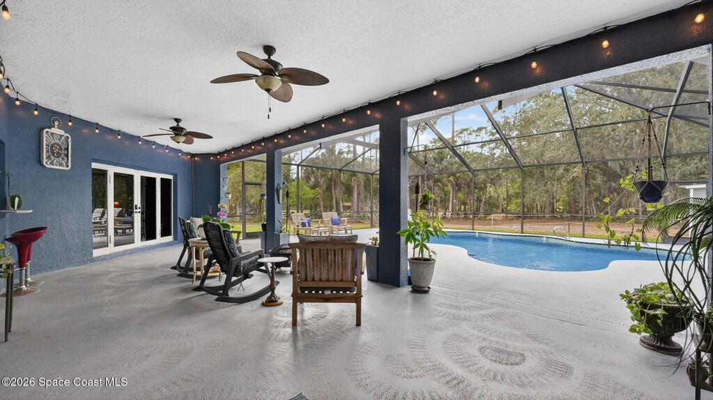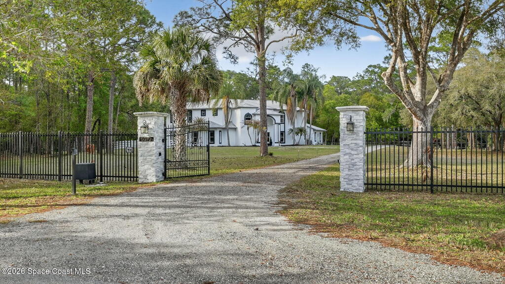 Nestled on 5 acres, this stately 4/4 pool home provides comfort & solitude, on a private rd allowing for the neighborhood feel without the restrictions of a subdivision NO HOA. The vast front yard & large shade trees are the first to welcome you through the electric gates & fully fenced in 5 acre estate. Stepping through the new high-impact fiberglass double entry front doors, you're greeted by the living area's 22' ceilings & a wall of windowed doors leading out to the expansive, enclosed patio/pool area. The main floor has an attached in-law suite w/ a bedroom W/I closet, full bath, wet bar, living area, & French doors leading out to the pool. The second floor has the primary w/ ensuite & updated shower w/ two shower heads, W/I closet, & a private deck. Across the catwalk, you'll find an updated full bath & 2 more bedrooms w/ W/I closets. There is a new 36'x25' barn/workshop with solar lighting. Meticulously maintained - SEE UPGRADES DOCUMENT;