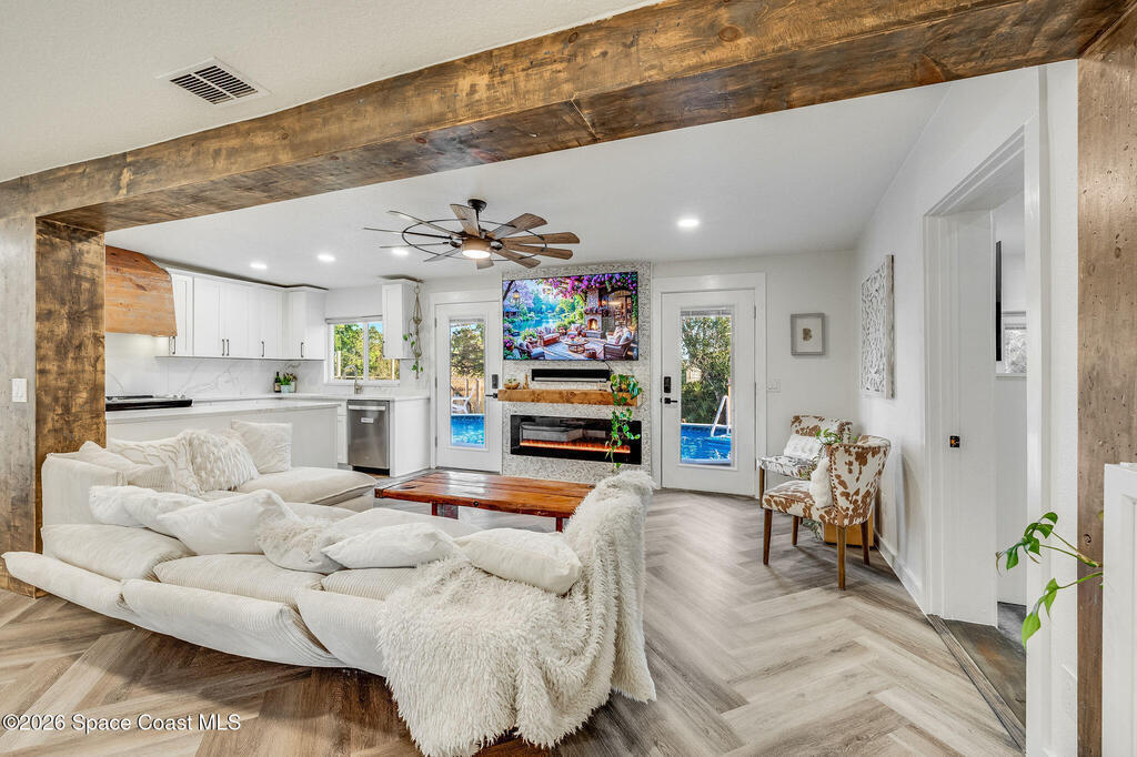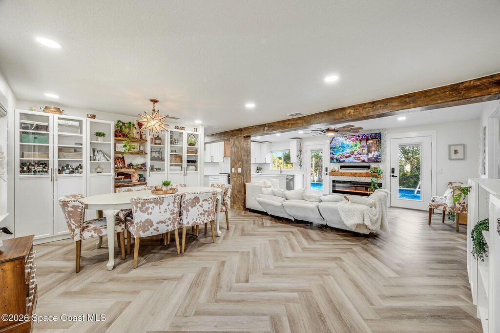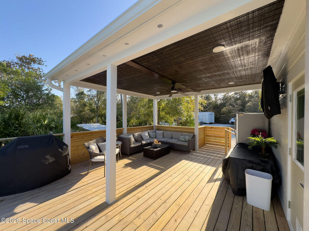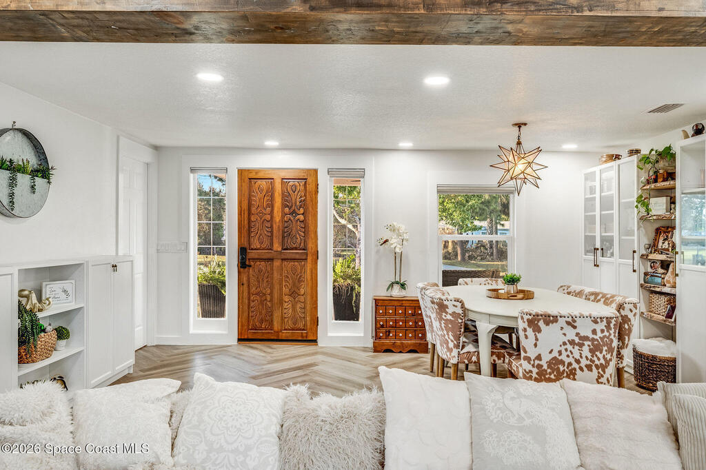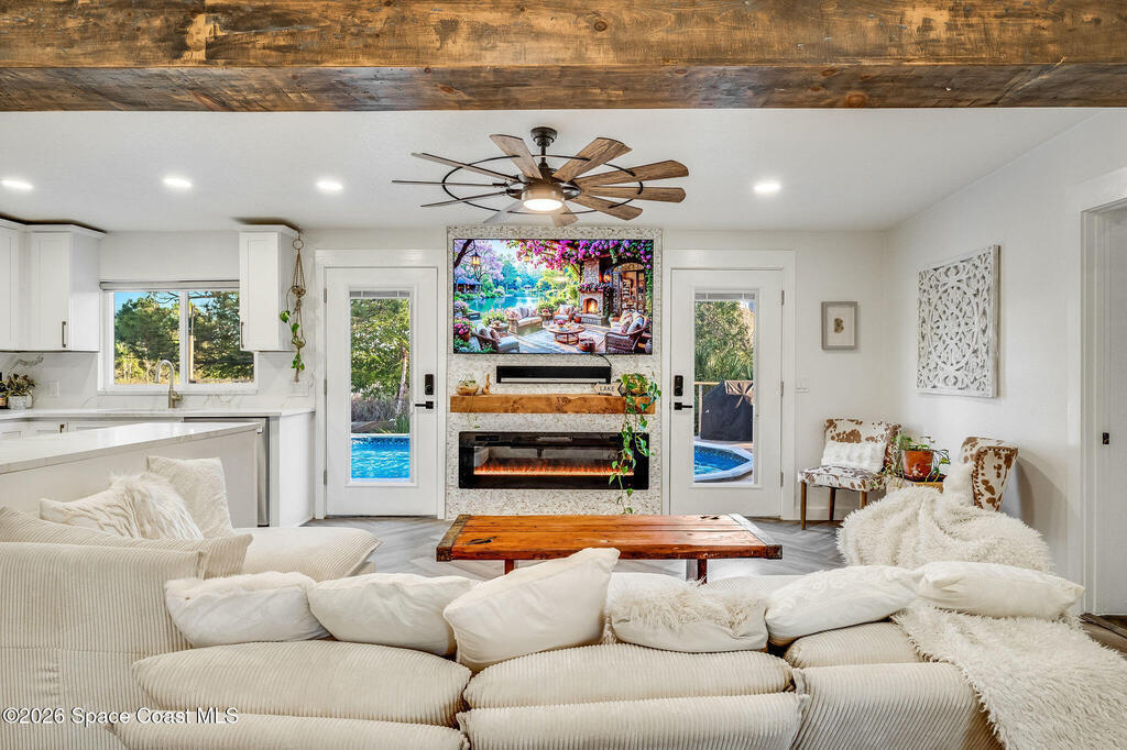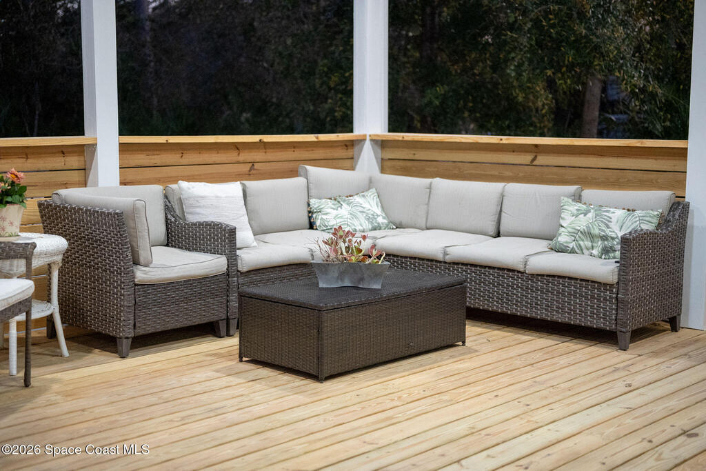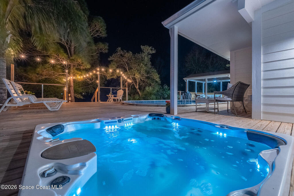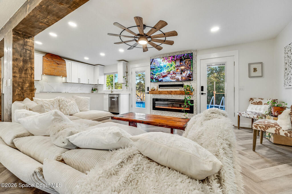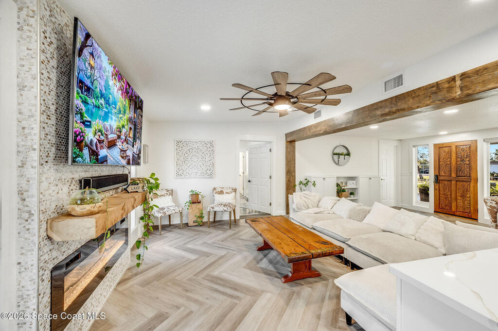 Tucked along the shoreline of Deer Lake, this exceptional lakefront retreat offers a rare blend of privacy, nature, & modern comfort. Situated on 1.24 acres with 194 feet of shoreline spanning a natural bend of Deer Lake, the property offers enhanced water views & a sense of privacy rarely found on standard lakefront lots. The property features expansive water views, including a scenic island, & a peaceful setting surrounded by natural landscape. The land directly across the lake is currently owned by Brevard County & connects to the expansive Buck Lake Wildlife Management Area, spanning more than 9,000 acres across Brevard & Volusia County, enhancing the property's natural views & sense of privacy.Outdoor living is a centerpiece of the home, highlighted by a 1,300 square foot wraparound deck, along with a pool & spa, private beach area, dock, & a covered lakeside cabana featuring a wood-accent ceiling, lounge area, outdoor kitchen space with refrigerator, & television setup -- ideal