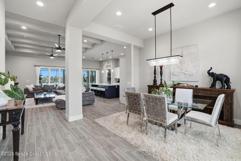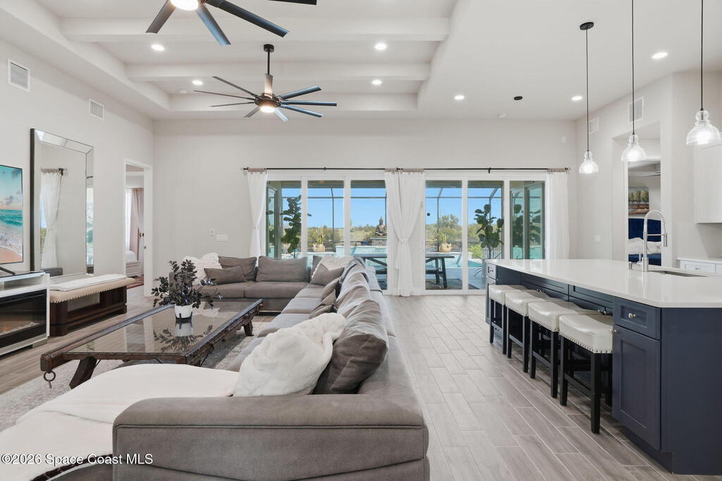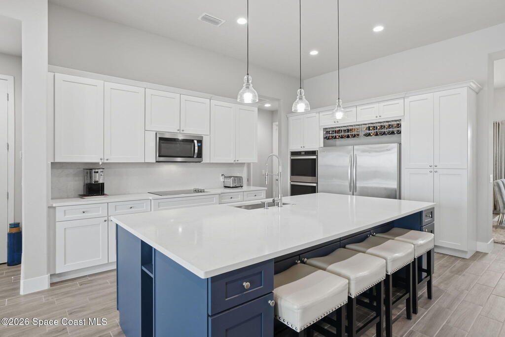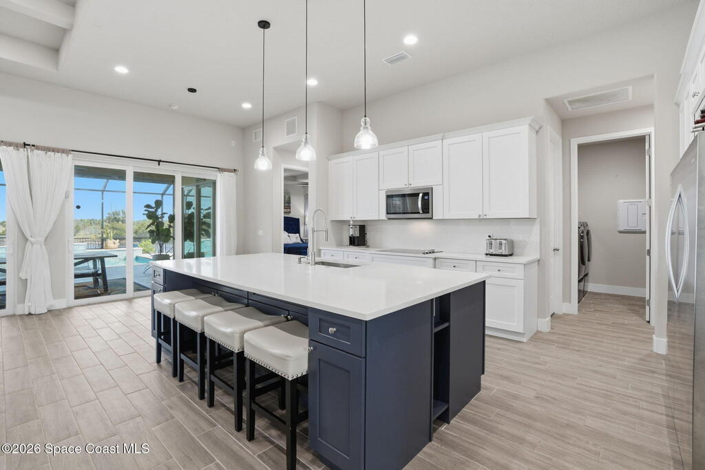 Experience luxury living in this custom 2021 Damar-built 4-bed, 3-bath pool home with a 4-car epoxied garage, located in the gated community of Enclave at Lake Washington. Designed for both comfort and entertaining, the home features an open-concept layout that allows the main living spaces to flow seamlessly together. The kitchen is built for hosting and everyday living alike, offering a large center island, double ovens, abundant cabinetry, and a custom wine rack above the refrigerator. The primary suite provides a private retreat with a spa-style bathroom and a spacious walk-in closet. Step outside to experience true Florida living with a gas-heated pool and spa equipped with a Pentair smart pool system, allowing the pool temperature and settings to be controlled directly from your phone. The outdoor living space continues with a large screened patio with water views and a fully enclosed outdoor kitchen complete with its own exhaust system, private entrance, and air