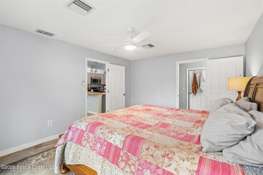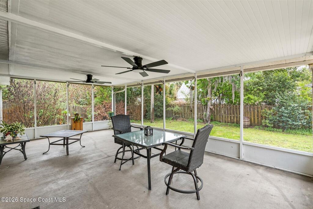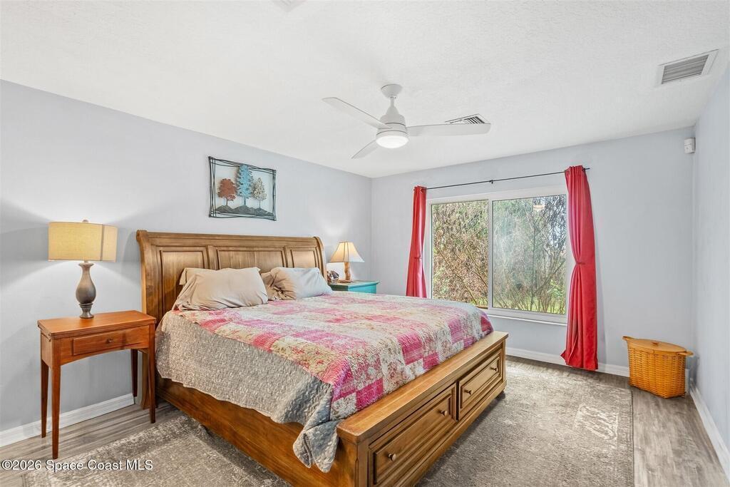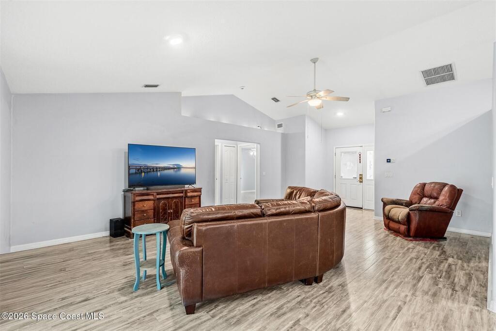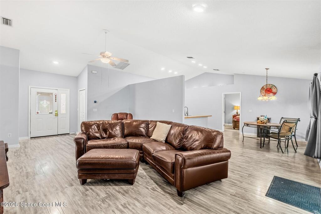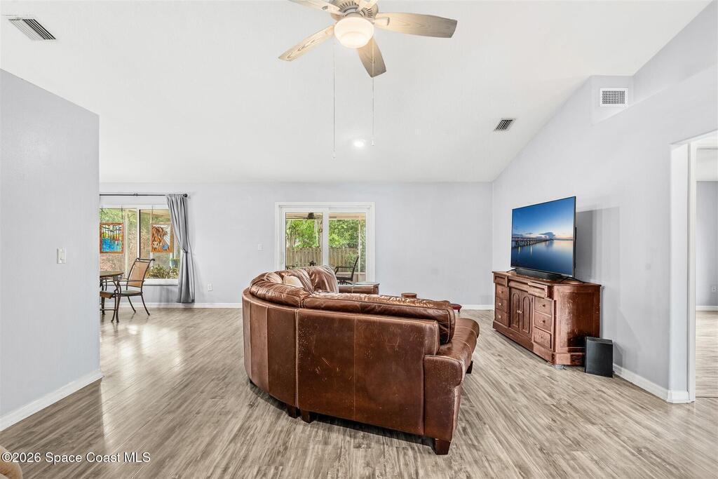 Welcome to this beautifully maintained home in desirable Port St. John! Featuring a spacious open floor plan, this property offers both comfort and functionality, perfect for everyday living and entertaining. The interior boasts stylish Pergo flooring throughout the main living areas and bedrooms, with durable tile in the bathrooms for easy maintenance. Major updates provide peace of mind, including a 2018 roof, 2025 air conditioning system, a 2023 water heater, and impact windows throughout the entire home for added security and energy efficiency. Step outside to enjoy the large, covered patio overlooking a fully fenced backyard with plenty of space for pets or play. Irrigation is controlled by a well system to keep those water bills low. An extended driveway continues into the side yard, offering ample room to park boats, trailers, or recreational vehicles. This home combines modern updates, thoughtful features, and outdoor versatility in a convenient location.