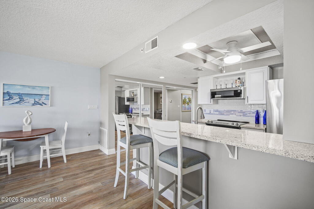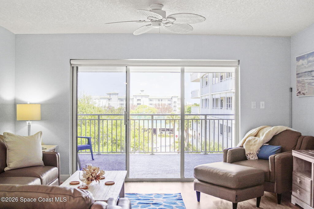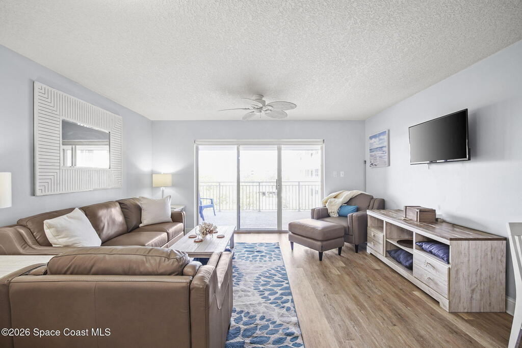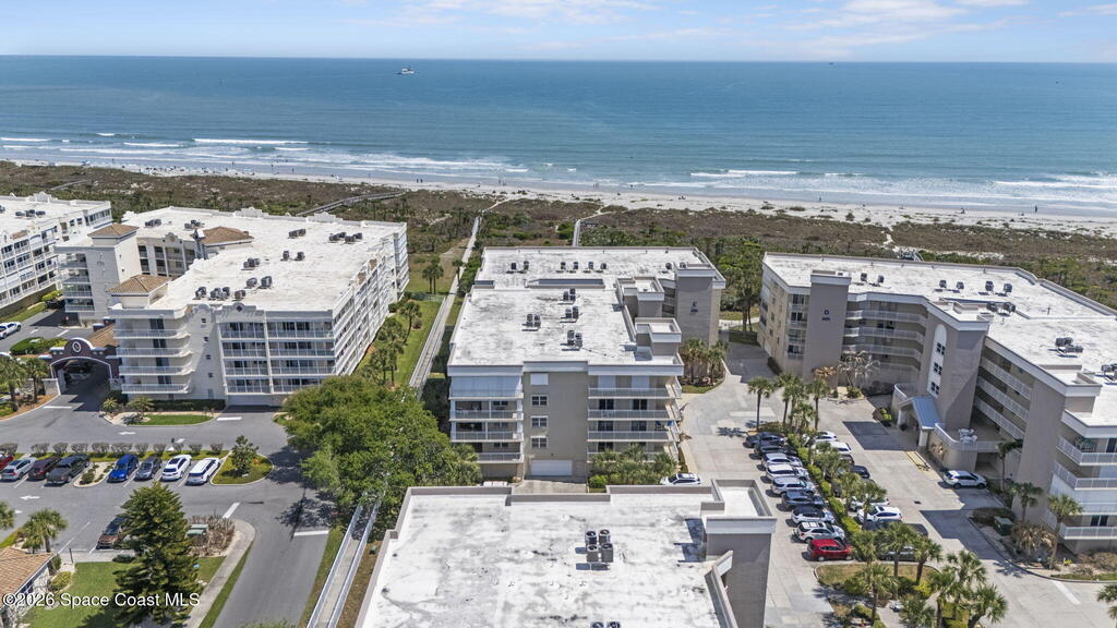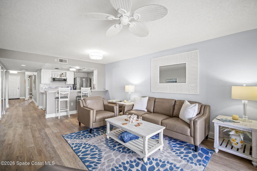 Tucked away in a gated Cape Canaveral community, this updated condo offers privacy with unbeatable convenience--just minutes from restaurants and Jetty Park. Inside, natural light fills the space, highlighting matching vinyl flooring throughout. The modern kitchen features quartz countertops, stainless steel appliances, and a breakfast bar overlooking the family room. The bedroom includes plantation shutters and an updated, spacious bath with a walk-in shower. Step onto the oversized balcony (with NEW hurricane shutter) to relax with ocean breezes and enjoy weekly cruise ship views. Amenities include a clubhouse, tennis and pickleball courts, plus a heated pool and spa. Complete with newer A/C and a private 1-car garage under the building. All concrete restoration has been completed!