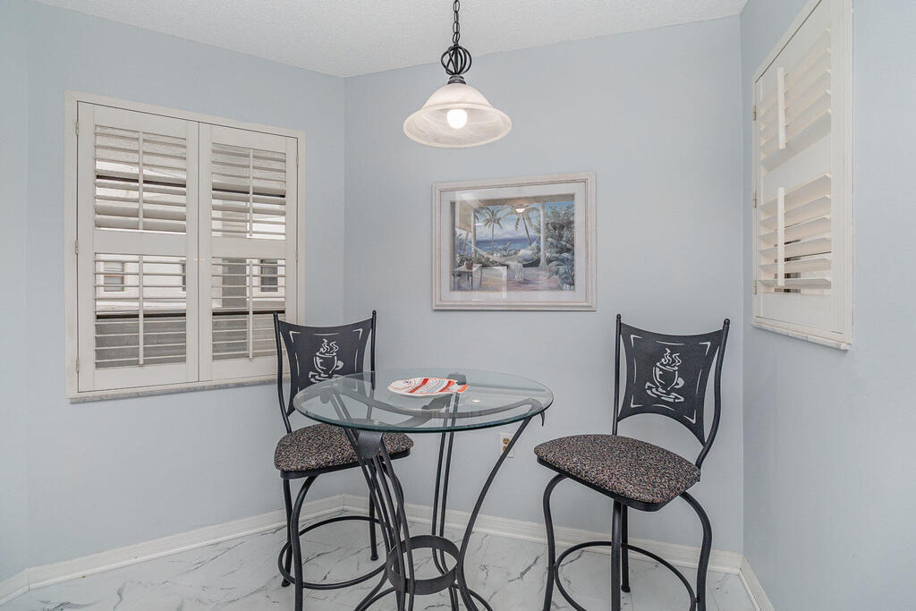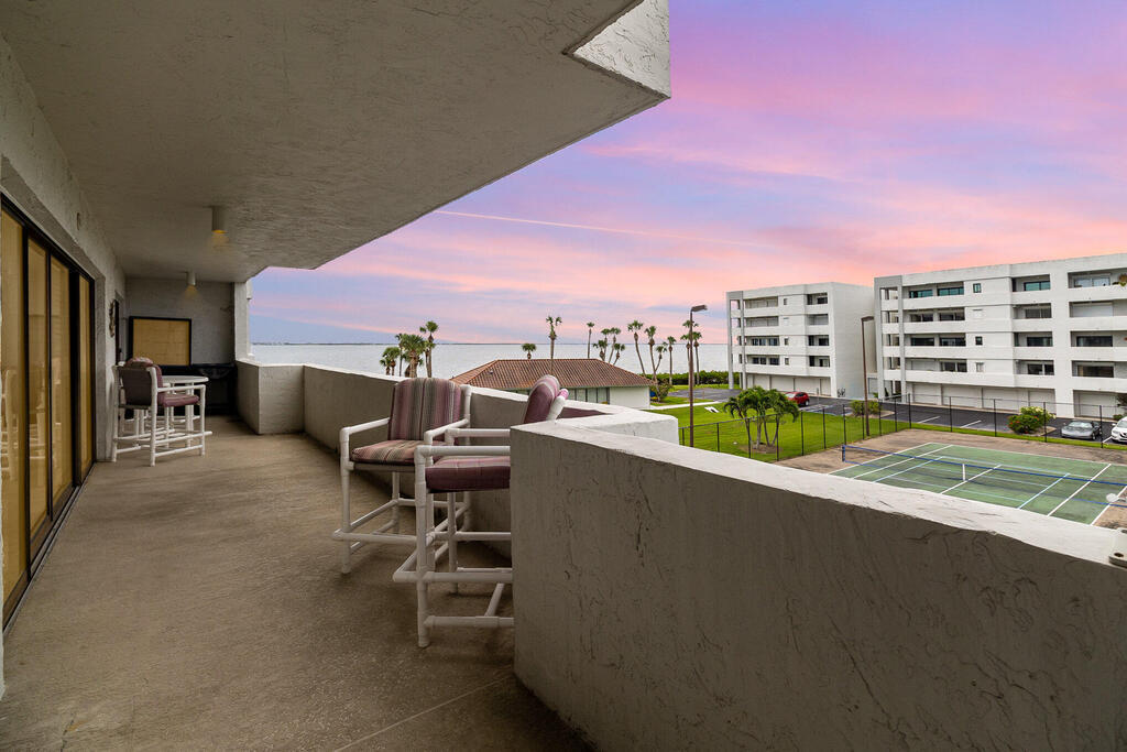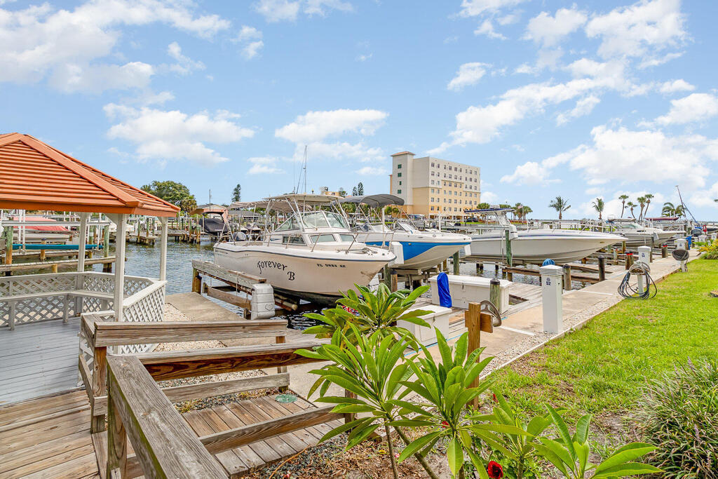 Calling all boaters & water lovers! Second-floor 3BR/2BA split-plan condo with stunning Indian River views, with it's own deeded boat slip, private marina & 1-car garage. Open living/dining area with built-in wet bar. Sliders lead to a 45-ft balcony spanning the primary bedroom, living area & guest bedroom, all with beautiful river views. Primary suite features double sinks, step-in shower & walk-in closet. Guest bath offers handicap-accessible features including 3-ft doors, hallway & step-in shower. Newer A/C unit and water heater. Full size stackable washer/dryer in convenient laundry closet. Enjoy all the Rhum Cove amenities: marina, fishing pier, heated/cooled pool & spa, riverfront clubhouse with fitness room & sauna, plus tennis & pickleball courts. Short drive to to beaches, dining & shopping. Don't miss out, it's the best priced unit in Rhum Cove !!