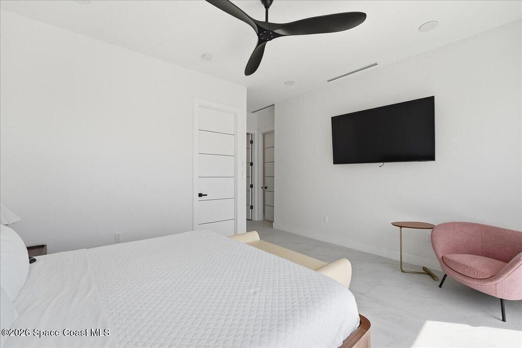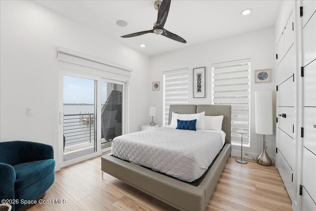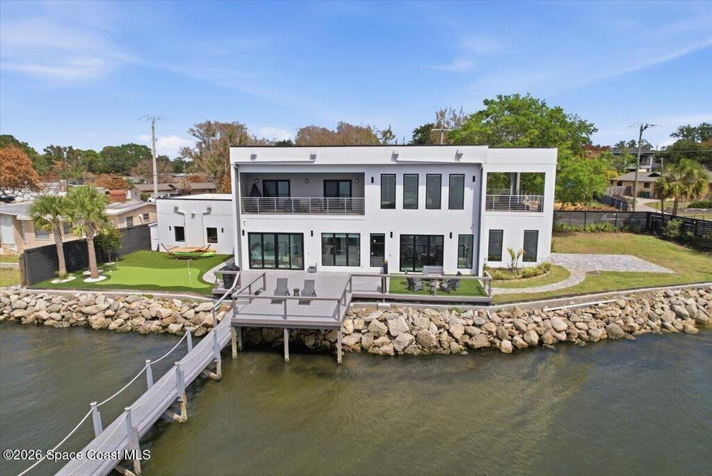 Modern Waterfront Masterpiece on Merritt Island with 142 feet of direct Indian River frontage. This 2024-built two-story home features full concrete block construction, a commercial-grade roof, and high-end modern finishes throughout. Offering 5 bedrooms, 4 full baths, and a 2-car garage, this fully furnished residence is truly turnkey. The designer kitchen, custom built-in closets, smart home features, motorized shades, and smart toilets elevate the living experience. The expansive upstairs primary suite includes a private covered terrace, wraparound closet, and a stunning spa bath with designer tile and luxury shower. Enjoy a covered boat dock with lift, jet ski dock, putting green, and side yard. West-facing balconies capture breathtaking sunsets with views of dolphins and manatees. Located near Cocoa Village with quick access to the Atlantic Ocean, 45 minutes to Orlando International Airport and 1 hour to Disney. Truly one of a kind.