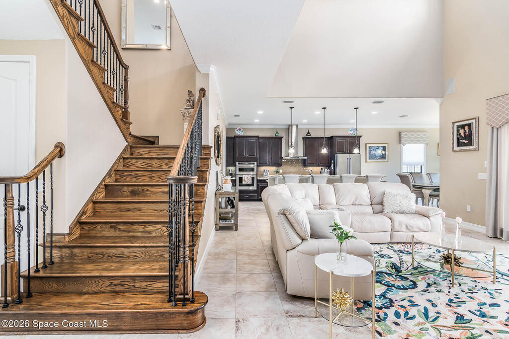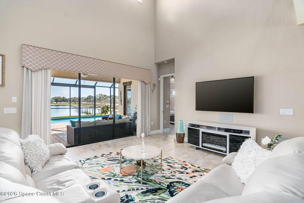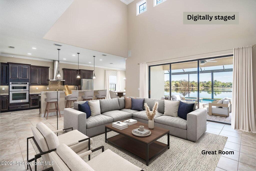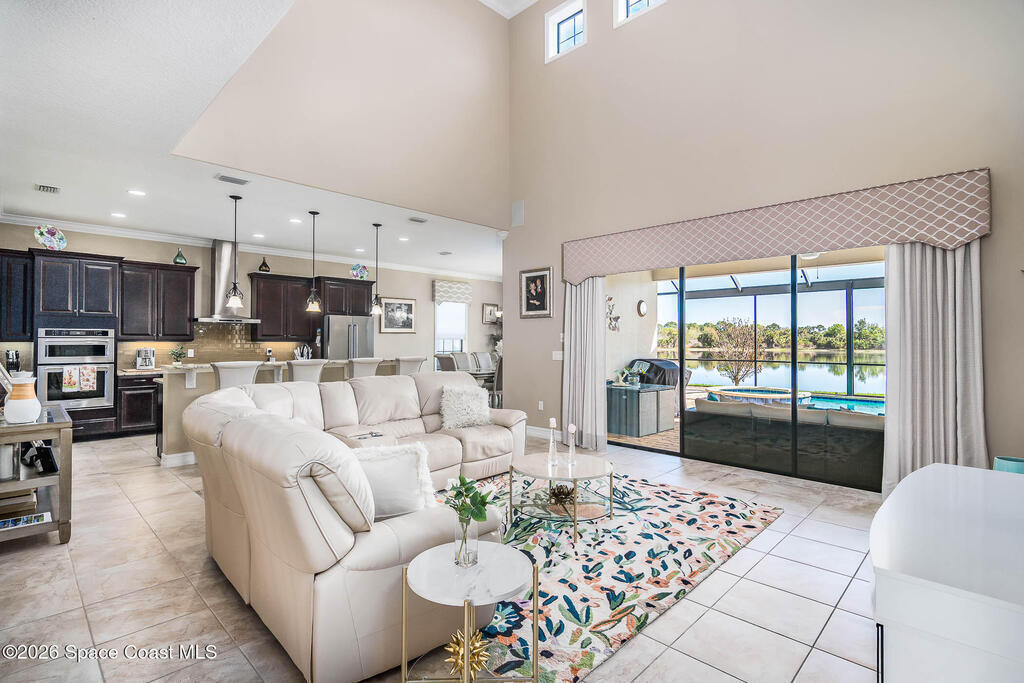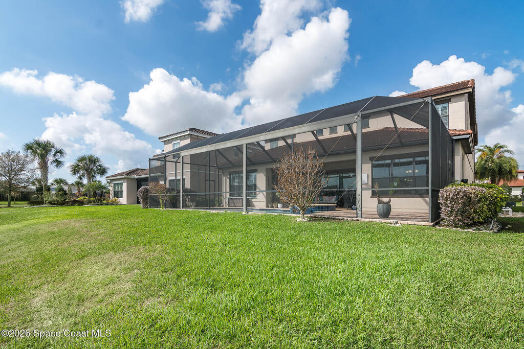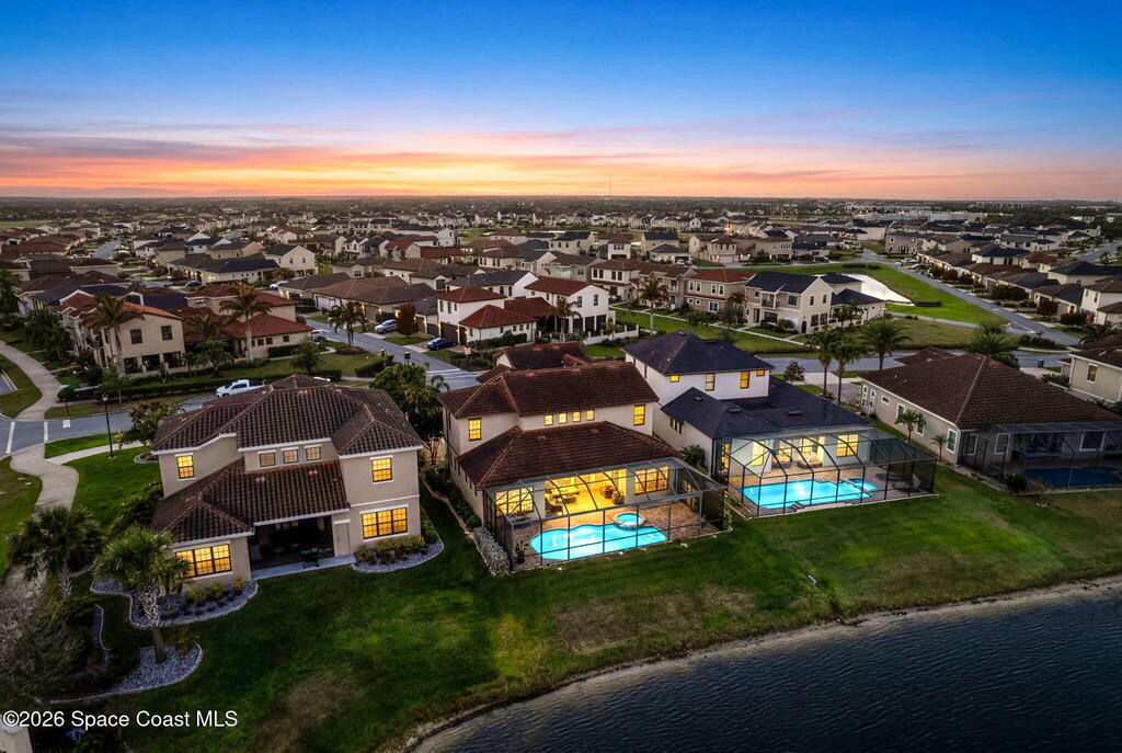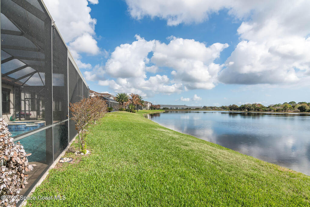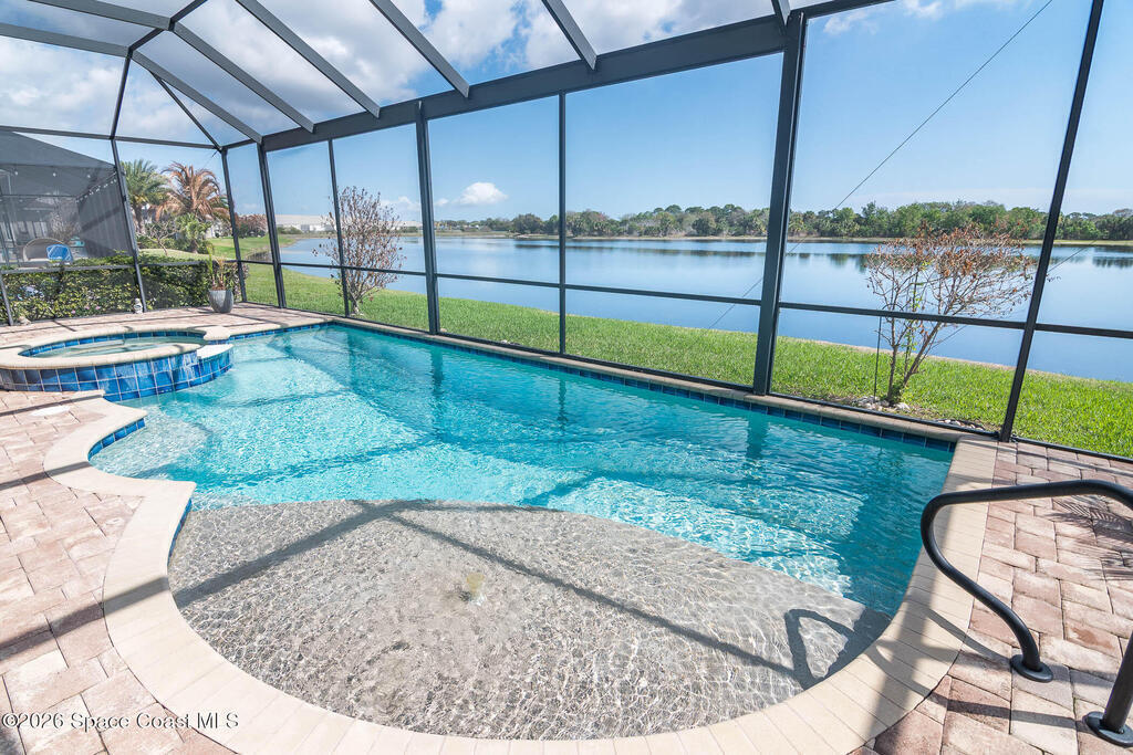 Former model home in Viera West with sweeping lake and preserve views! No rear neighbors. Outdoor oasis features a heated saltwater pool, spa, and paver deck. Inside: soaring ceilings and plantation shutters. Complete split plan with privacy for all bedrooms. 4BR/4.5BA + loft ideal for your office. Every bedroom boasts its own private bath--ideal for multi-gen living. Gourmet chef's kitchen with espresso soft-close cabinetry, granite counters, 5-burner gas range, walk-in pantry, KitchenAid SS appliances. Main-level primary suite offers panoramic water views, walk-in closet with organizers, spa bath w/ soaking tub, and ceiling-height tile shower. Upstairs: custom wrought iron railing paired with a wood handrail and stairs to loft, 2 guest BRs. 4th BR suite with separate stairs--perfect for guests, media room, or office. Main living areas feature tile flooring throughout. Oversized laundry room with cabinetry and full sink. 2-car plus golf cart garage. Near Publix, Costco, A rated school