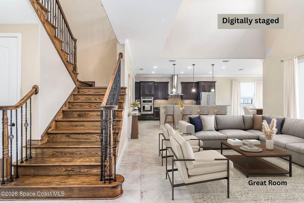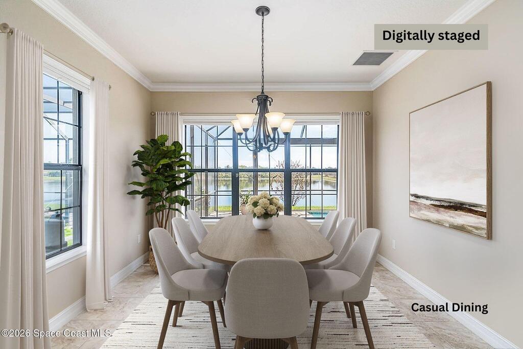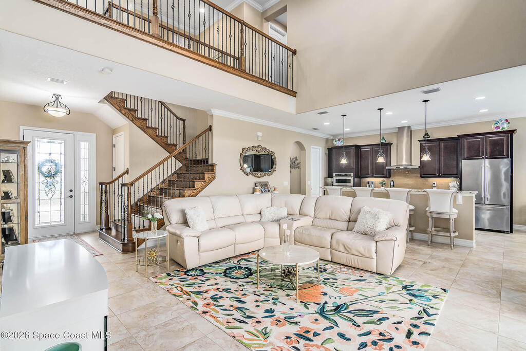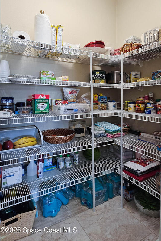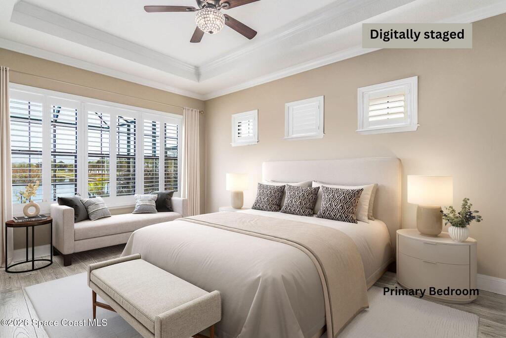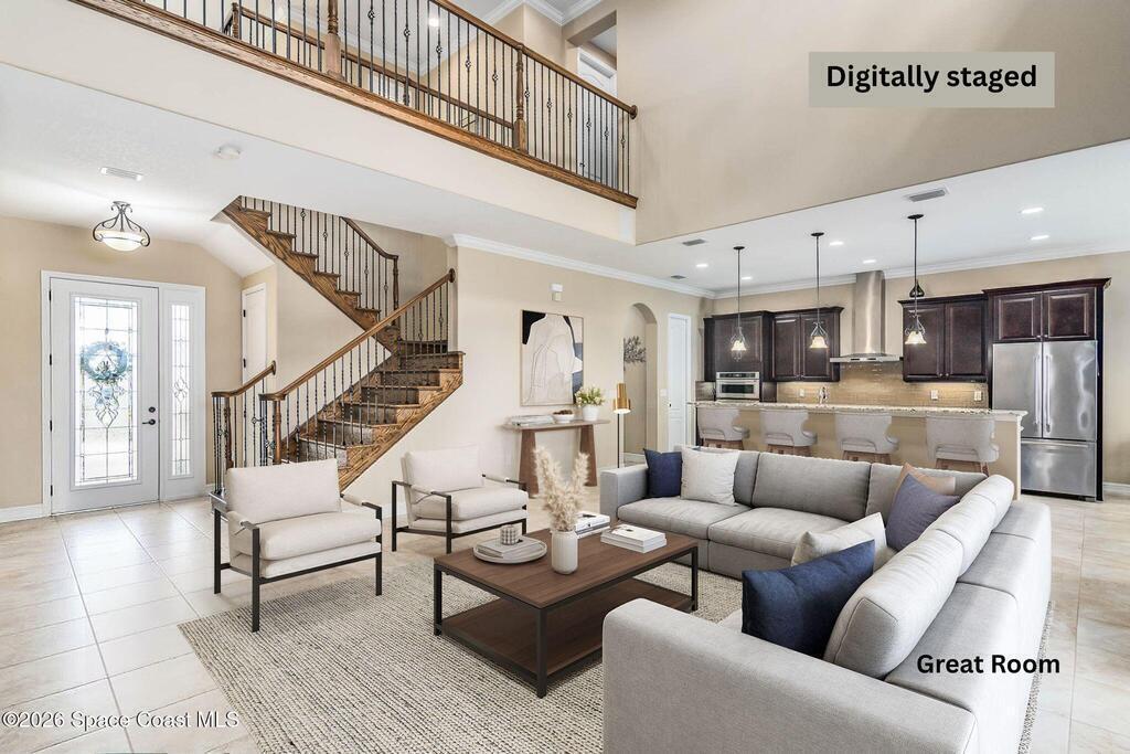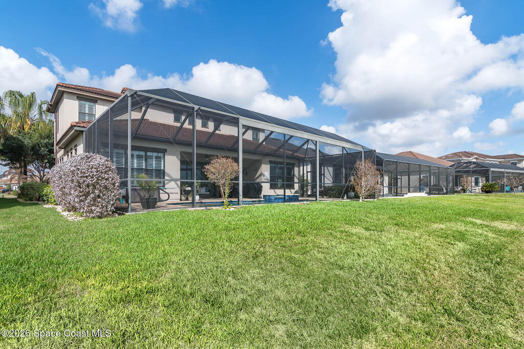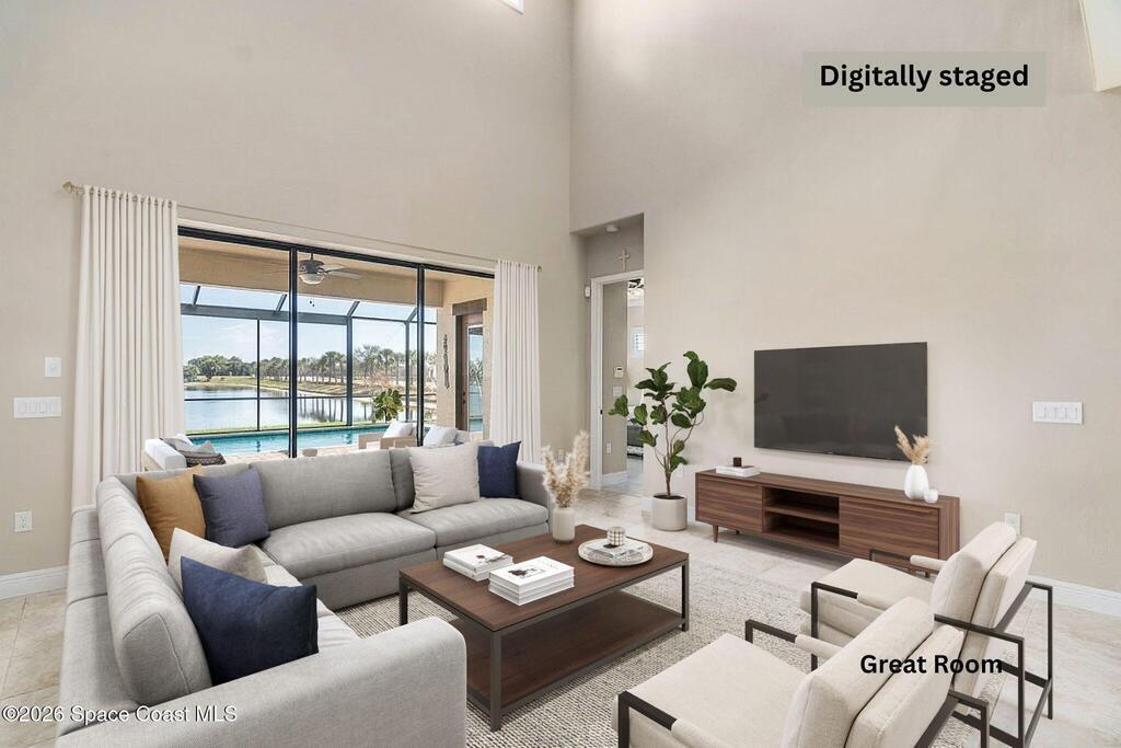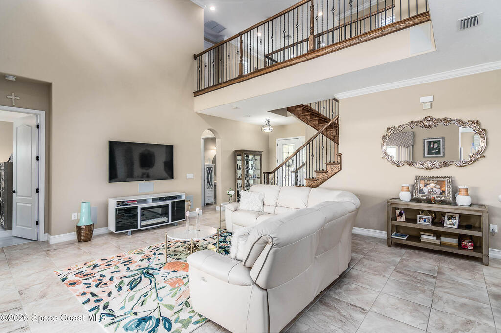 Former model home in Viera West with sweeping lake and preserve views! No rear neighbors. Outdoor oasis features a heated saltwater pool, spa, and paver deck. Inside: soaring ceilings and plantation shutters. Complete split plan with privacy for all bedrooms. 4BR/4.5BA + loft ideal for your office. Every bedroom boasts its own private bath--ideal for multi-gen living. Gourmet chef's kitchen with espresso soft-close cabinetry, granite counters, 5-burner gas range, walk-in pantry, KitchenAid SS appliances. Main-level primary suite offers panoramic water views, walk-in closet with organizers, spa bath w/ soaking tub, and ceiling-height tile shower. Upstairs: custom wrought iron railing paired with a wood handrail and stairs to loft, 2 guest BRs. 4th BR suite with separate stairs--perfect for guests, media room, or office. Main living areas feature tile flooring throughout. Oversized laundry room with cabinetry and full sink. 2-car plus golf cart garage. Near Publix, Costco, A rated school