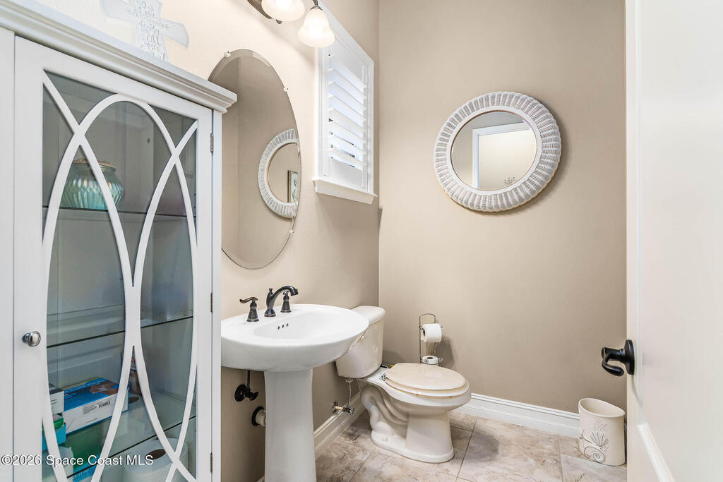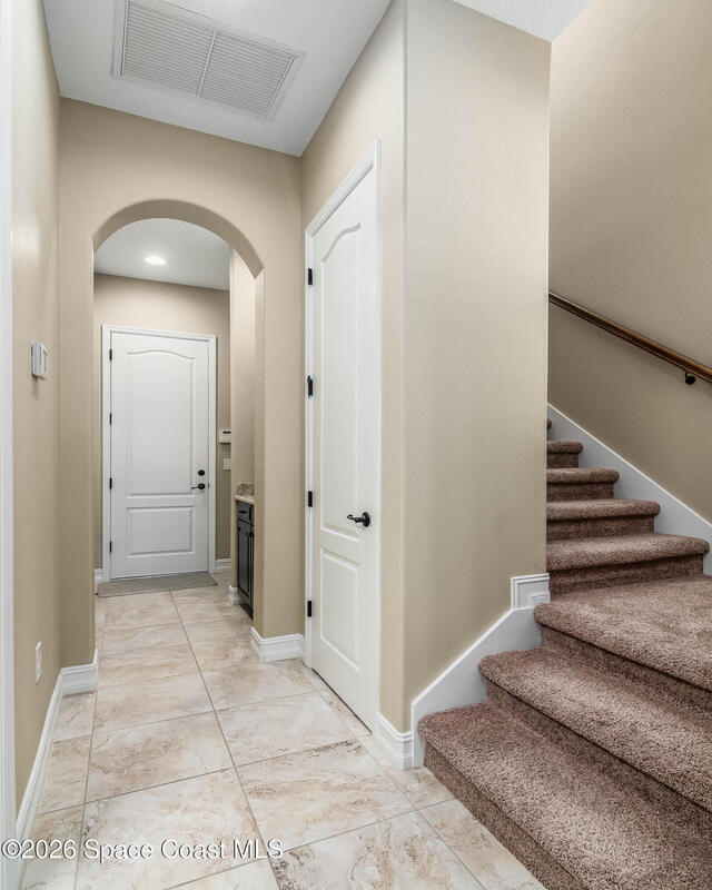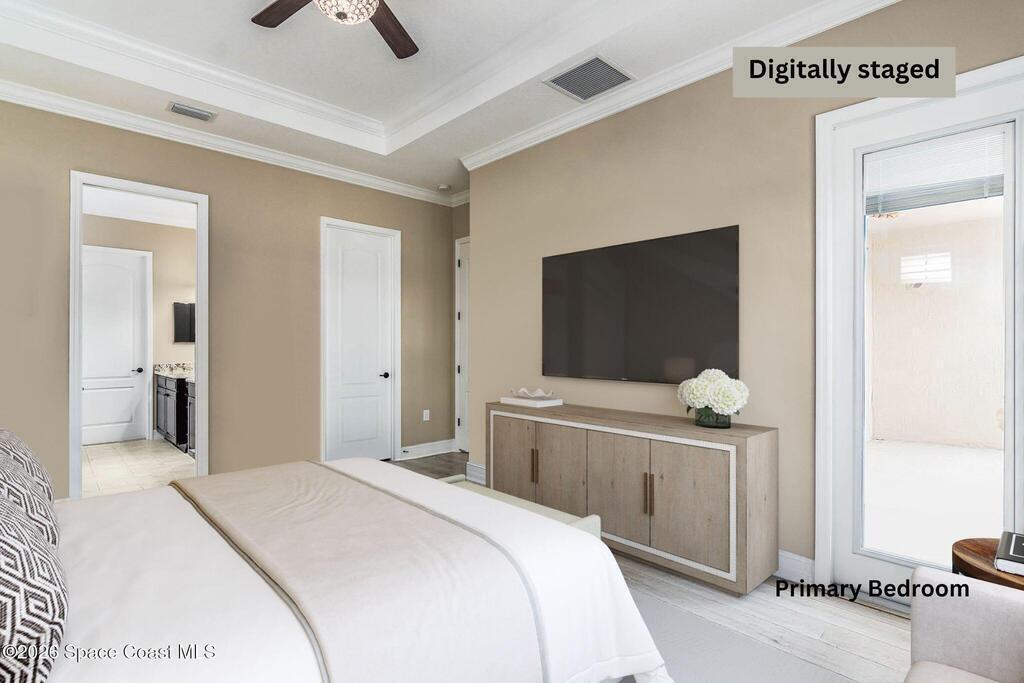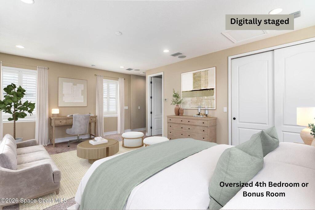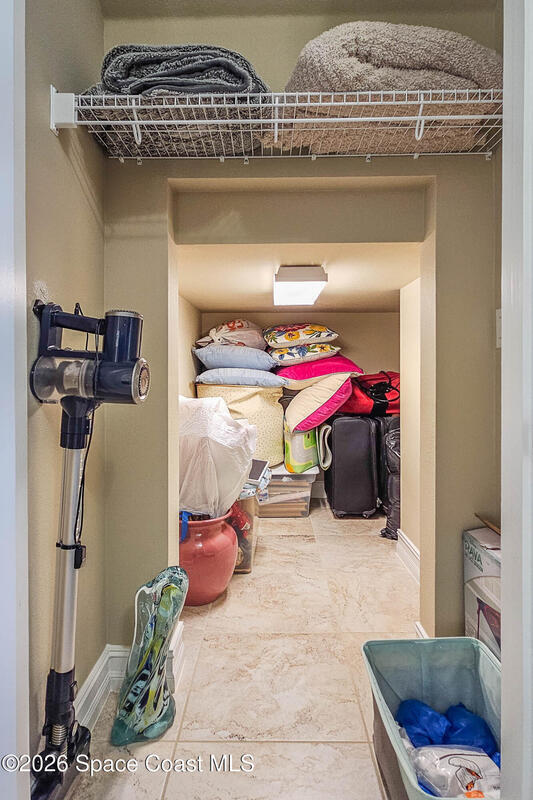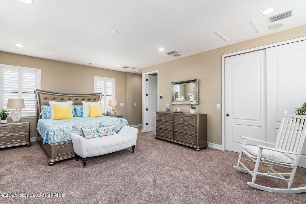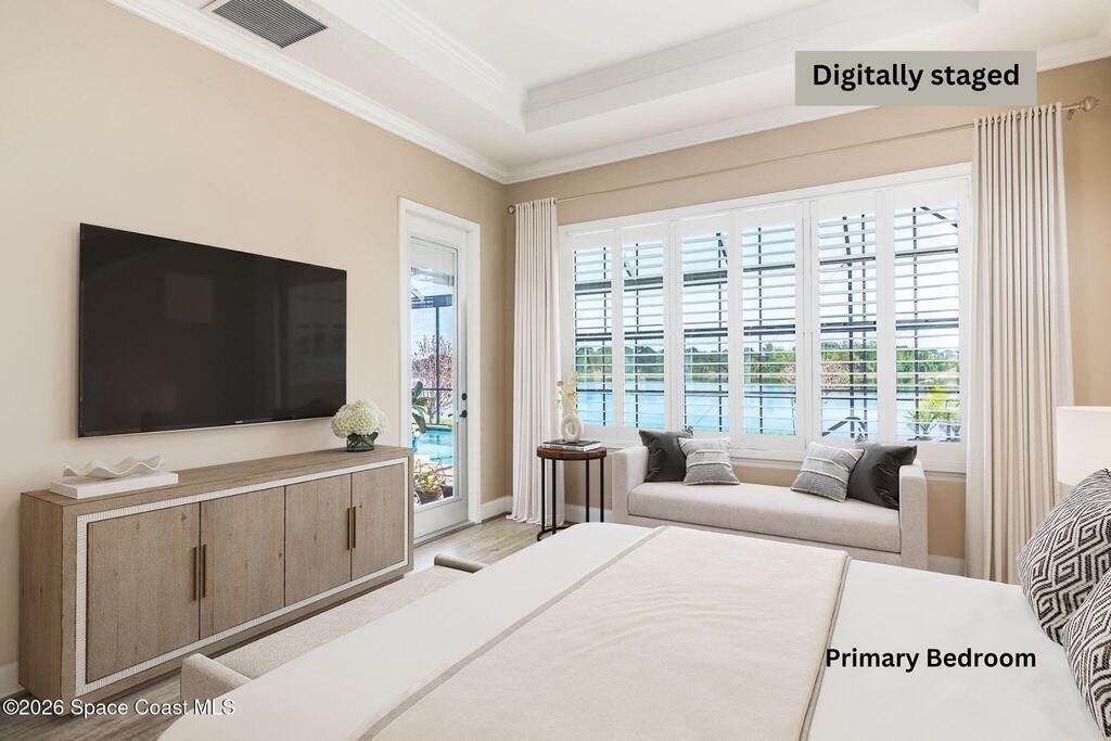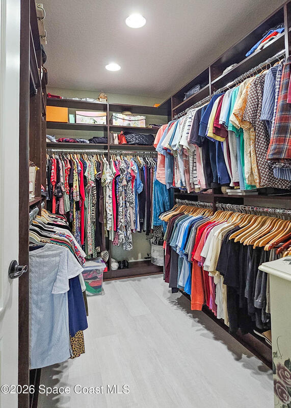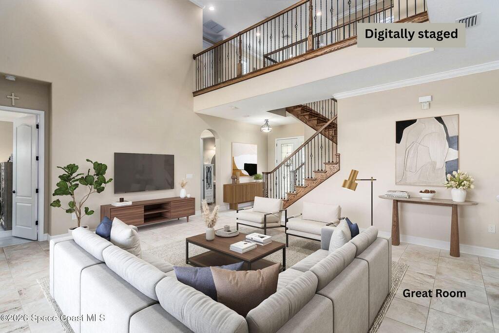 Former model home in Viera West with sweeping lake and preserve views! No rear neighbors. Outdoor oasis features a heated saltwater pool, spa, and paver deck. Inside: soaring ceilings and plantation shutters. Complete split plan with privacy for all bedrooms. 4BR/4.5BA + loft ideal for your office. Every bedroom boasts its own private bath--ideal for multi-gen living. Gourmet chef's kitchen with espresso soft-close cabinetry, granite counters, 5-burner gas range, walk-in pantry, KitchenAid SS appliances. Main-level primary suite offers panoramic water views, walk-in closet with organizers, spa bath w/ soaking tub, and ceiling-height tile shower. Upstairs: custom wrought iron railing paired with a wood handrail and stairs to loft, 2 guest BRs. 4th BR suite with separate stairs--perfect for guests, media room, or office. Main living areas feature tile flooring throughout. Oversized laundry room with cabinetry and full sink. 2-car plus golf cart garage. Near Publix, Costco, A rated school