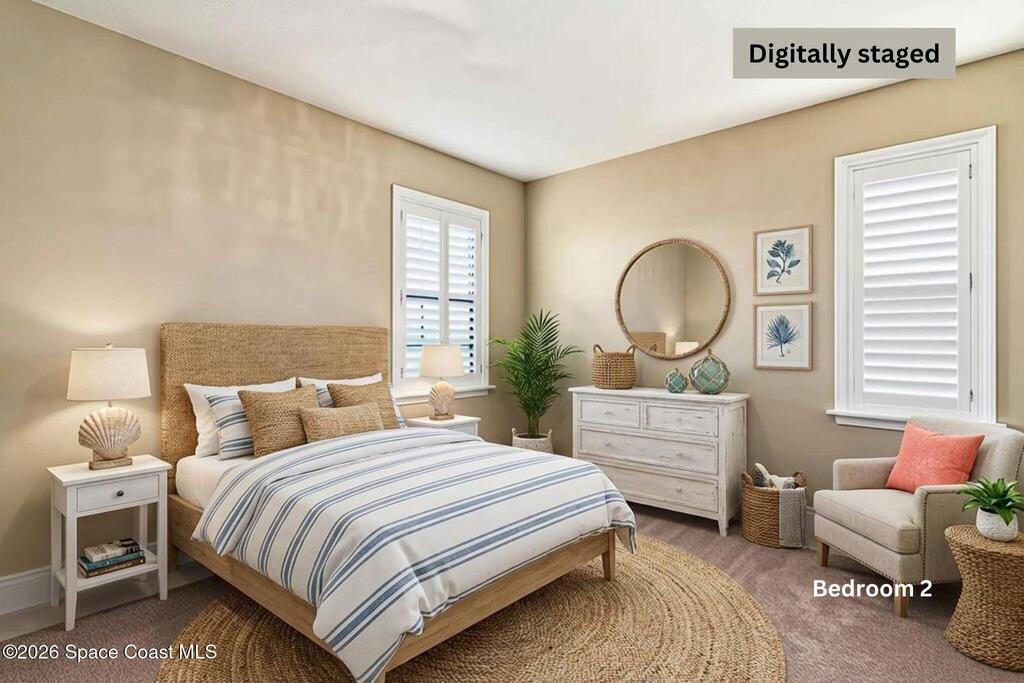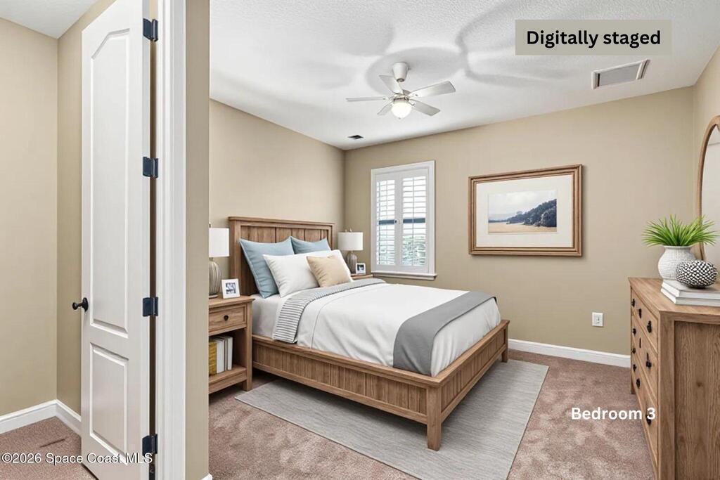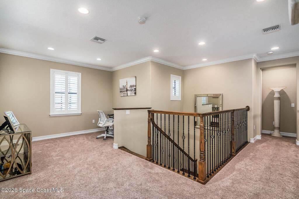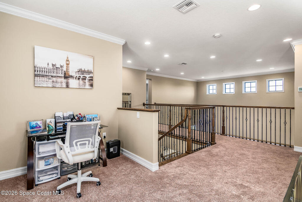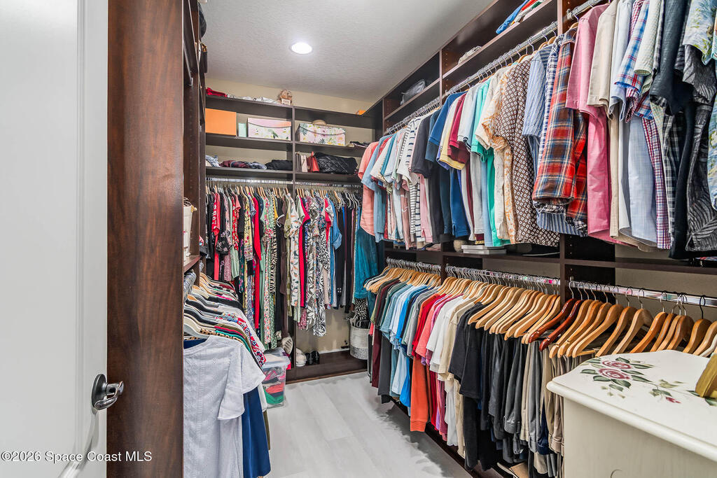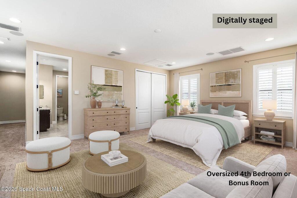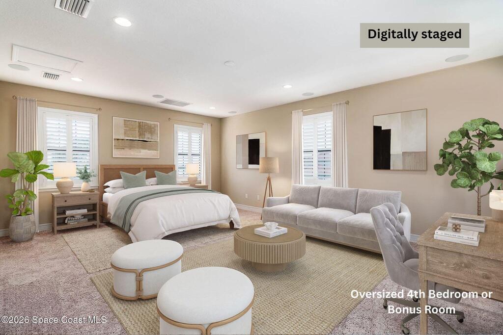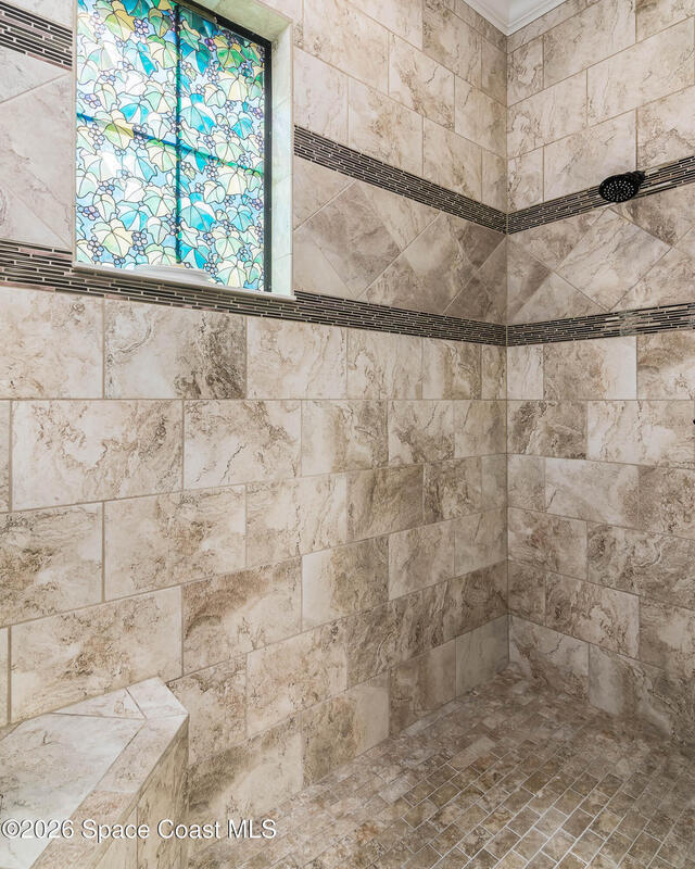 Former model home in Viera West with sweeping lake and preserve views! No rear neighbors. Outdoor oasis features a heated saltwater pool, spa, and paver deck. Inside: soaring ceilings and plantation shutters. Complete split plan with privacy for all bedrooms. 4BR/4.5BA + loft ideal for your office. Every bedroom boasts its own private bath--ideal for multi-gen living. Gourmet chef's kitchen with espresso soft-close cabinetry, granite counters, 5-burner gas range, walk-in pantry, KitchenAid SS appliances. Main-level primary suite offers panoramic water views, walk-in closet with organizers, spa bath w/ soaking tub, and ceiling-height tile shower. Upstairs: custom wrought iron railing paired with a wood handrail and stairs to loft, 2 guest BRs. 4th BR suite with separate stairs--perfect for guests, media room, or office. Main living areas feature tile flooring throughout. Oversized laundry room with cabinetry and full sink. 2-car plus golf cart garage. Near Publix, Costco, A rated school