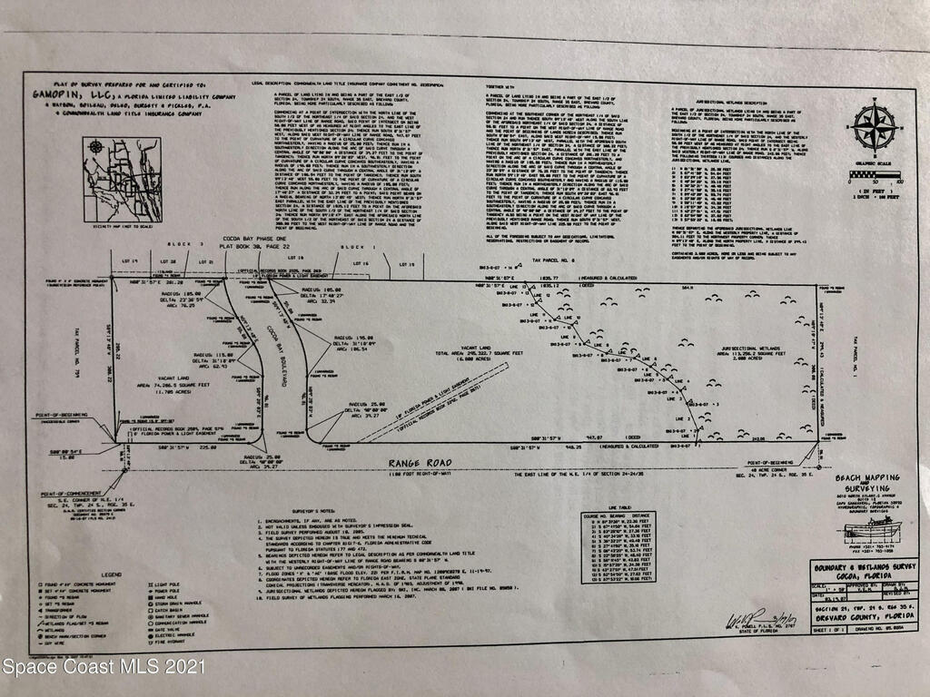 Land development opportunity in a growing area near Eastern Florida State College Cocoa Campus. BRING ALL OFFERS Currently zoned Neighborhood/Commercial (CN). Contact City of Cocoa for specific allowable uses. LOCATED ALONG RANGE ROAD, LOT DIVIDED BY COCOA BAY BLVD. Excellent development opportunity. Some wetlands located in Northwest section of property. See attached survey(s) and reports.EAST OF I-95, SOUTH OF SR-524, WEST OF US-1 ON RANGE ROAD.